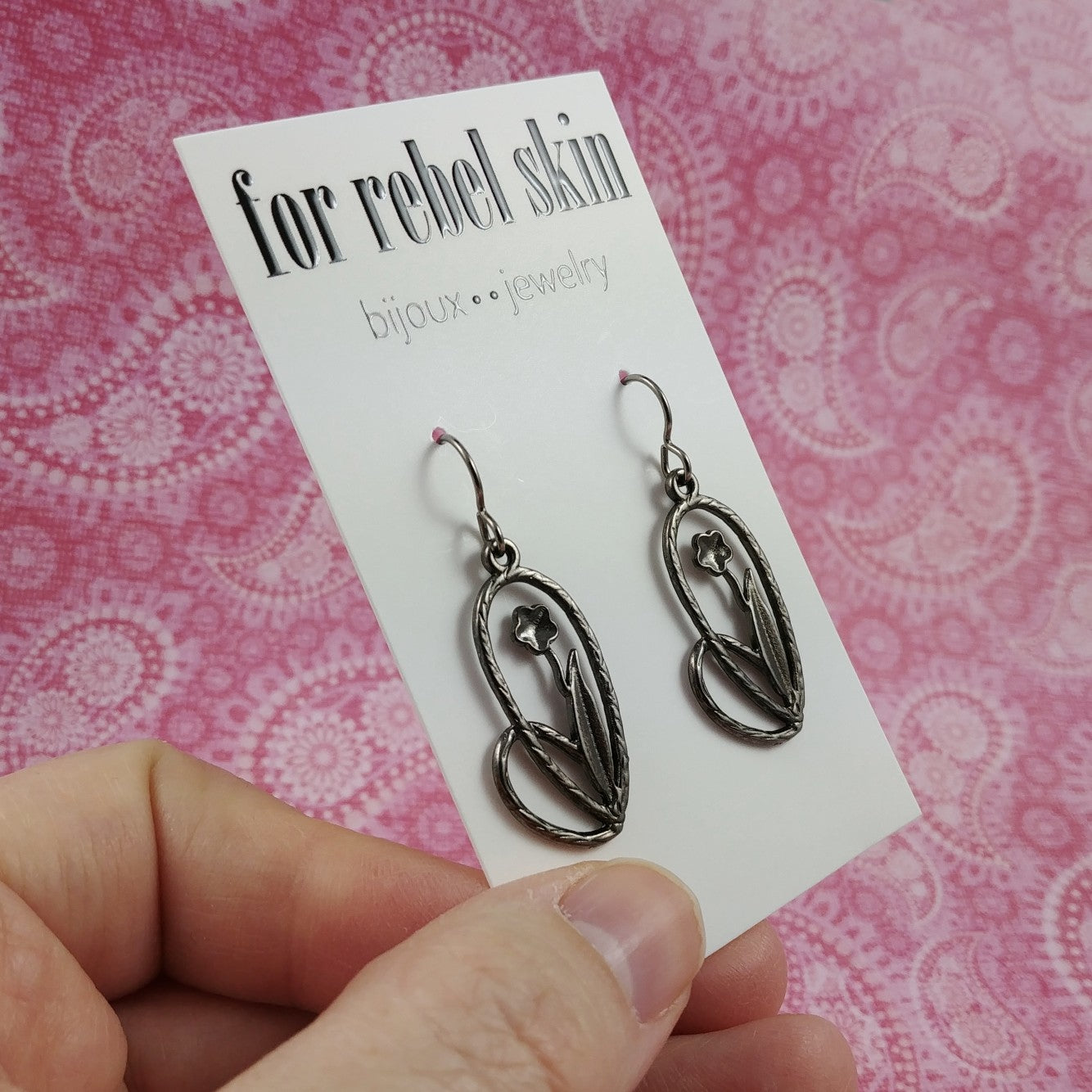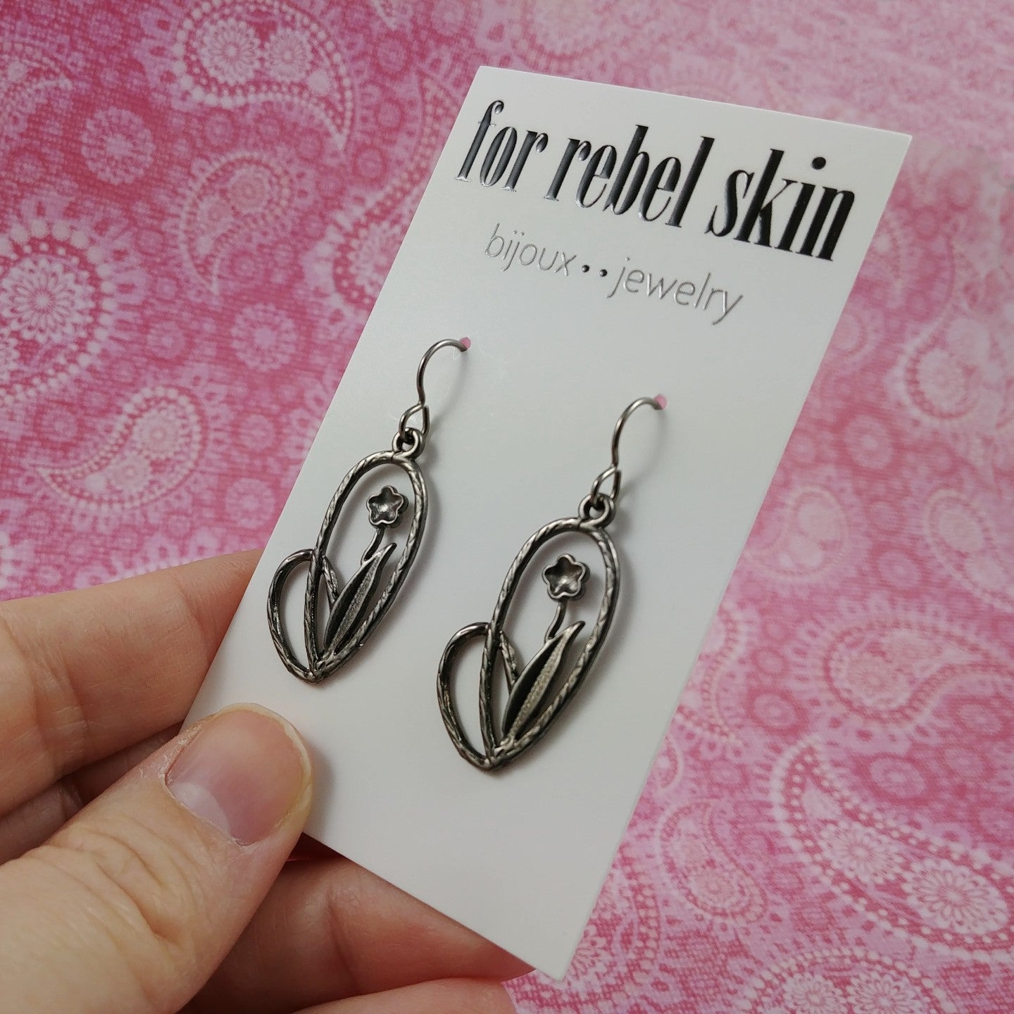 A unique drop earrings! Featuring gunmetal flower and oval pattern pendants.
