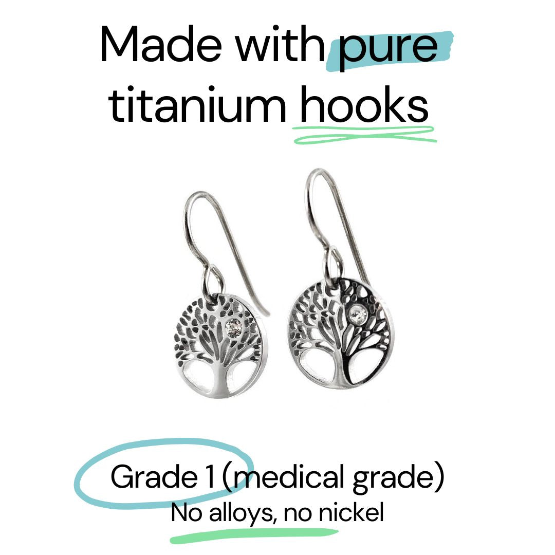 These earrings are extremely safe to wear. Assembled with pure titanium ear wires (grade 1, made in USA). Commercially pure titanium grade 1 is pure: no alloy, no nickel. It is 100% hypoallergenic and will not produce skin irritation. Titanium doesn’t discolor or tarnish even when worn by people with high acid levels in their skin.