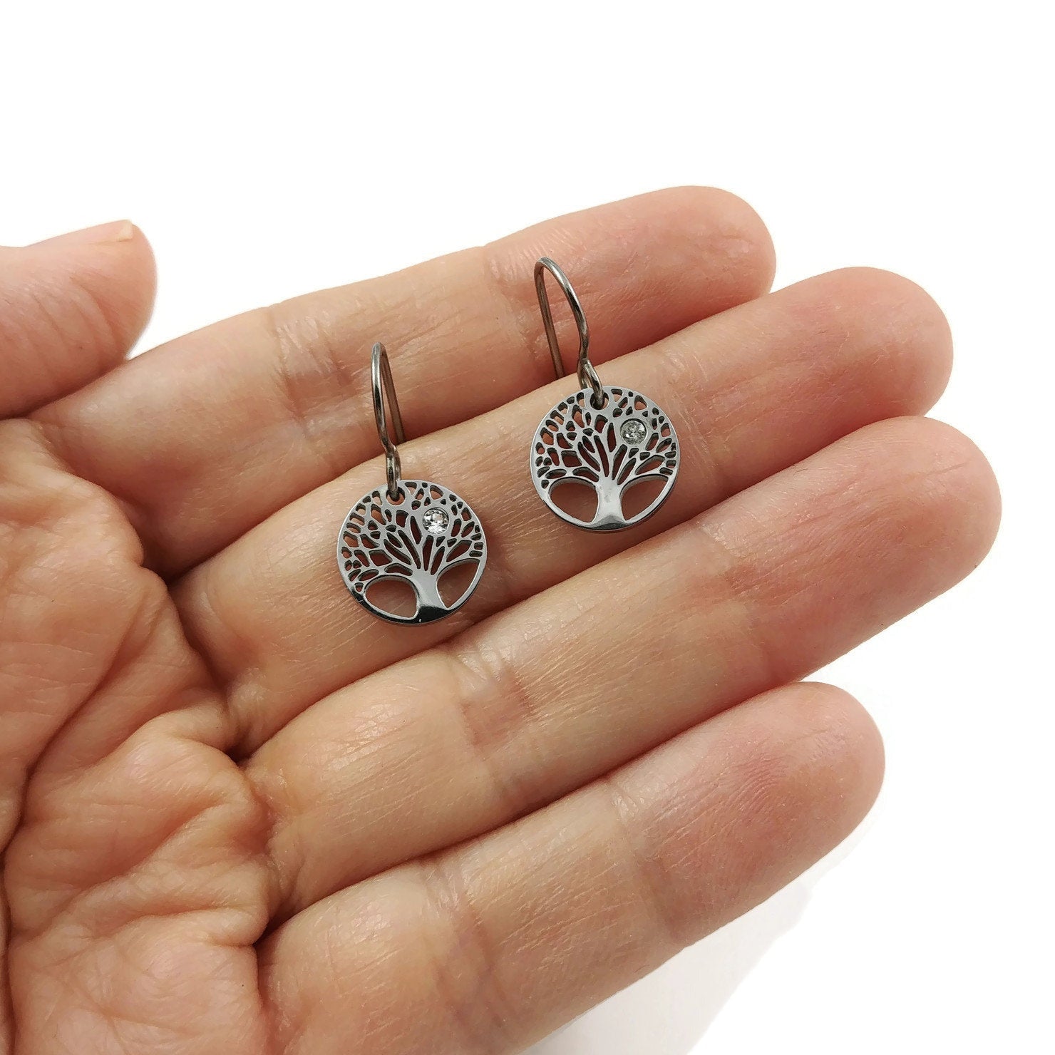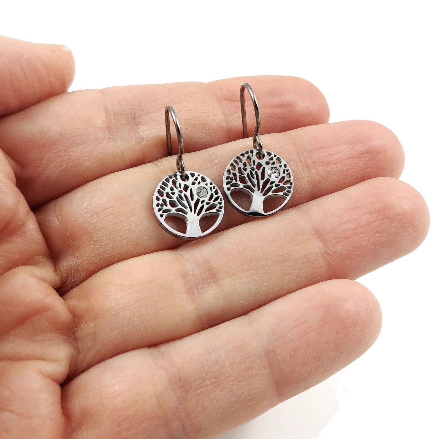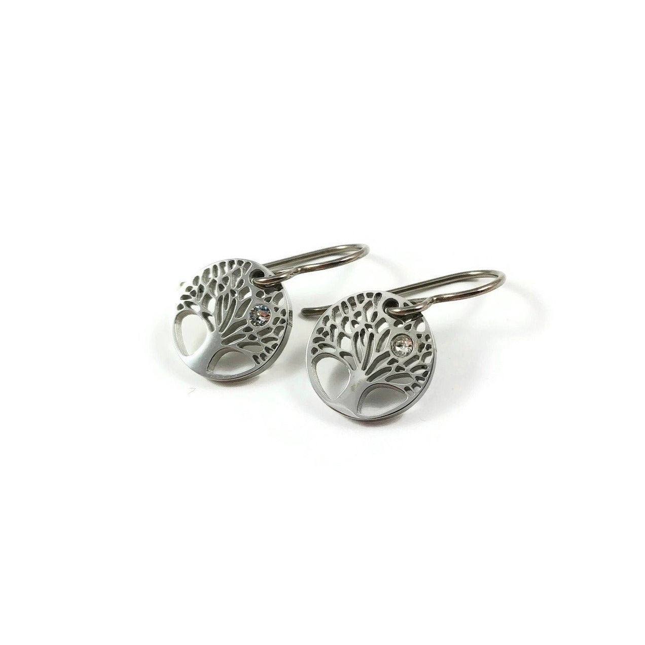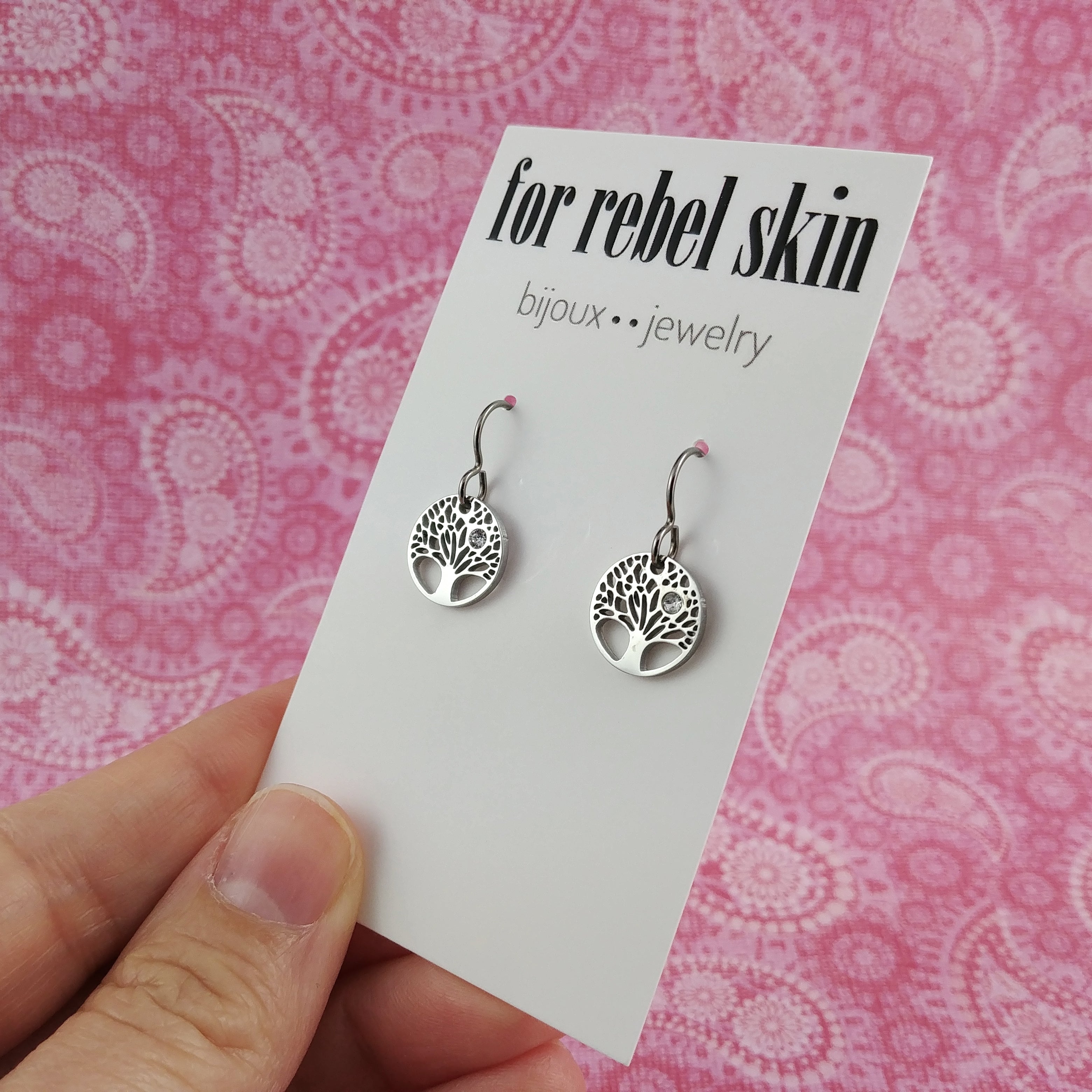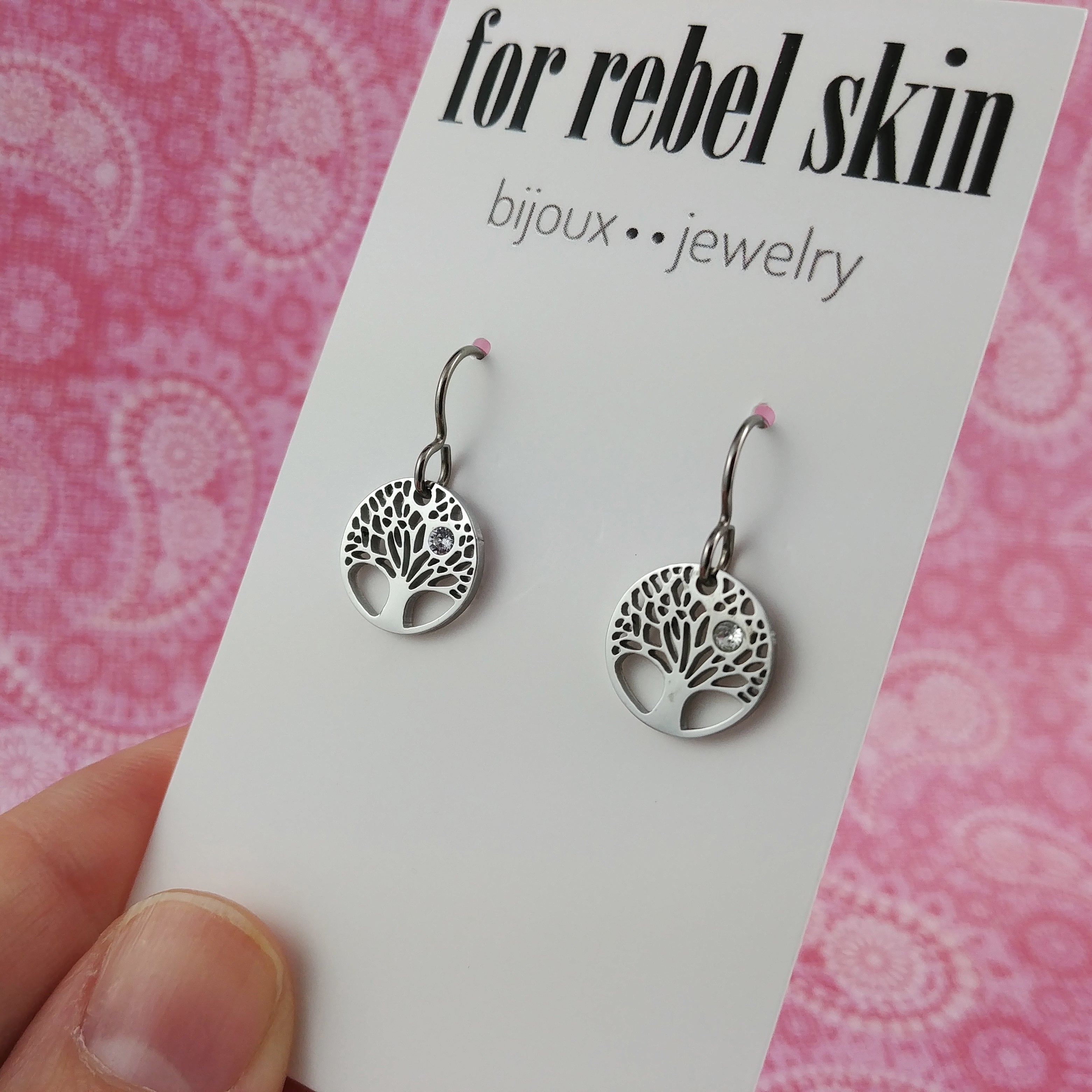 Gorgeous little drop earrings... featuring a stainless steel tree pendants with cubic zirconia.