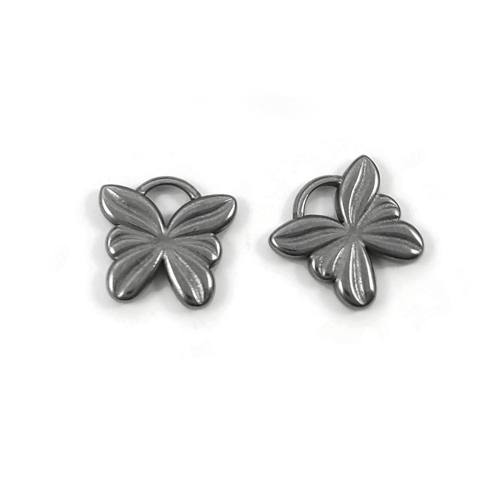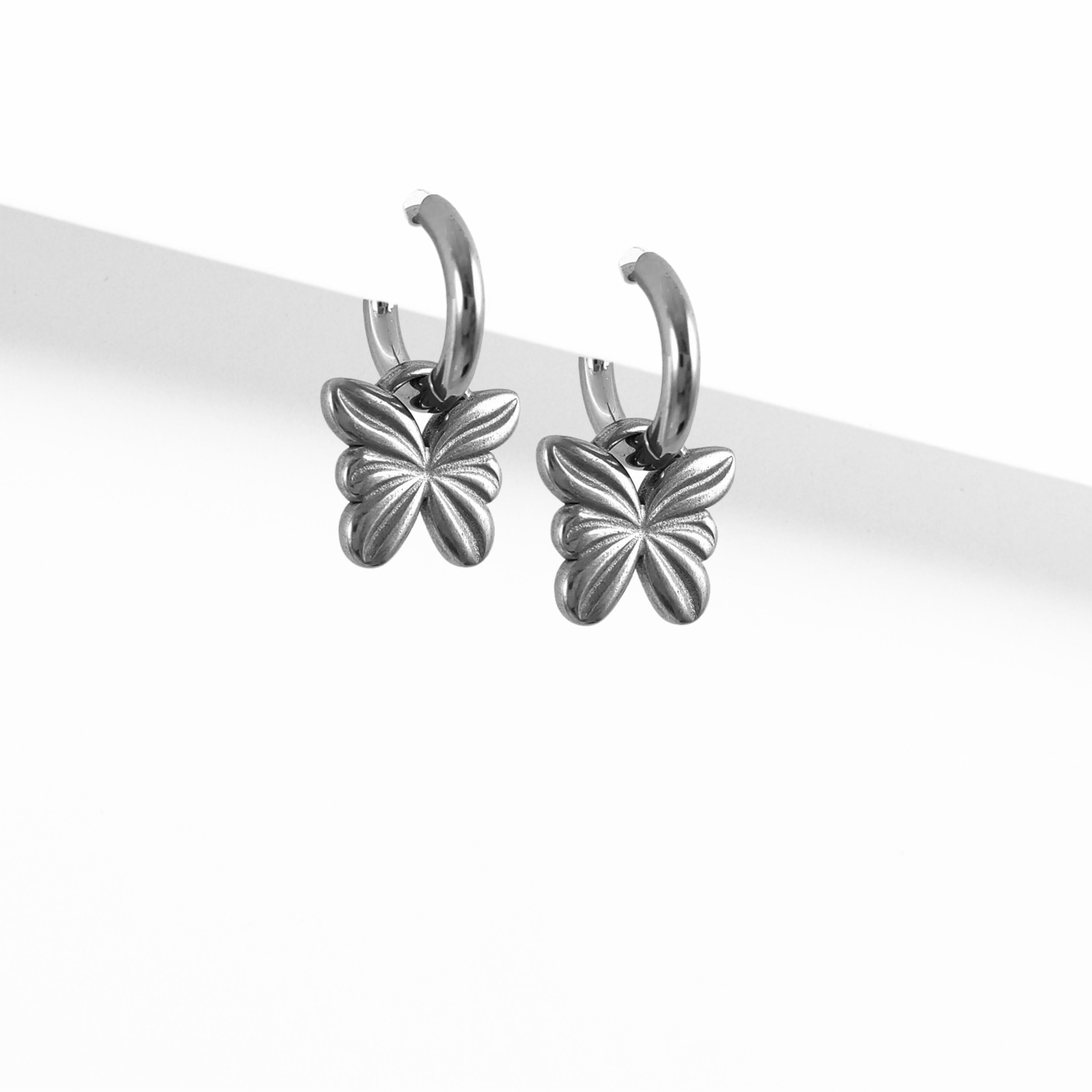 Pure natural titanium huggie hoop earrings, with lovely stainless steel butterfly charms. Sold as a pair.