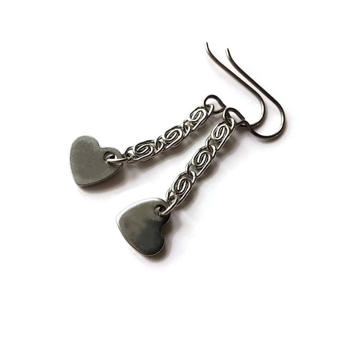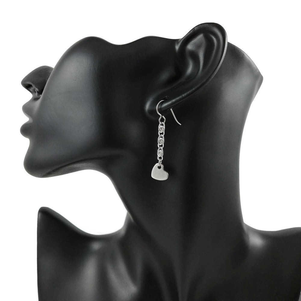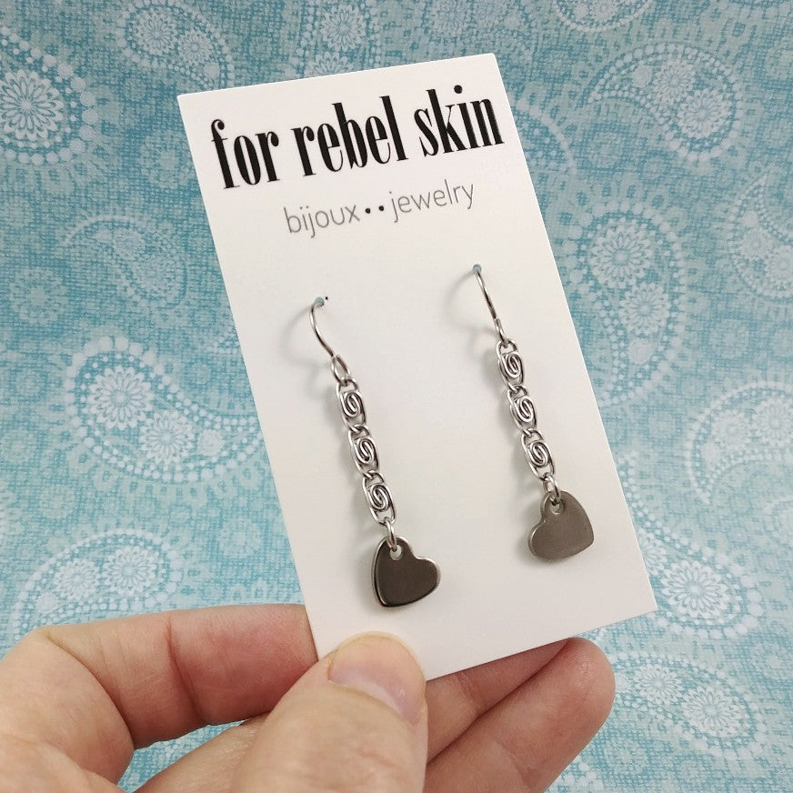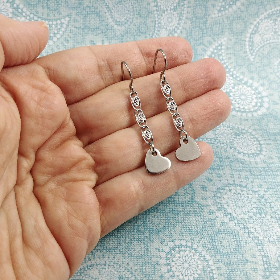 Length: 32 mm (1.25''). Stainless steel heart charms measuring approx. 3/8" (10 x 9mm). Silicone earnuts included.