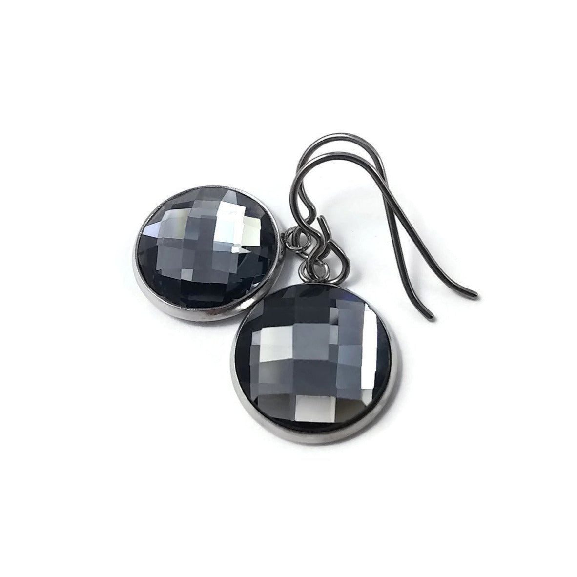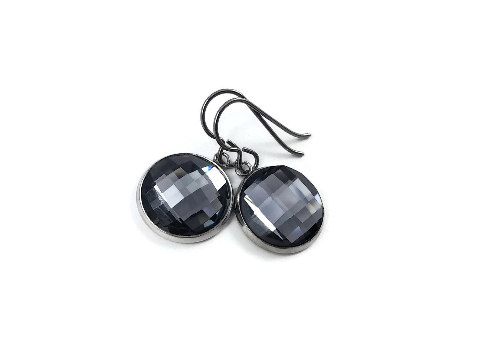 Grey rhinestone faceted dangle titanium earrings