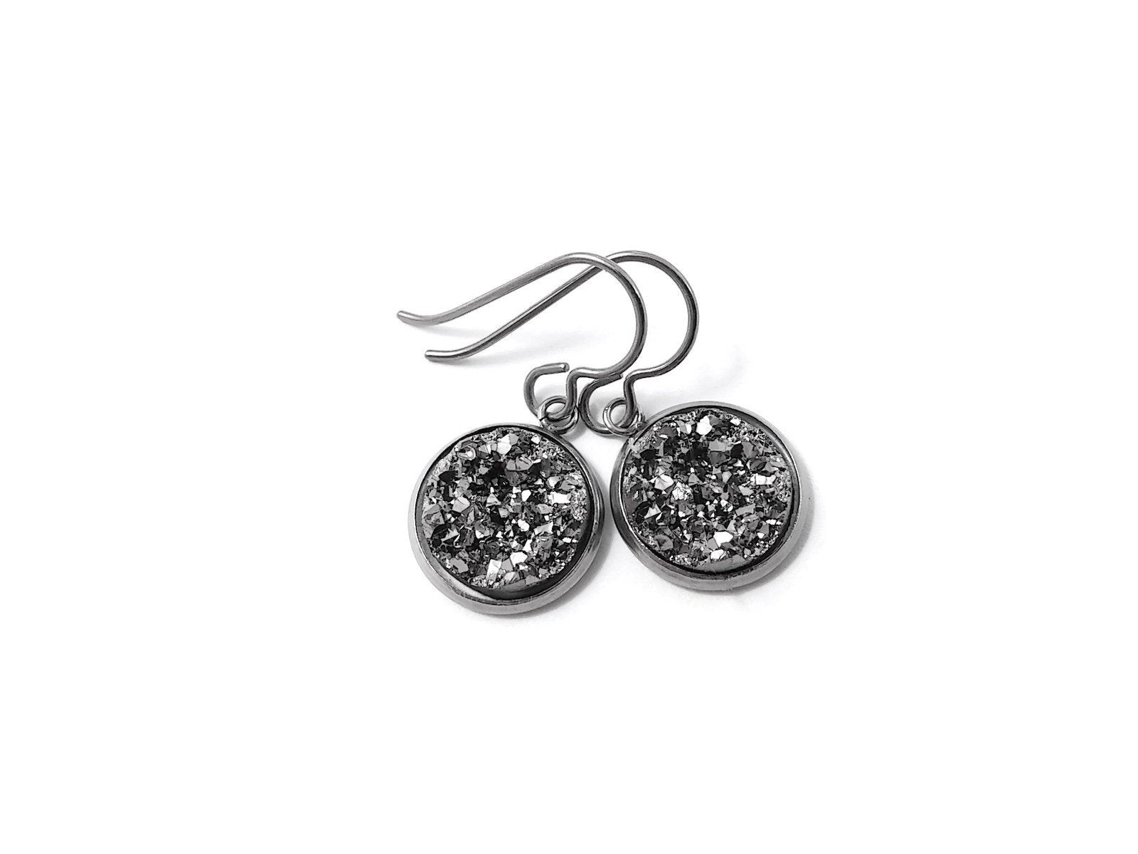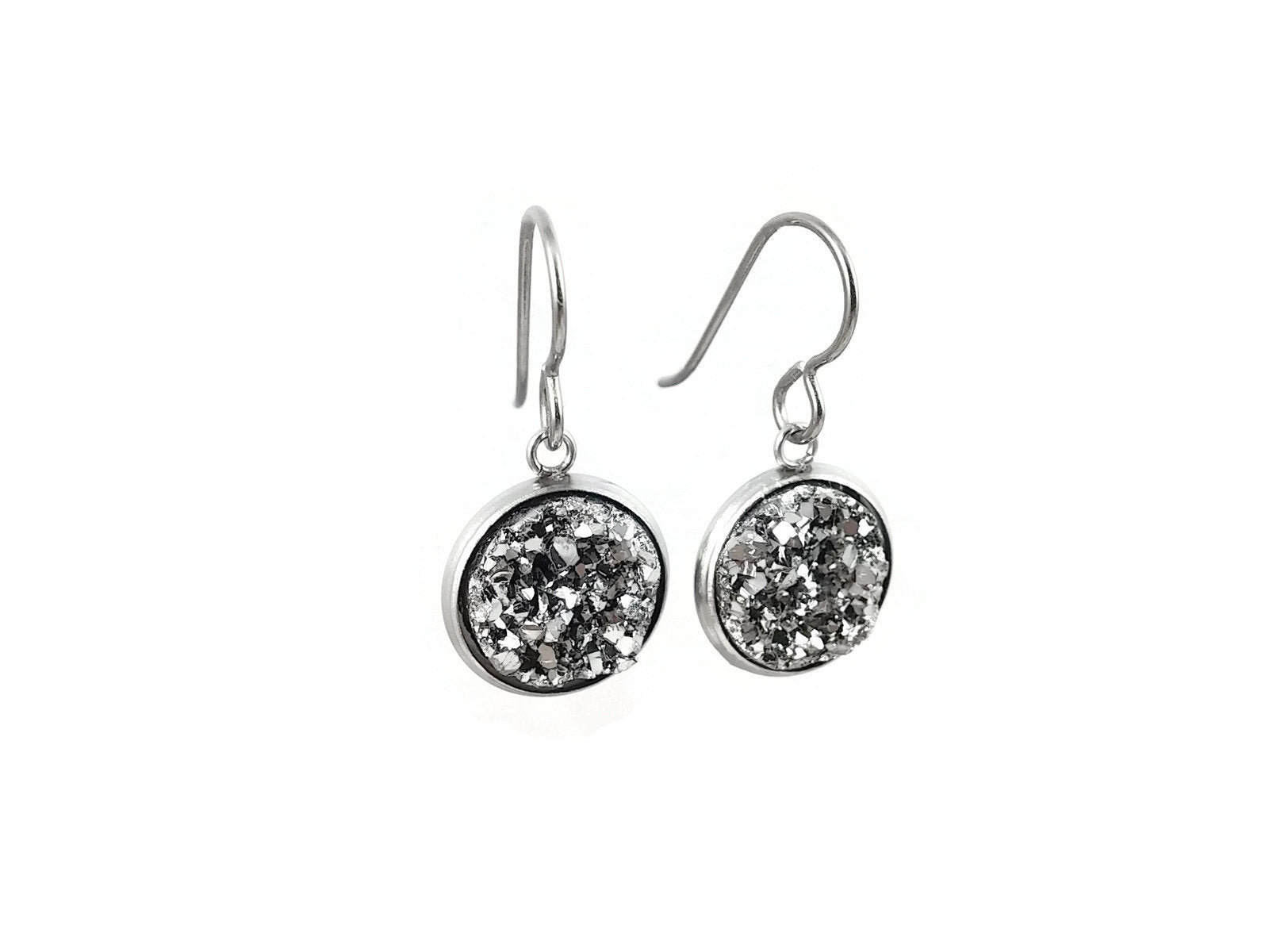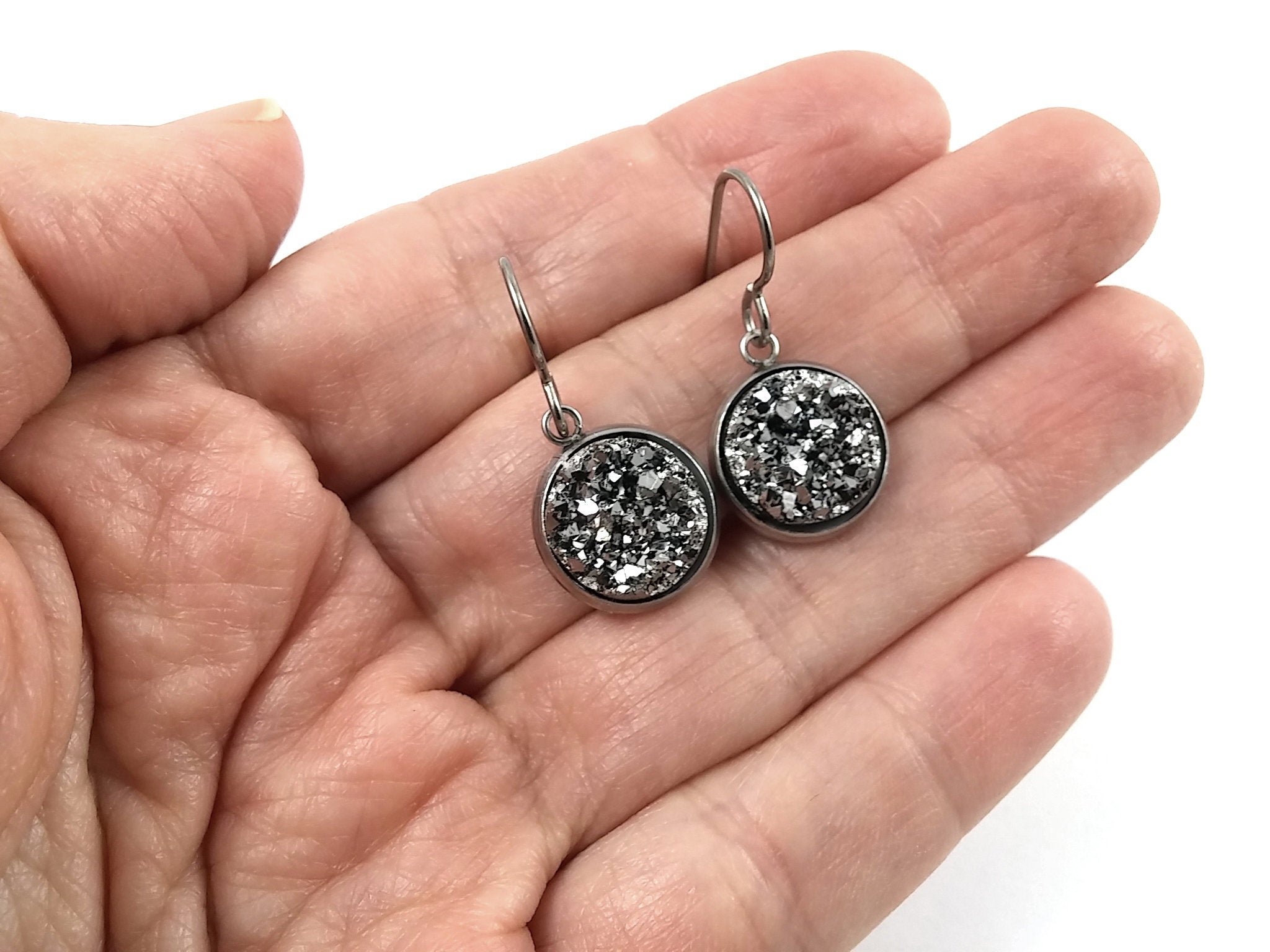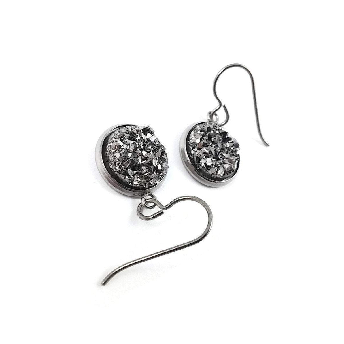 Silver druzy dangle earrings. Hypoallergenic pure titanium, stainless steel and acrylic druzy jewelry.