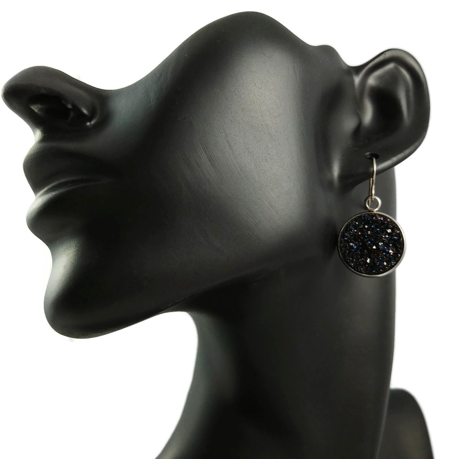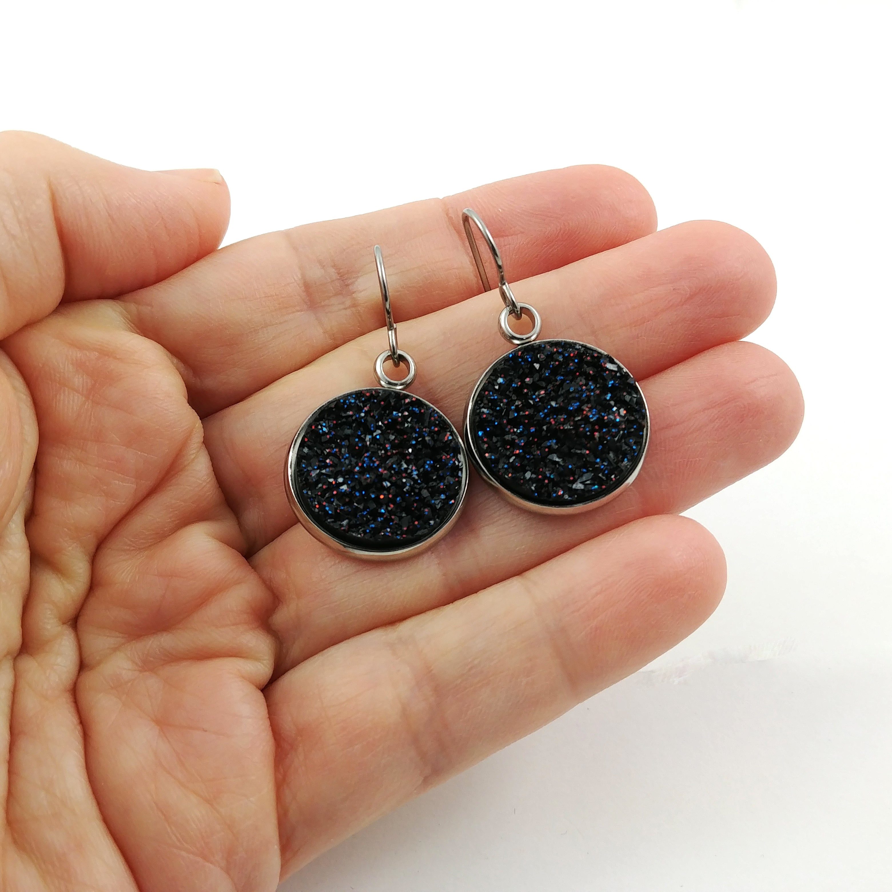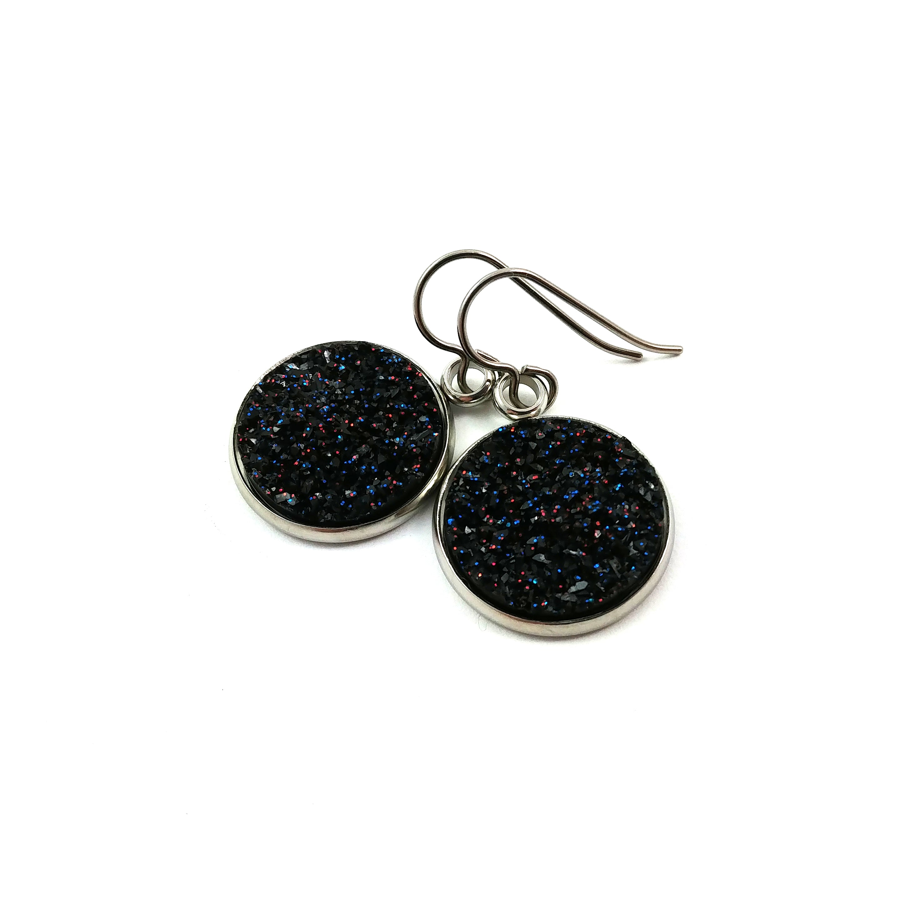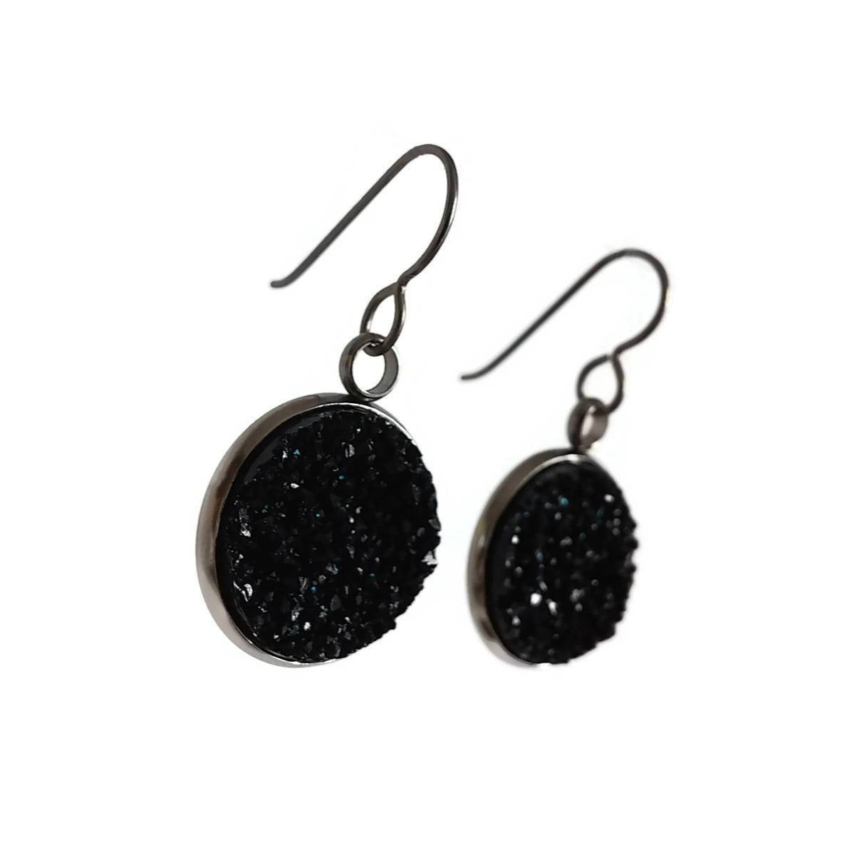 Midnight black druzy dangle earrings. Hypoallergenic pure titanium, stainless steel and acrylic druzy jewelry.