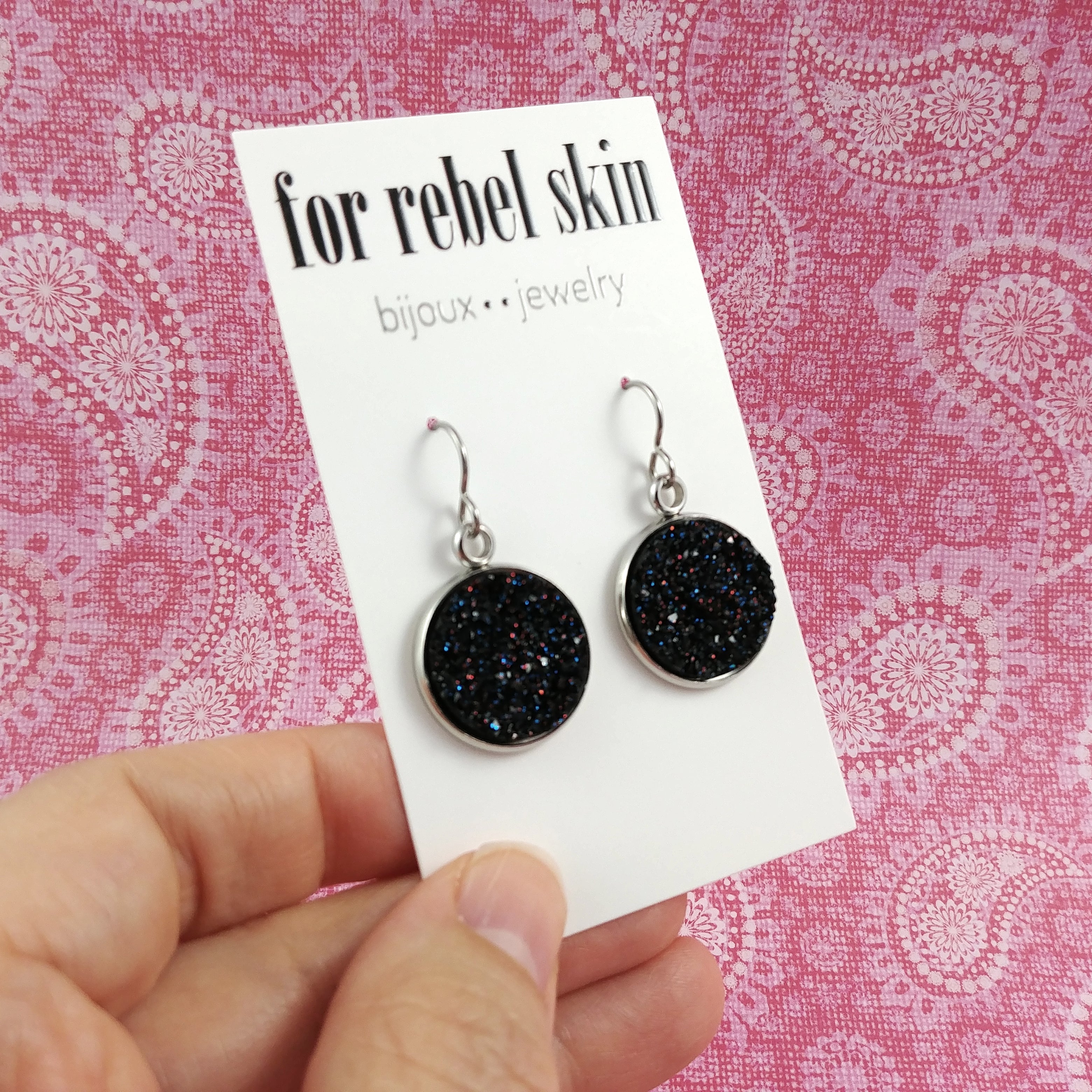 So beautiful earrings! You'll want to wear them every day. Very fashionable with these black druzy cabochons with blue and red sparkles. An alternative to real druzies, they are made out of acrylic resin. Securely glued on stainless steel dangling backings. Assembled with pure titanium ear wires. Titanium is 100% hypoallergenic.