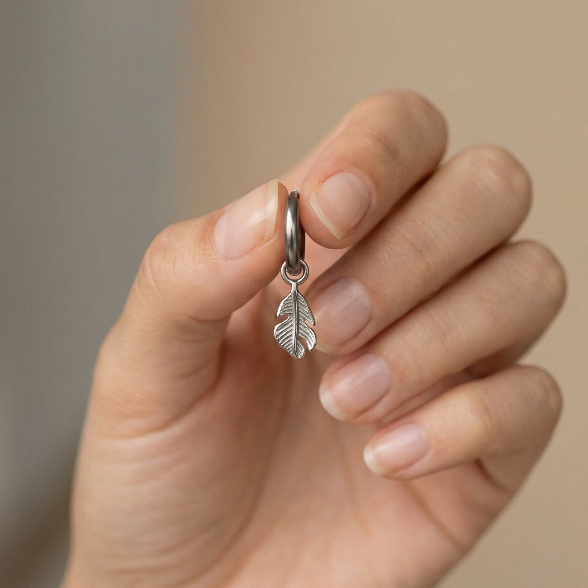Pure natural titanium huggie hoop earrings, with lovely stainless steel feather charms. Sold as a pair.