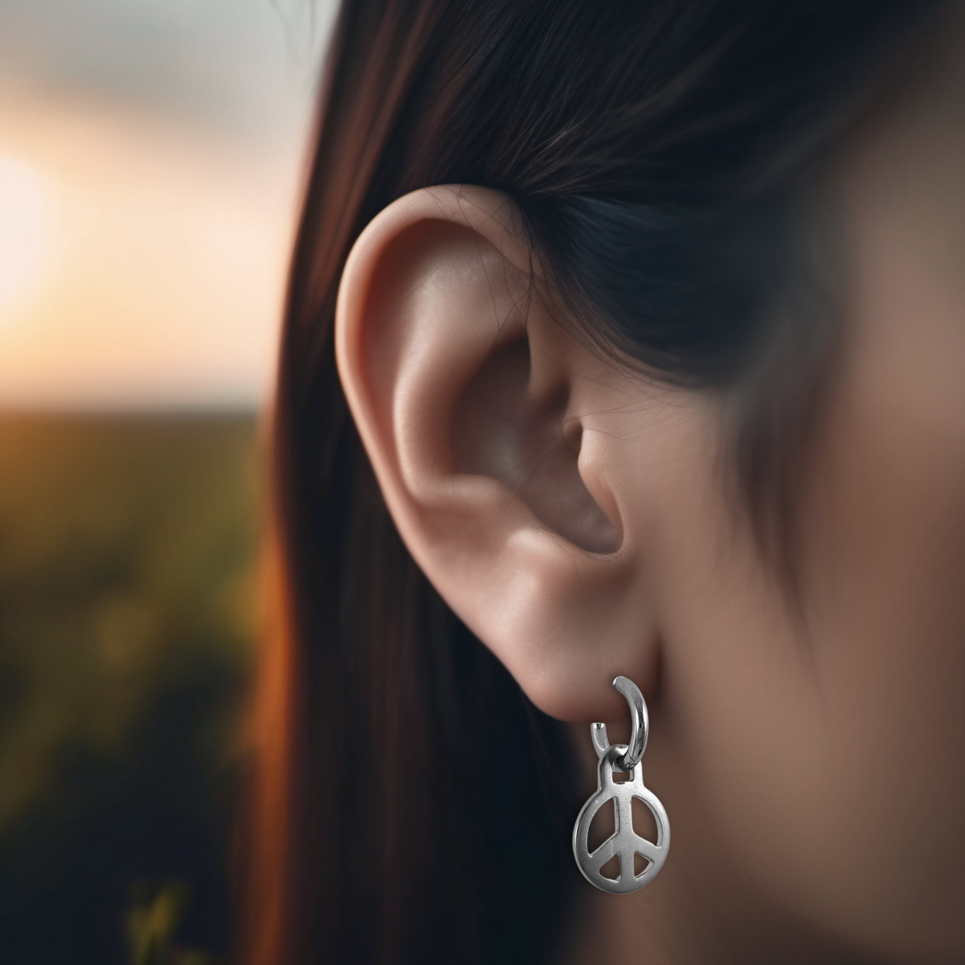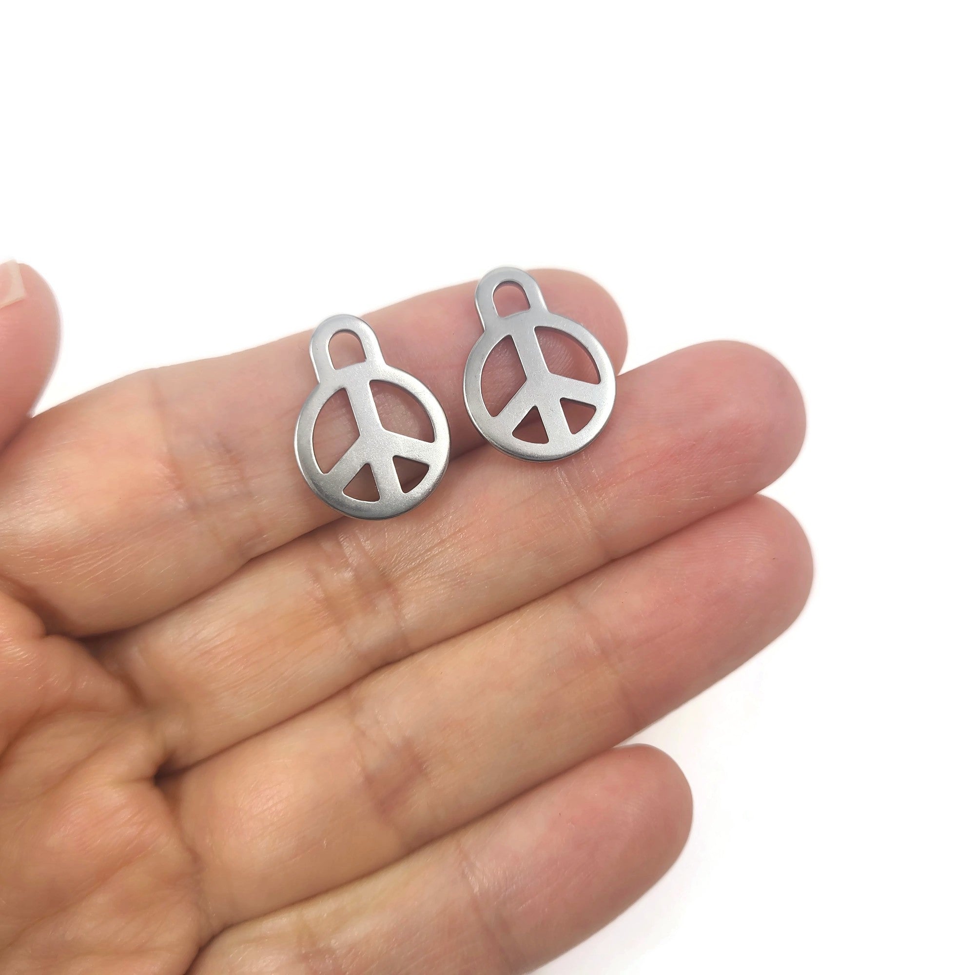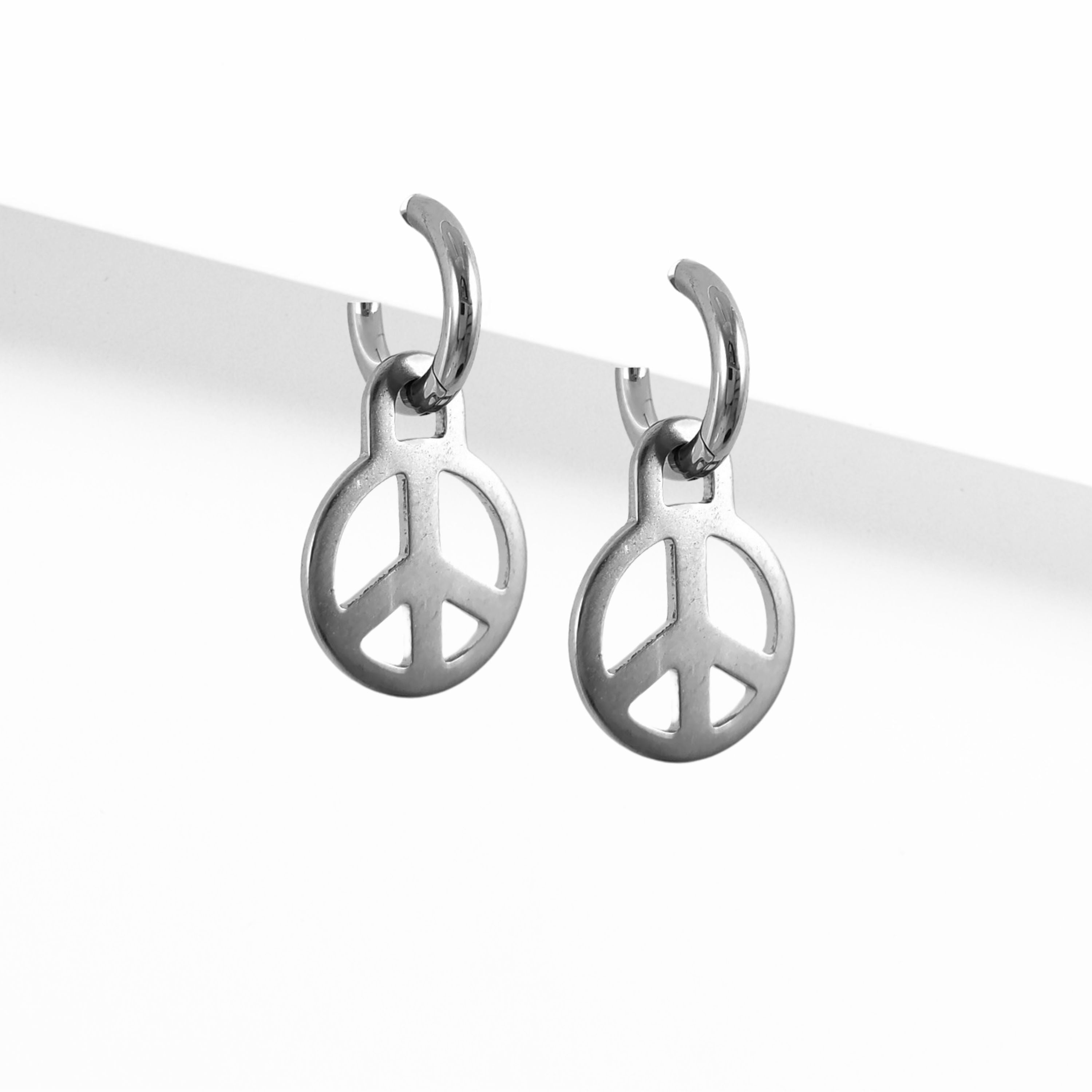 Pure natural titanium huggie hoop earrings, with lovely stainless steel peace charms. Sold as a pair.