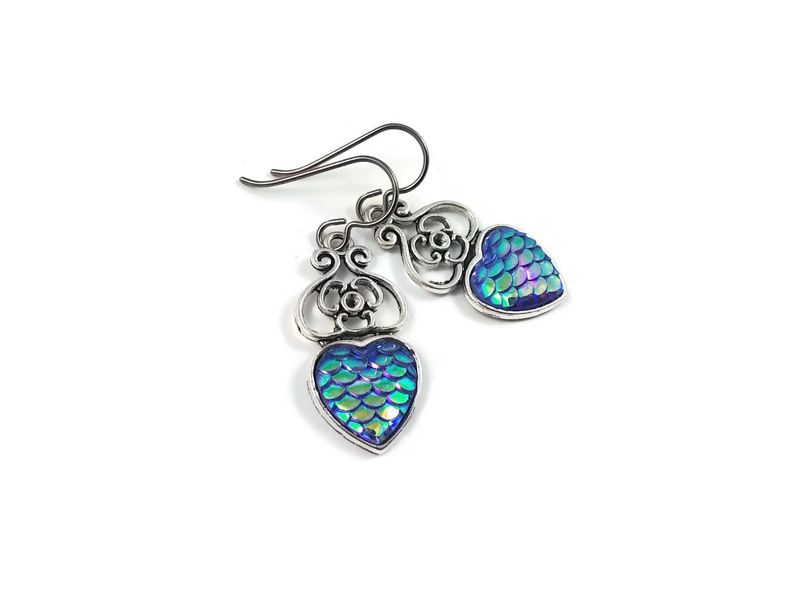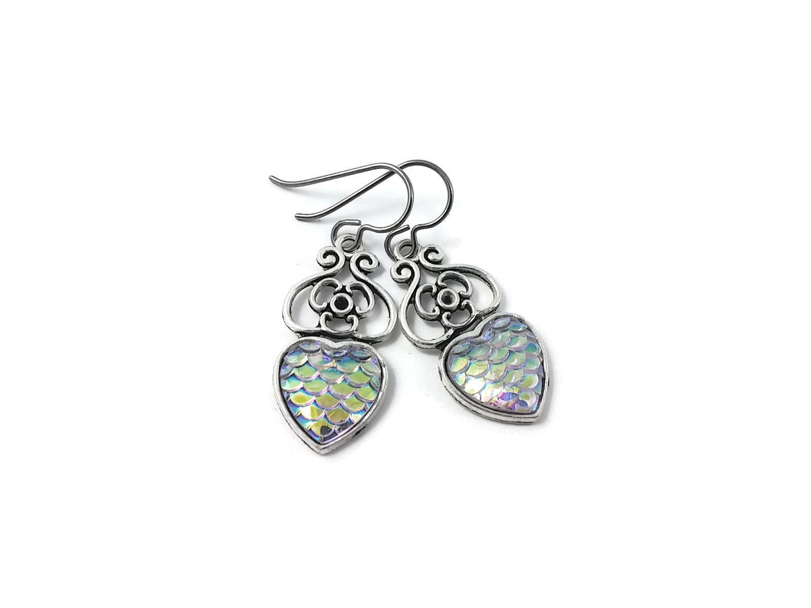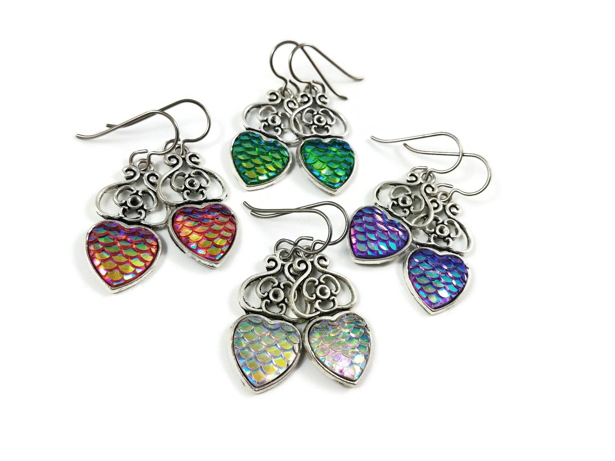 A dreamy earrings! You'll want to wear them every day. Very fashionable with this mermaid fish /dragon scale heart pendant.