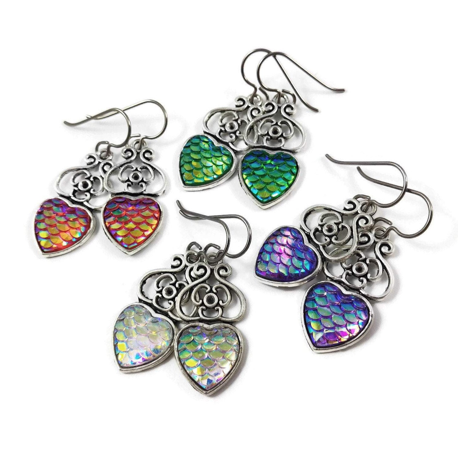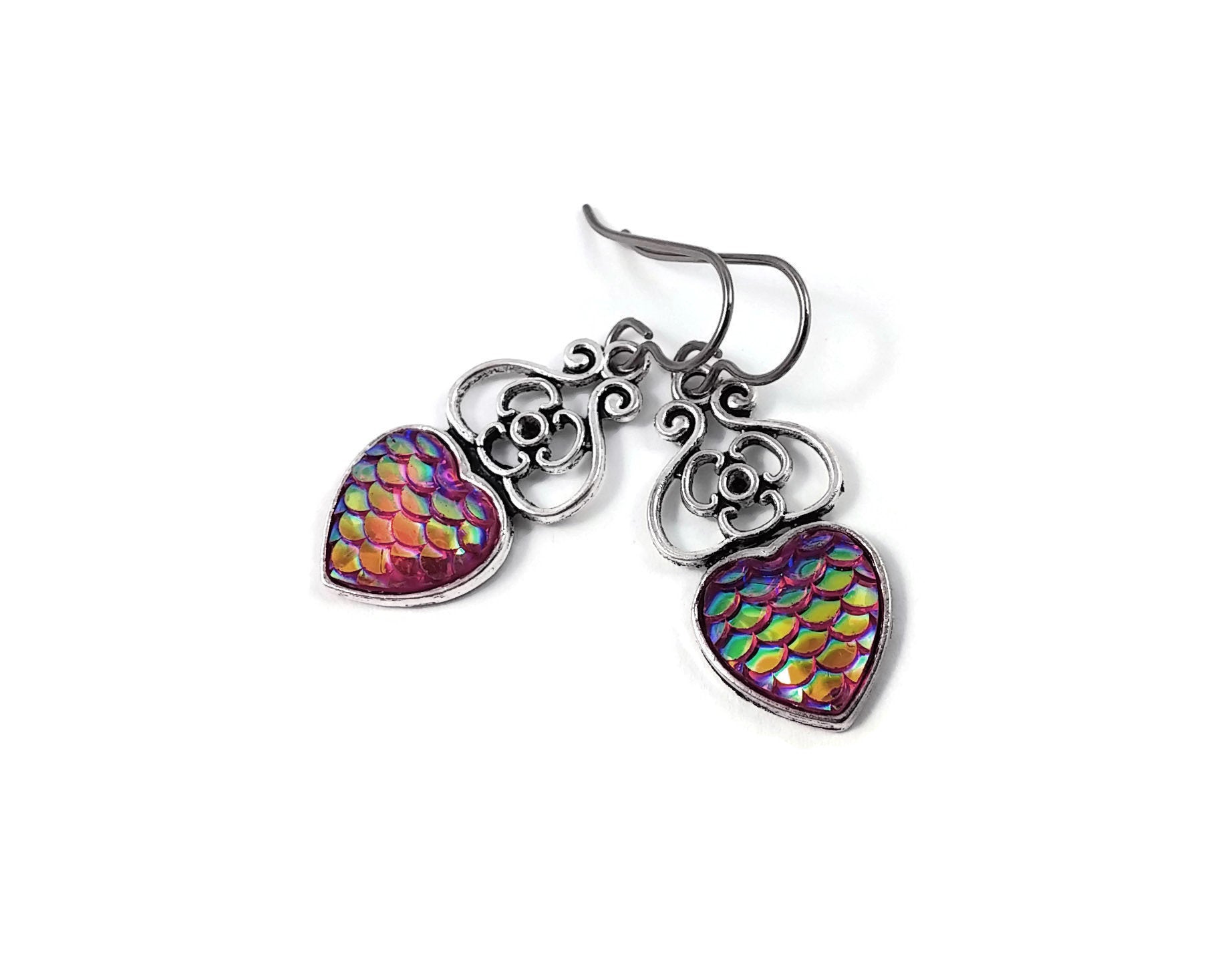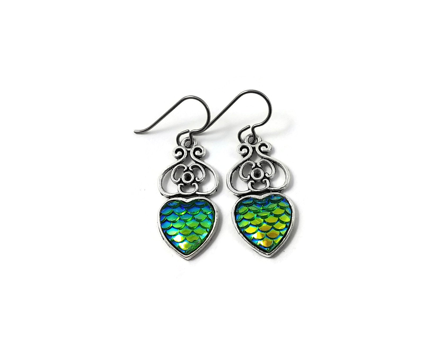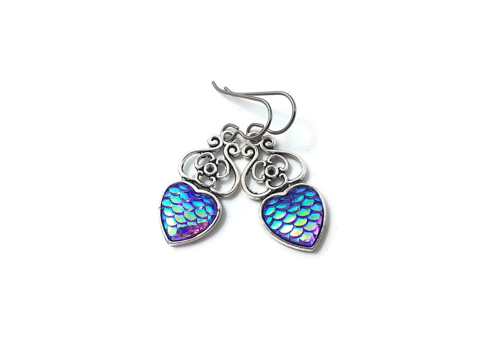 A dreamy earrings! You'll want to wear them every day. Very fashionable with this mermaid fish /dragon scale heart pendant.