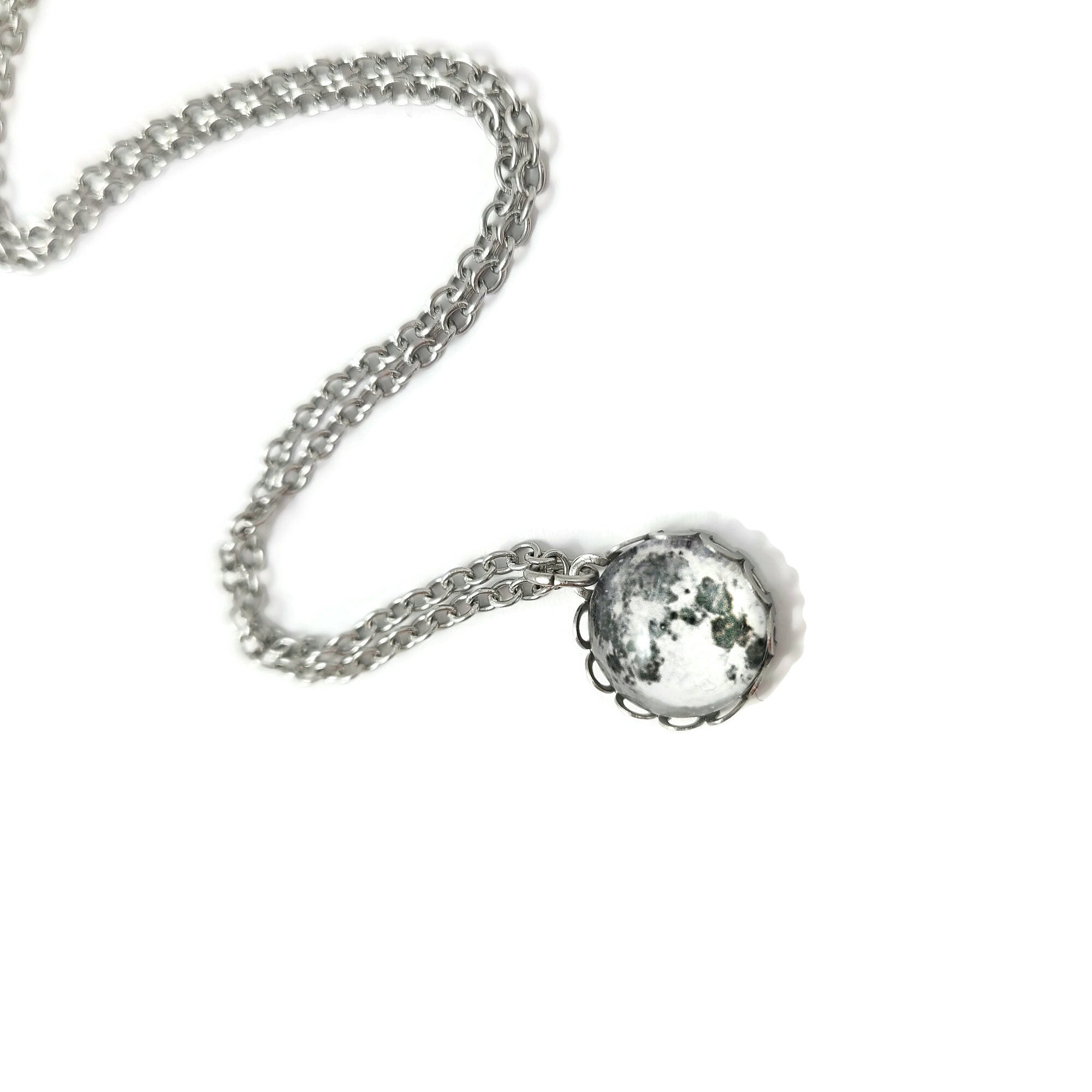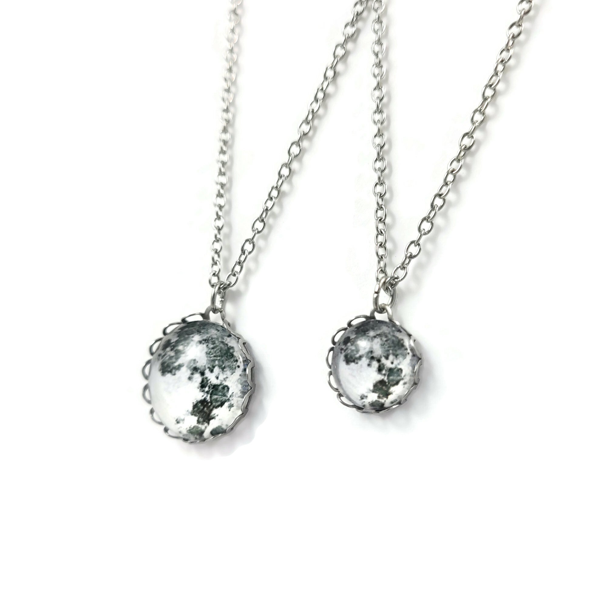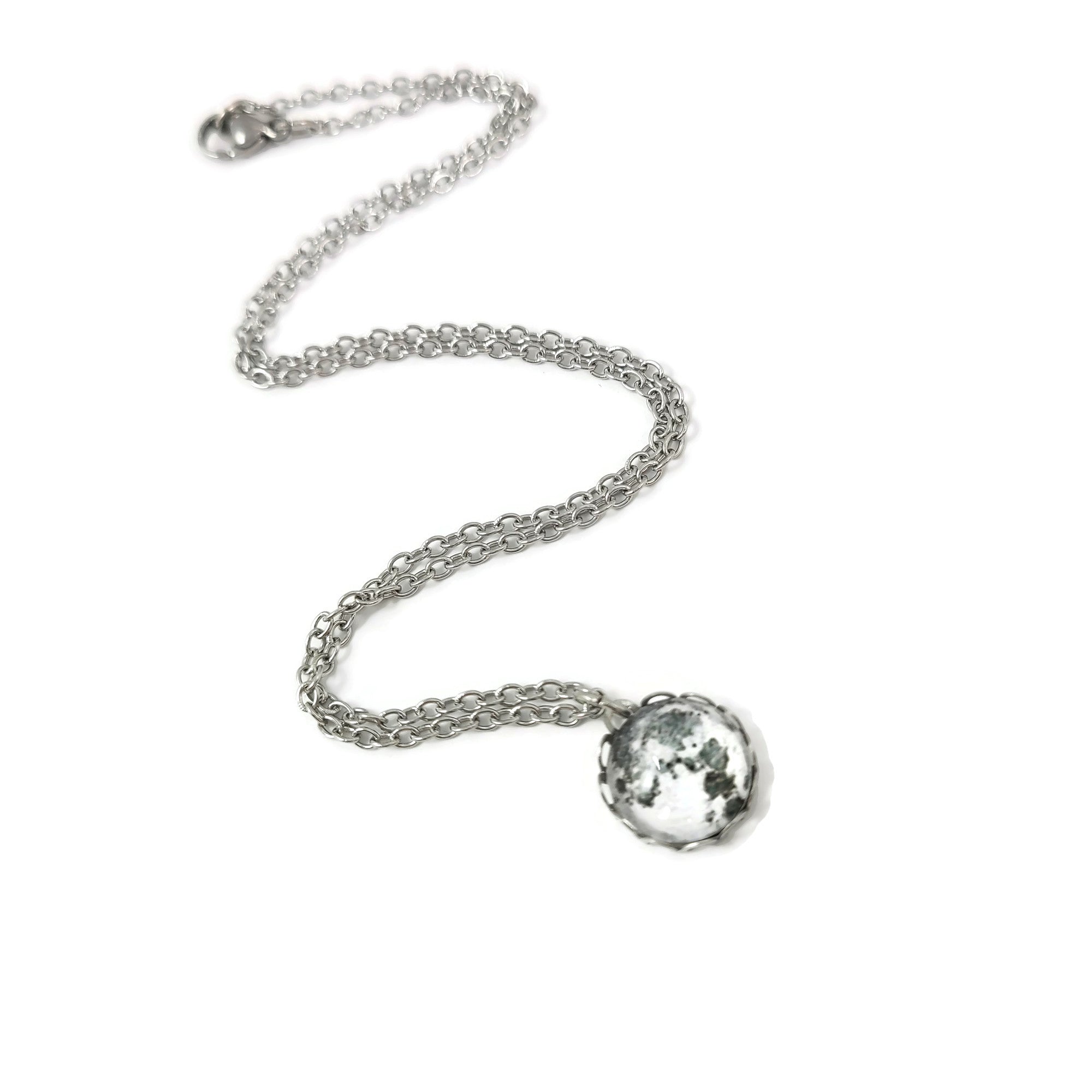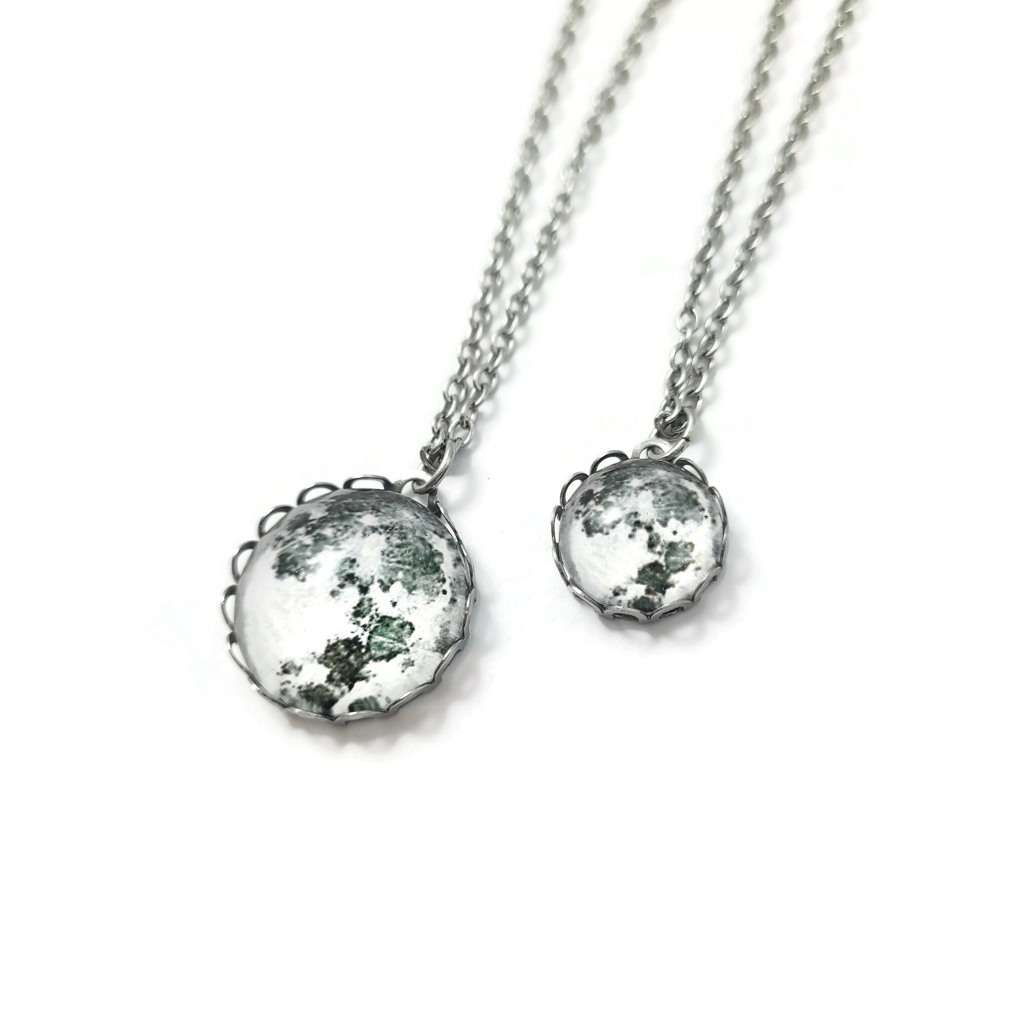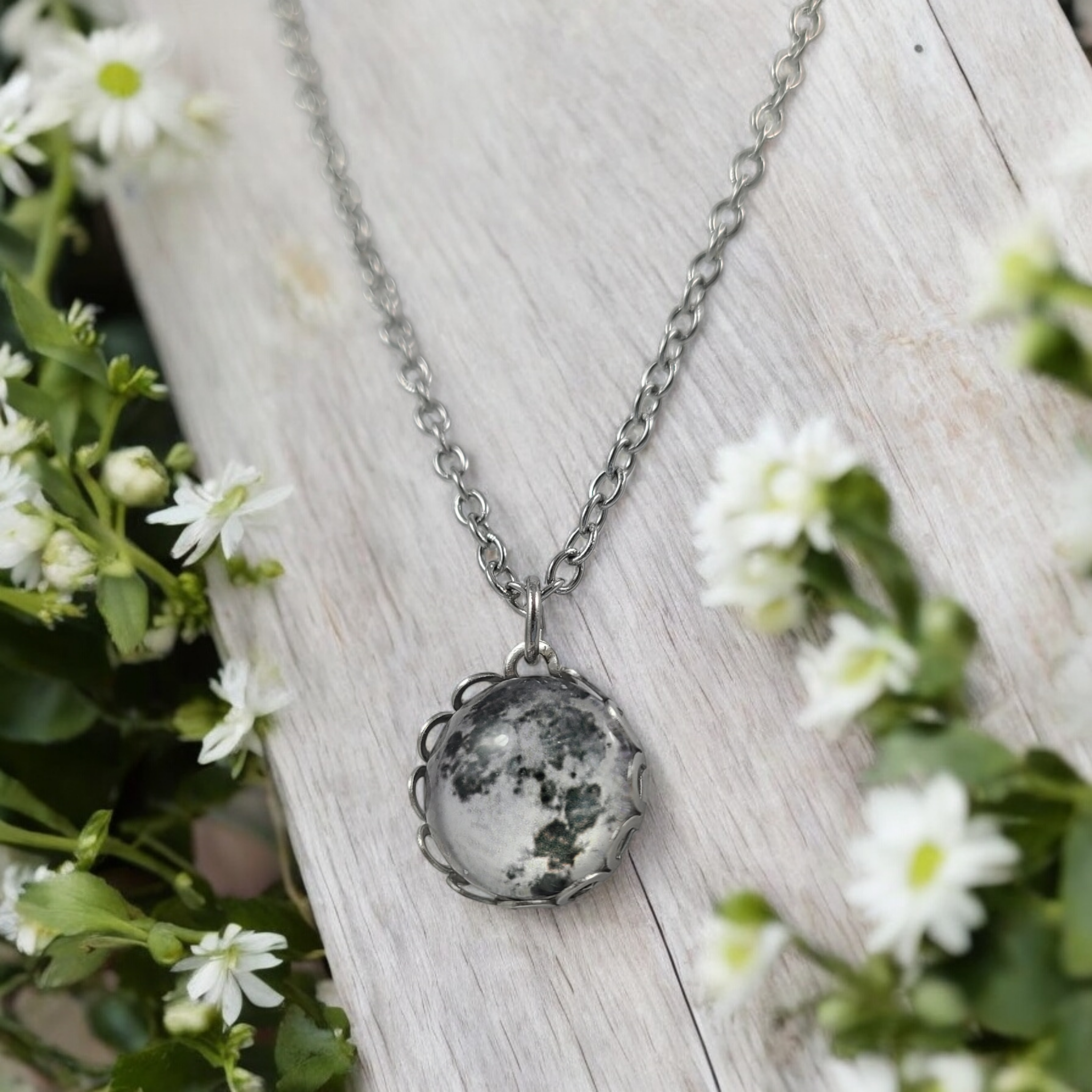The pendant features stunning moon cabochons, expertly fashioned from glass to capture the ethereal beauty of a full moon. These shimmering moons are securely adhered to chic 316 stainless steel backings