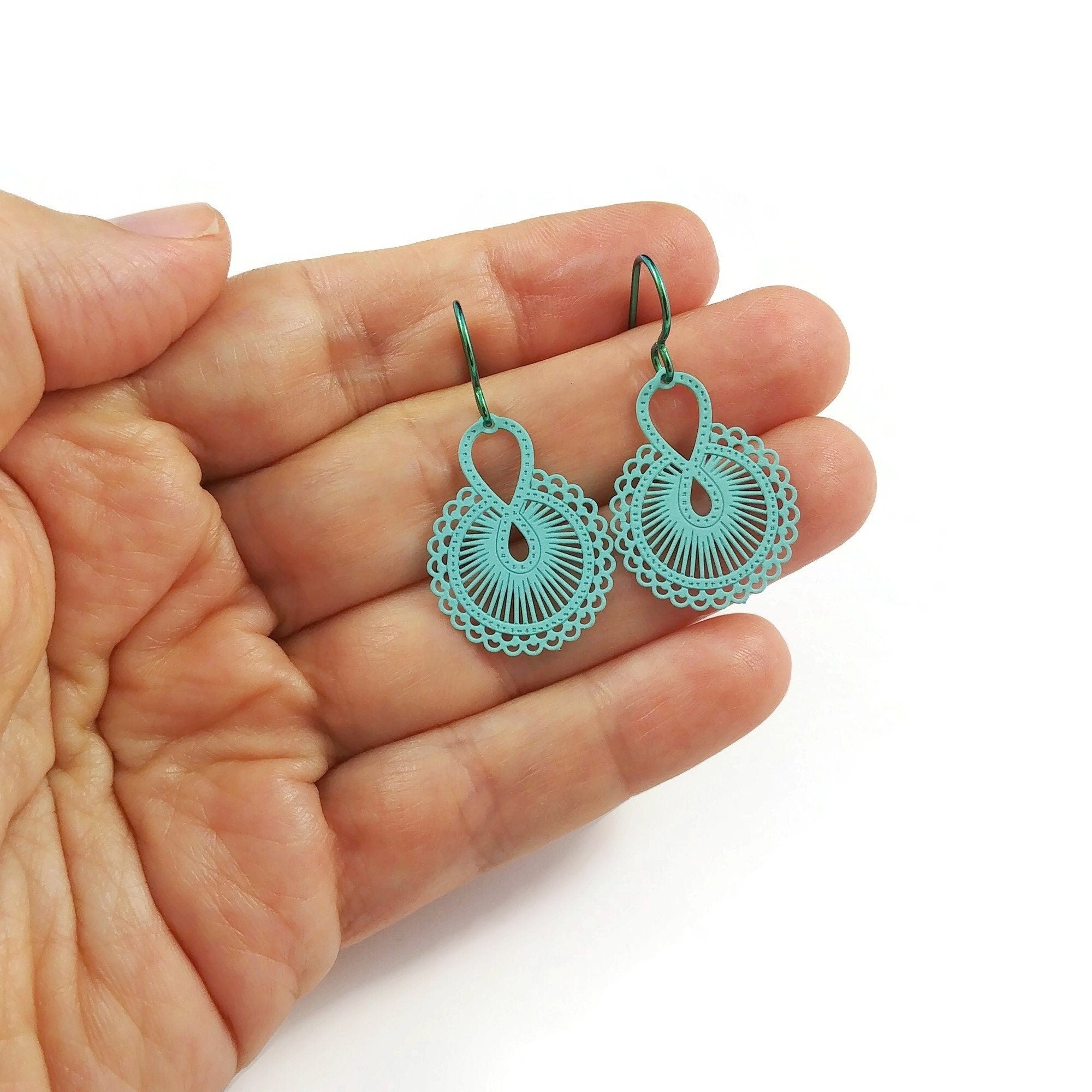 These dangle earrings are comfortable to wear. I've assembled with pure niobium aqua ear wires. Niobium is 100% hypoallergenic and will not tarnish. This metal is a safe choice for anyone with metal allergies. Niobium is highly biocompatible just like titanium.
