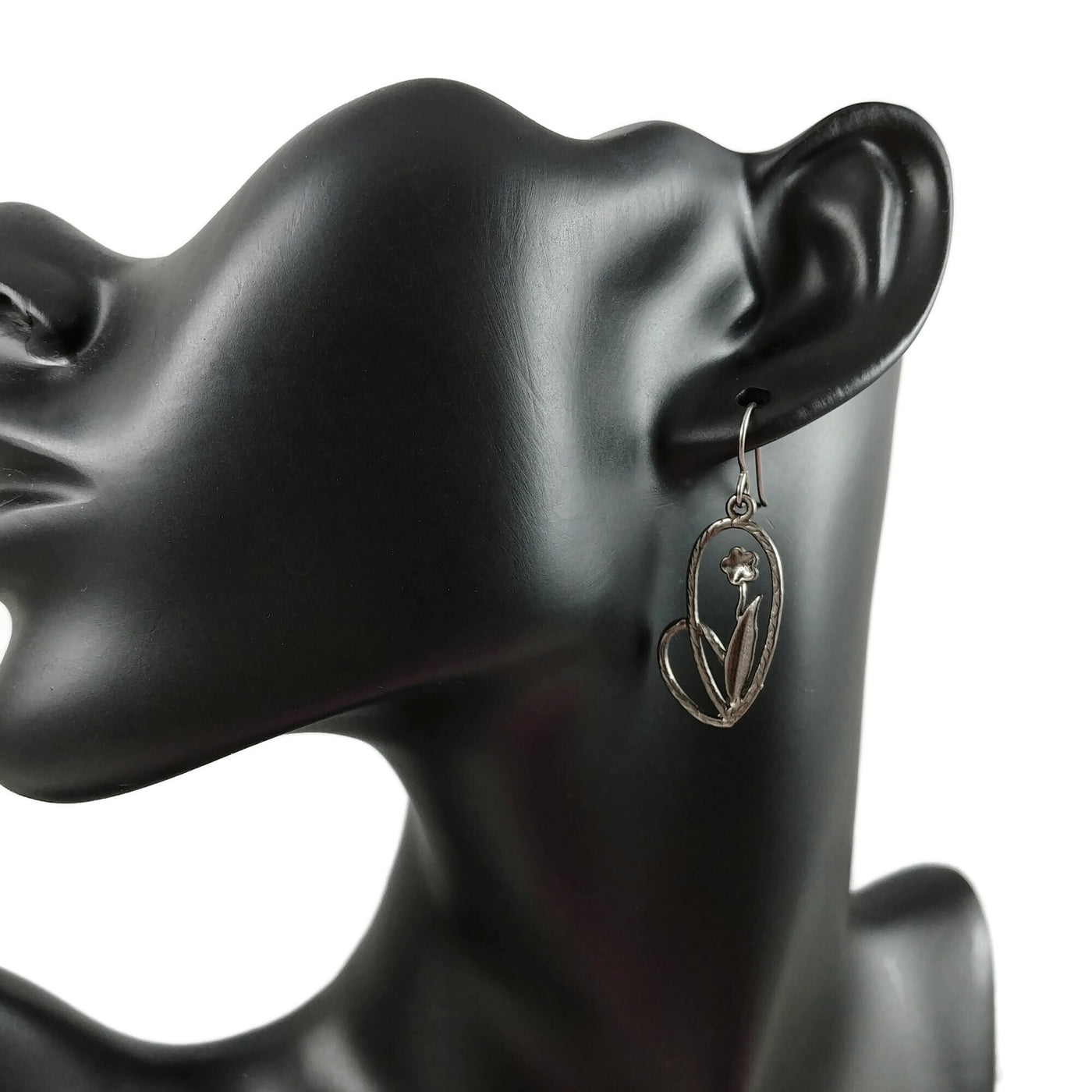 A unique drop earrings! Featuring gunmetal flower and oval pattern pendants.