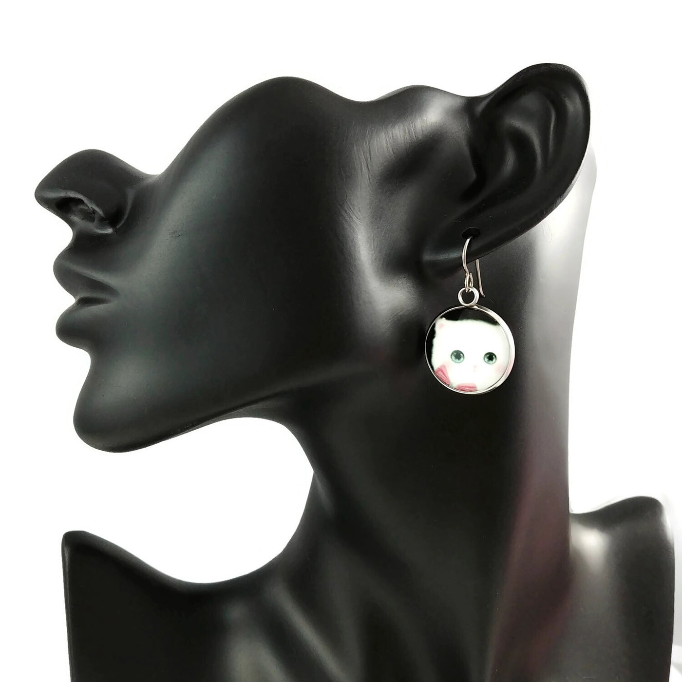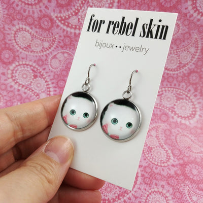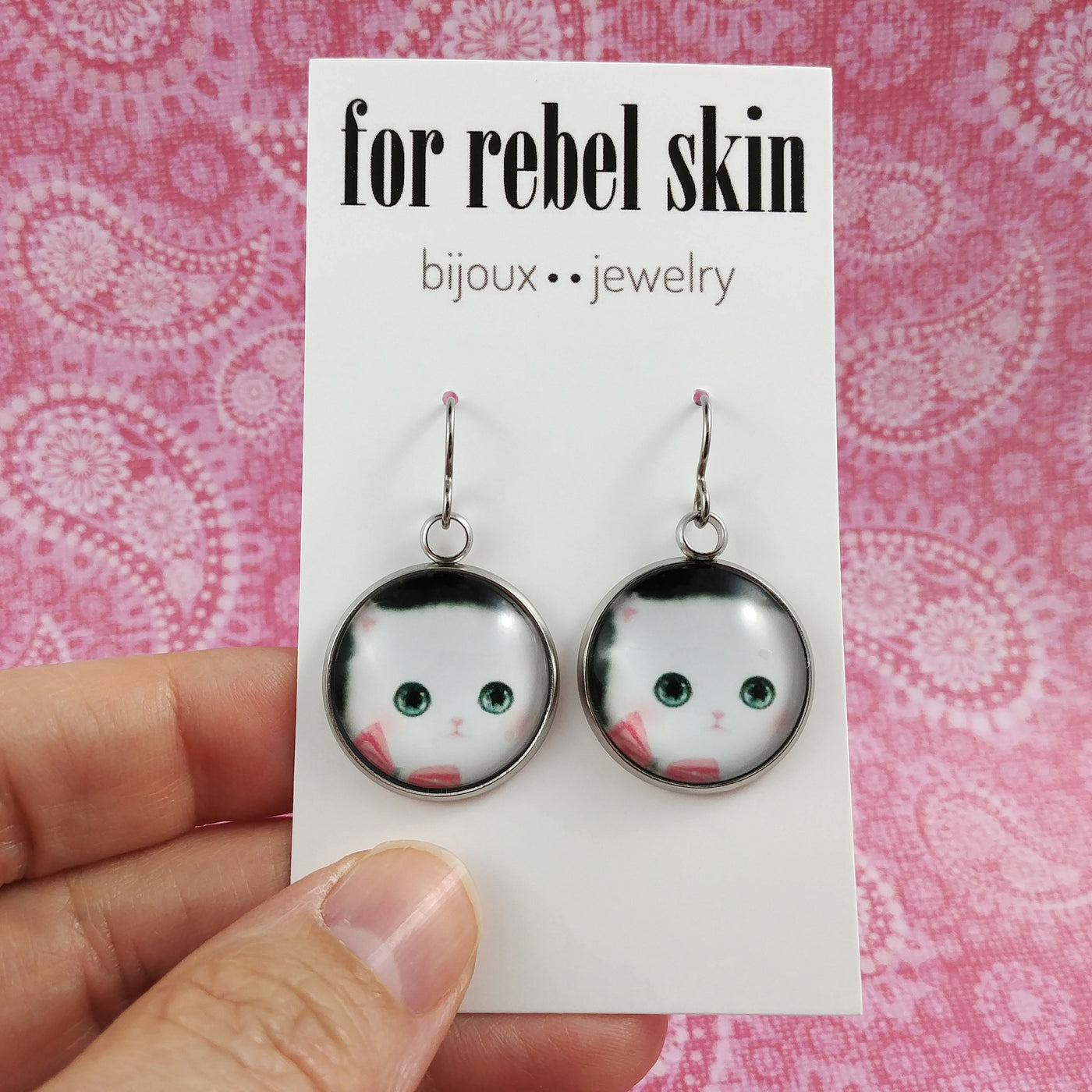 Kitty dangle earrings. Hypoallergenic pure titanium, stainless steel and glass jewelry.