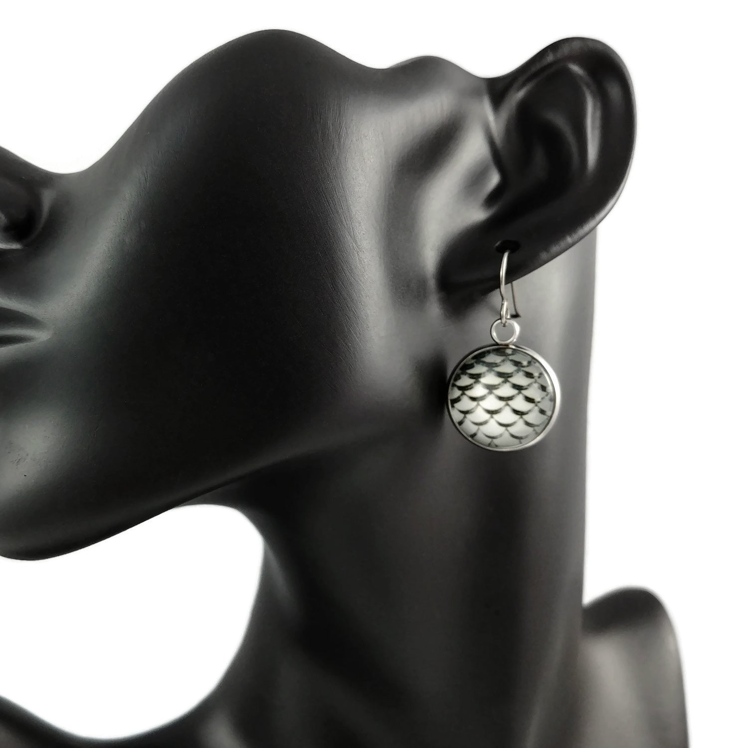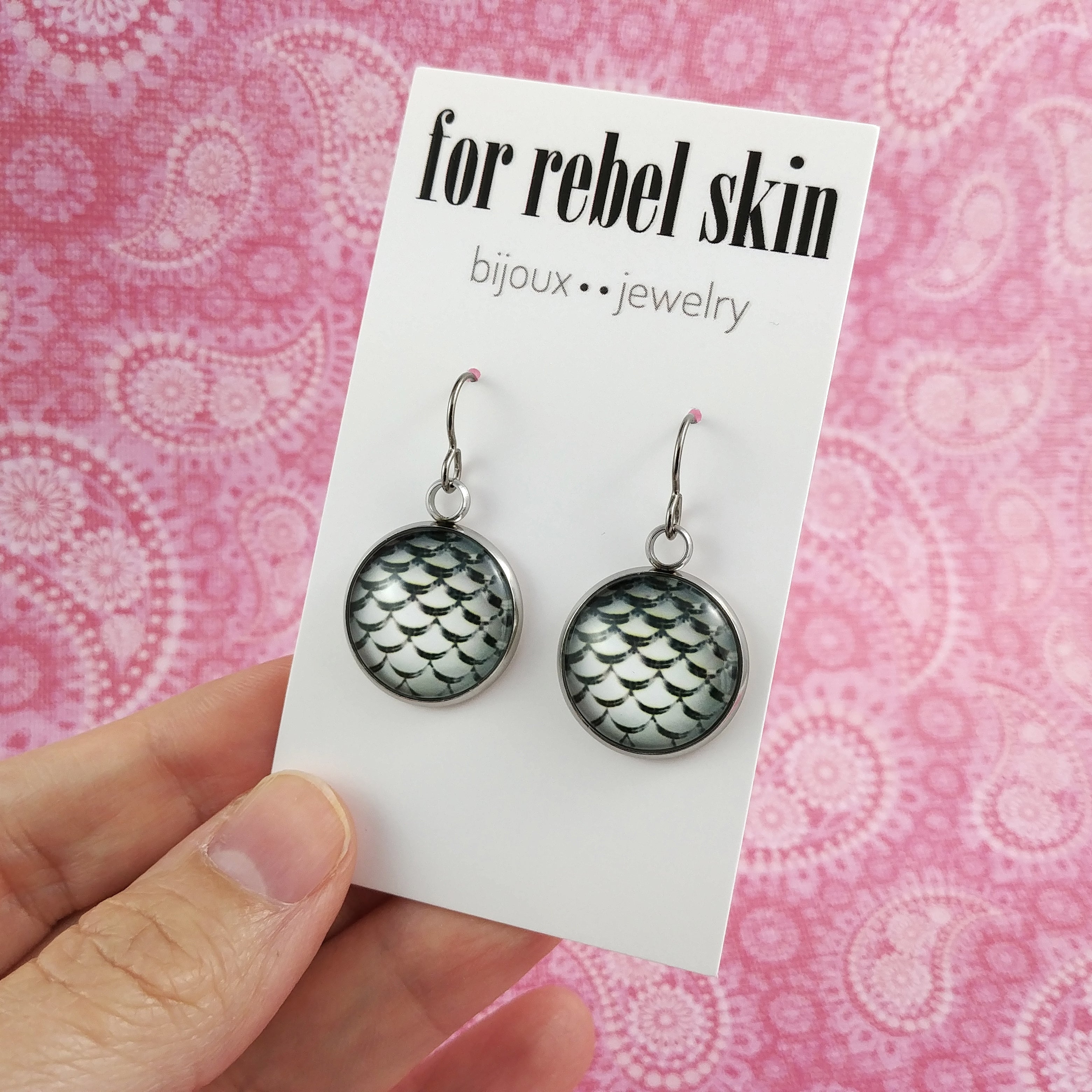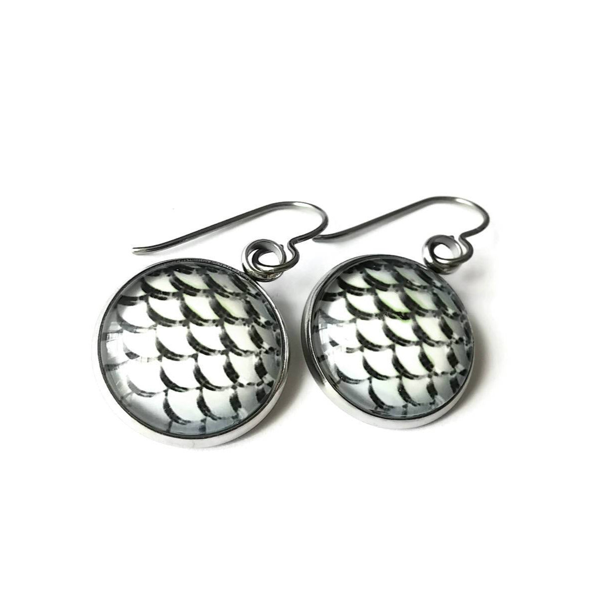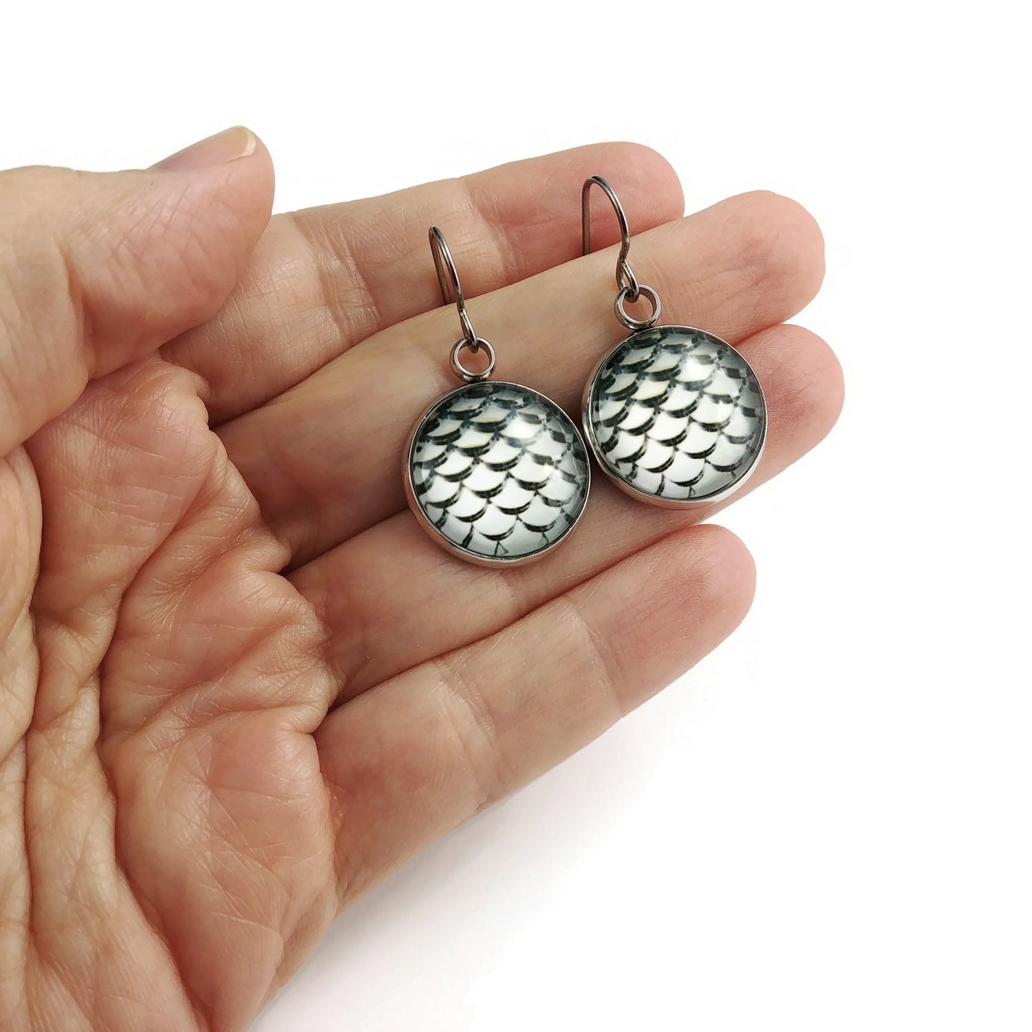 Mermaid, fish or dragon grey scale dangle earrings. Hypoallergenic pure titanium, stainless steel and glass jewelry.