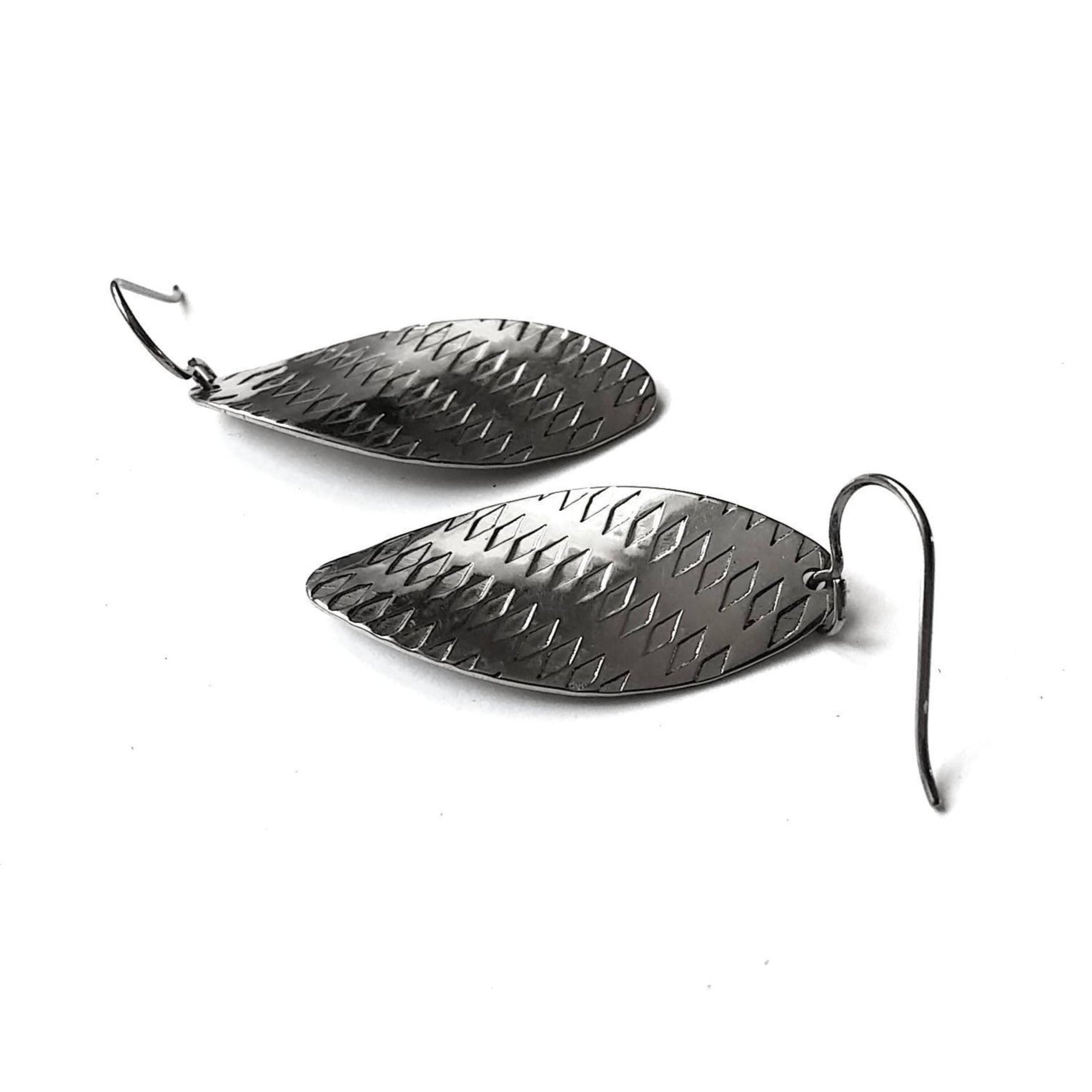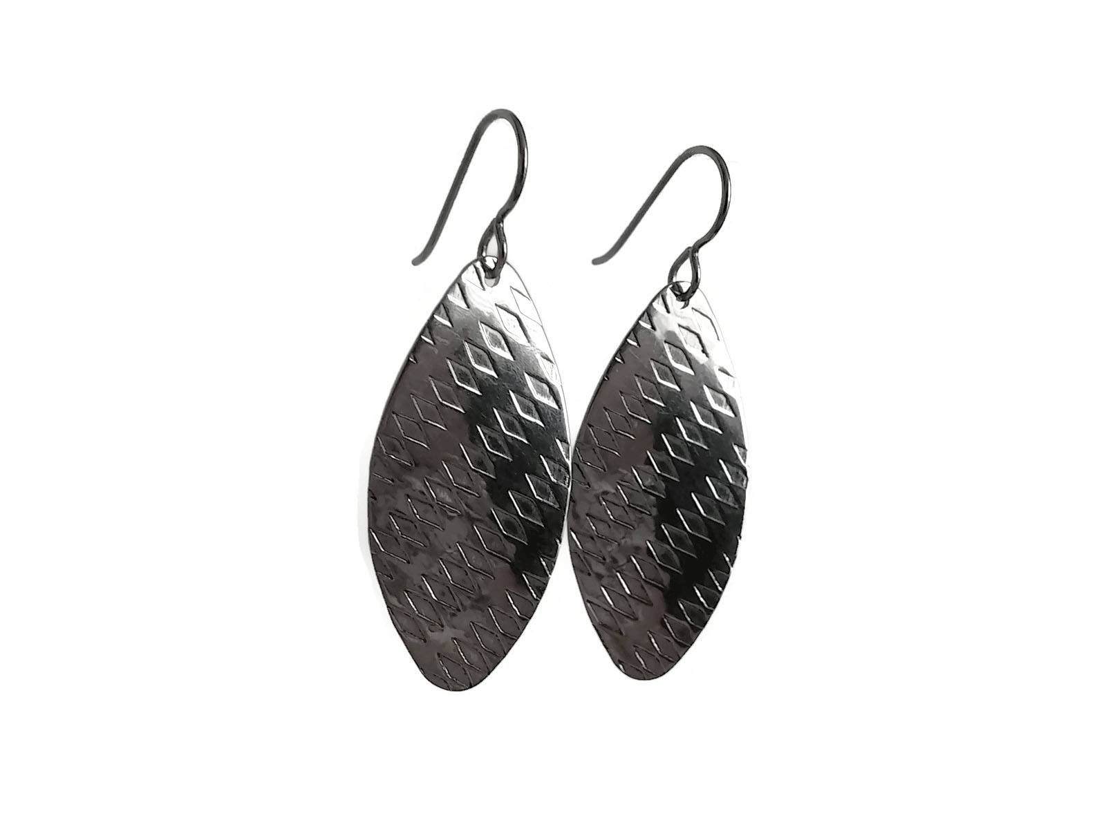 Stainless steel pendants measuring 37mm x 17mm (approx. 1 1/2 x 5/8"). Silicone earnuts included.