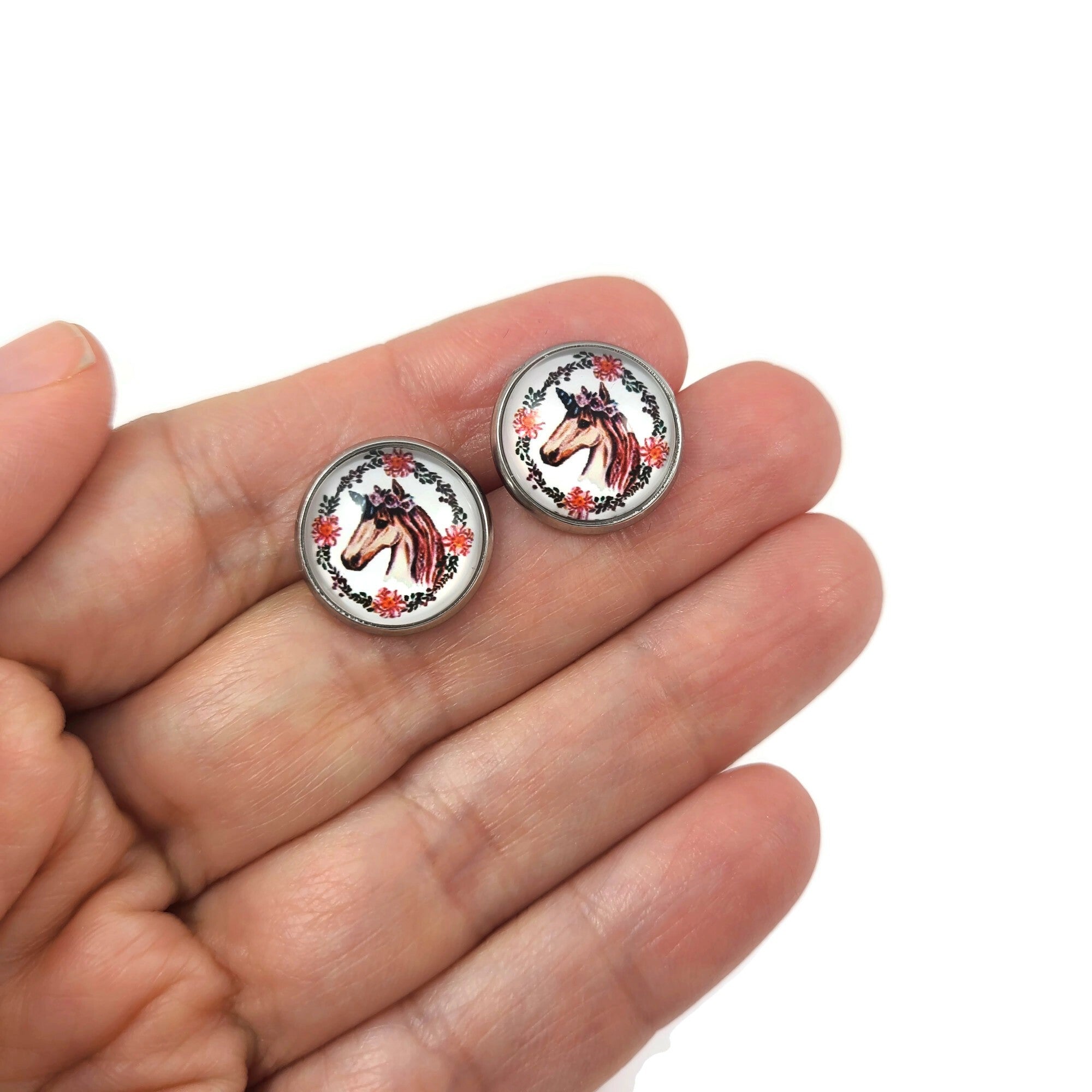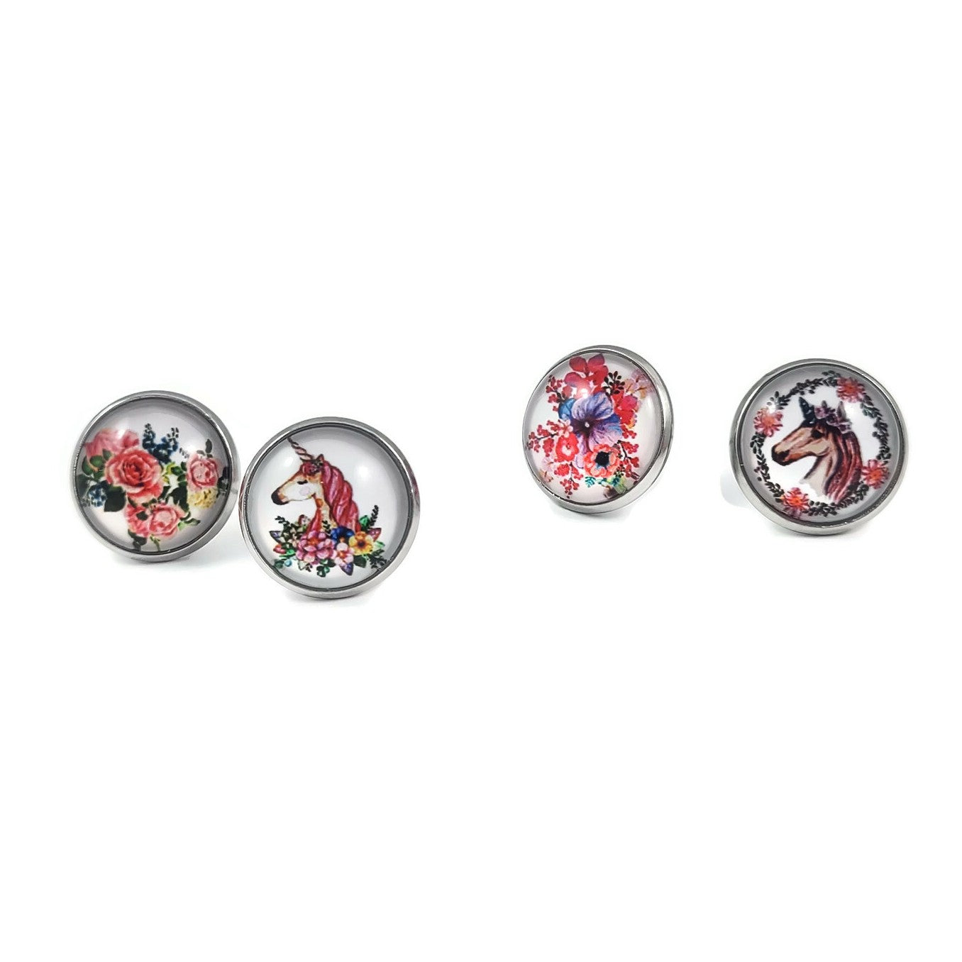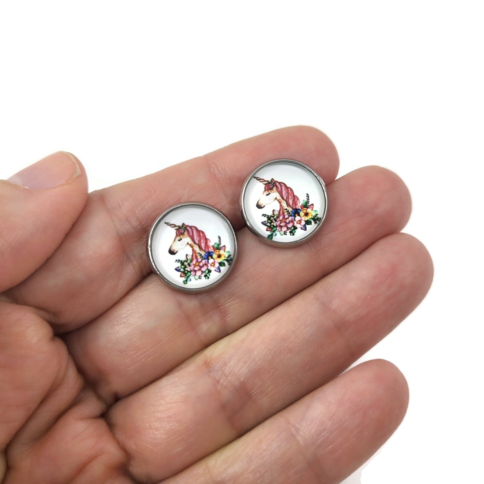Flower and unicorn surgical steel stud earrings