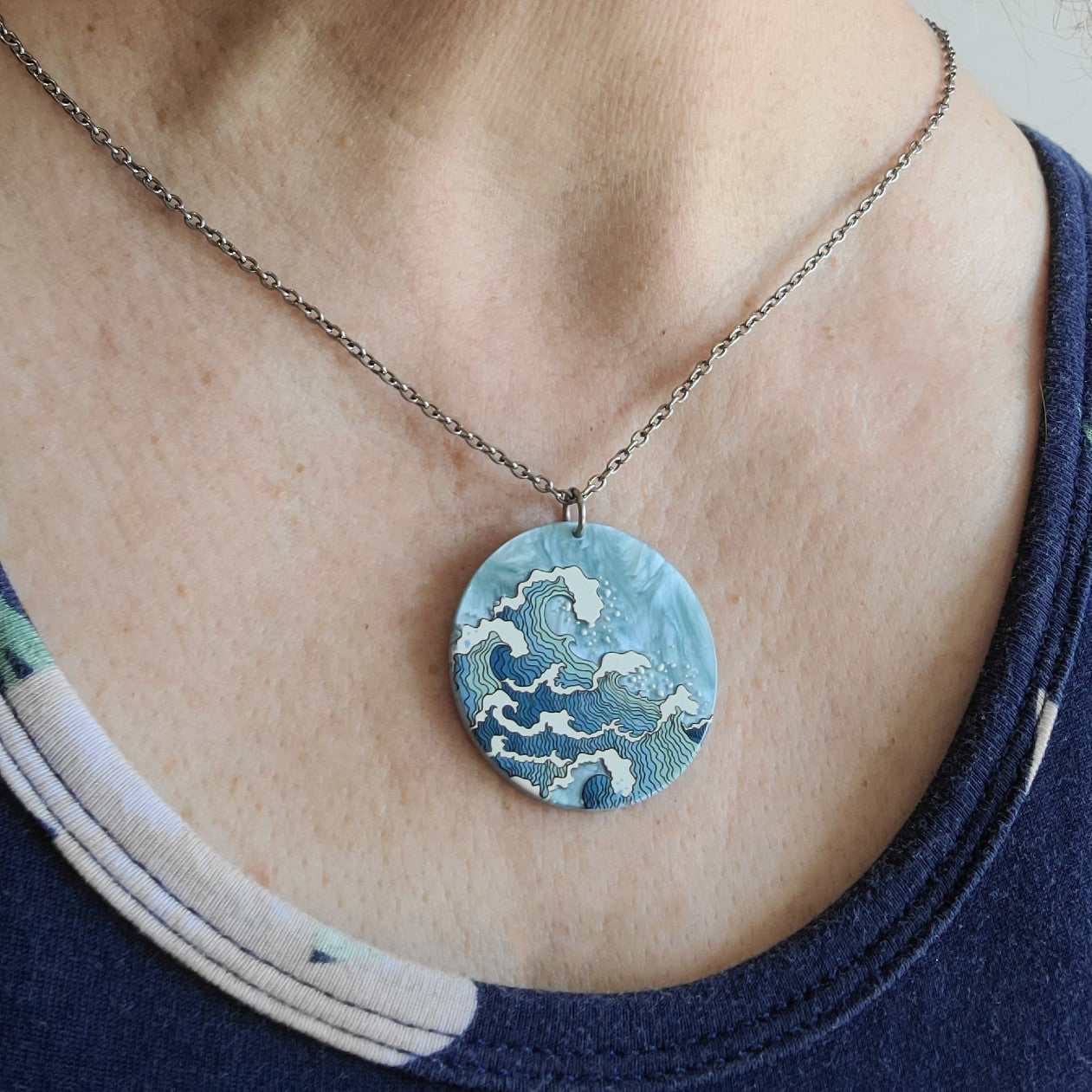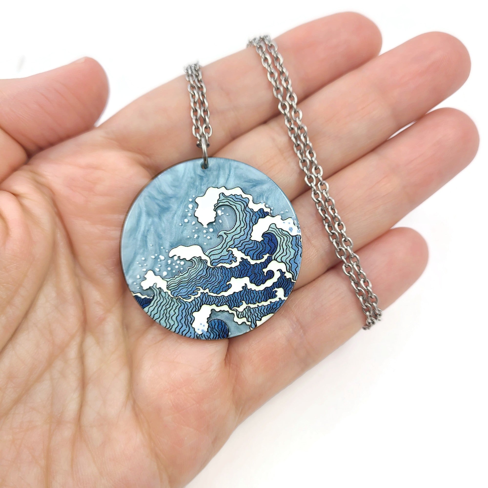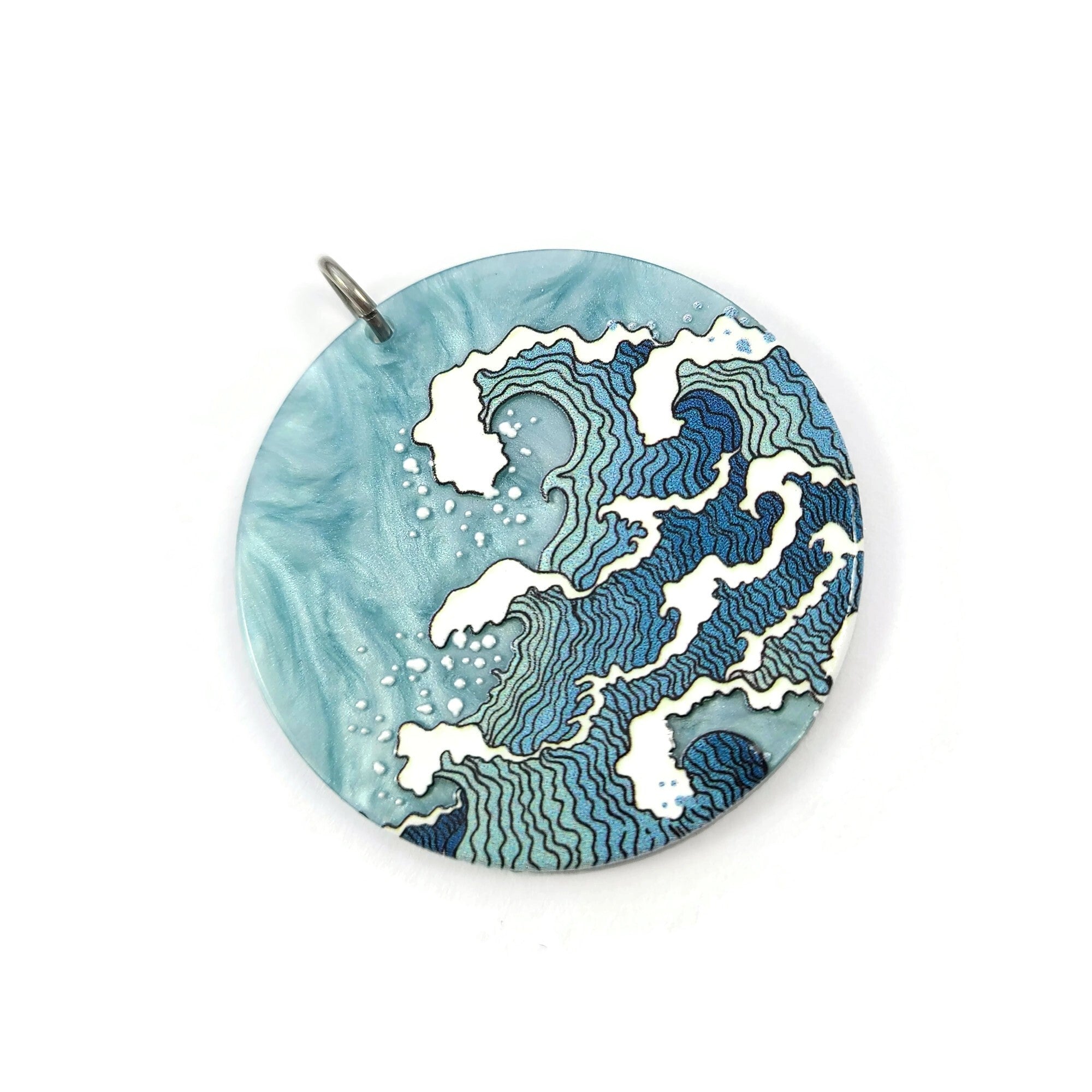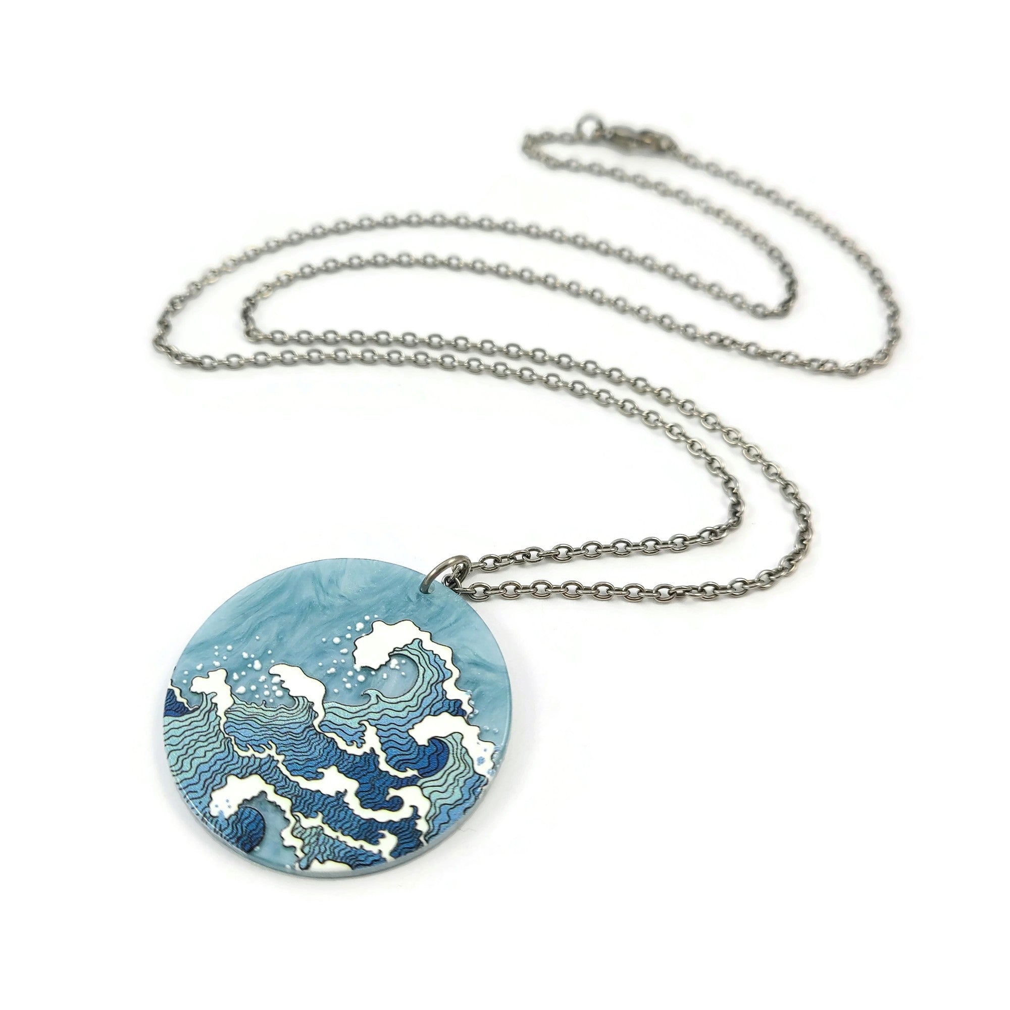 Introducing The Wave Necklace Pendant – where style meets the sea, designed especially for those with a sensitive touch. Embrace the beauty of the ocean without any worry. Our exclusively designed hypoallergenic acrylic pendants feature a captivating big wave print, inspired by the untamed spirit of the sea. Each pendant is a substantial 1.5 inches in diameter, perfect for making a statement while being lightweight enough to wear comfortably all day long.