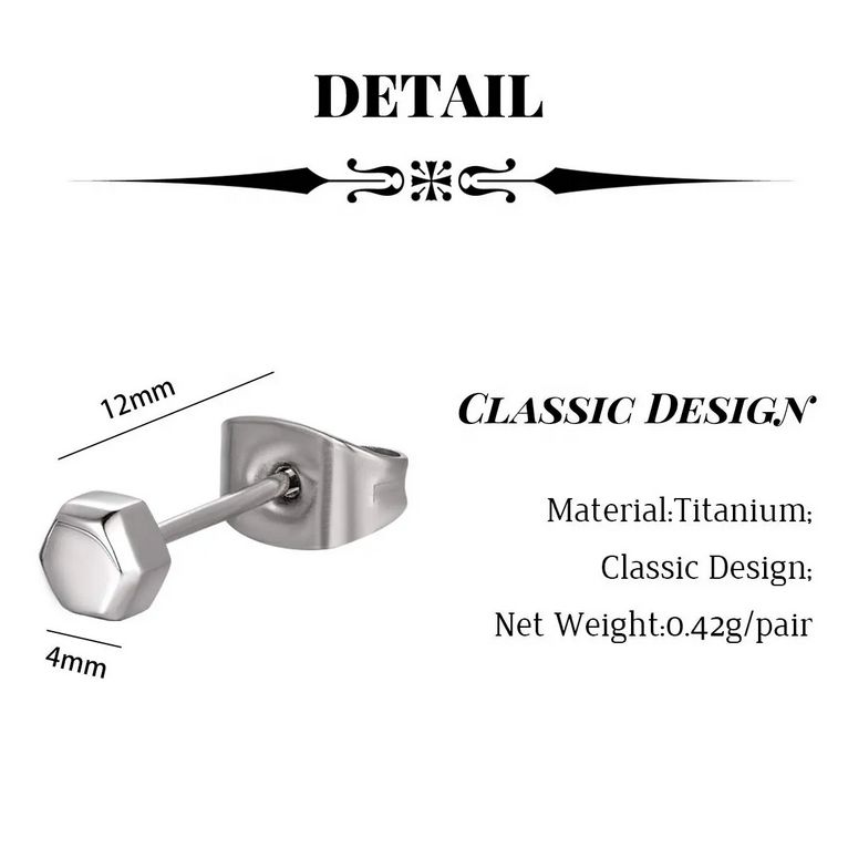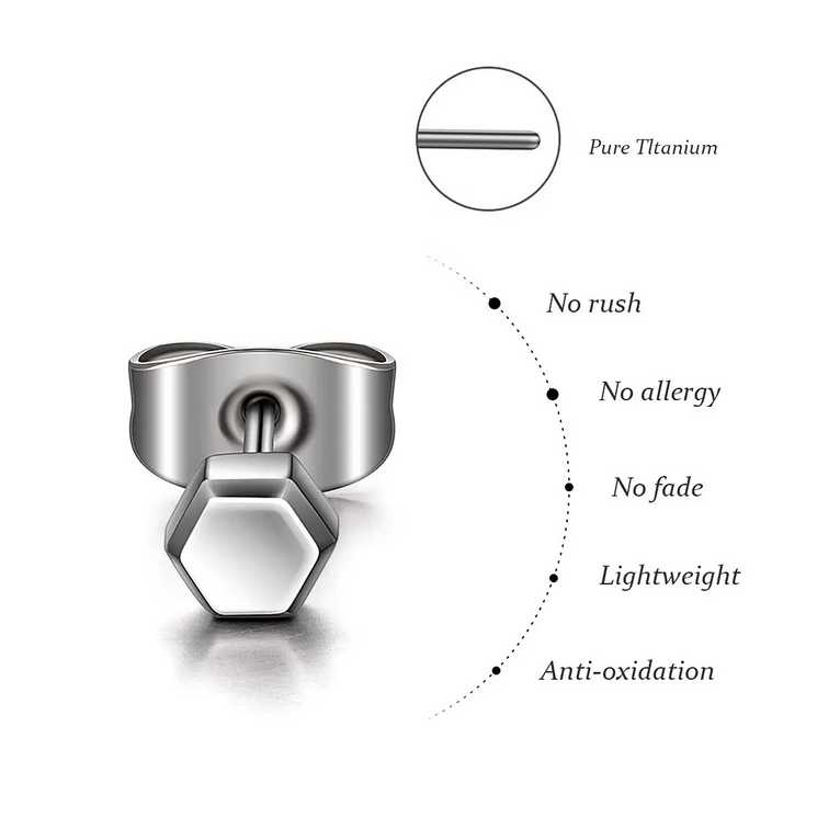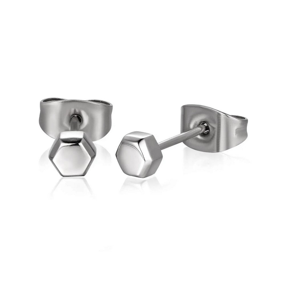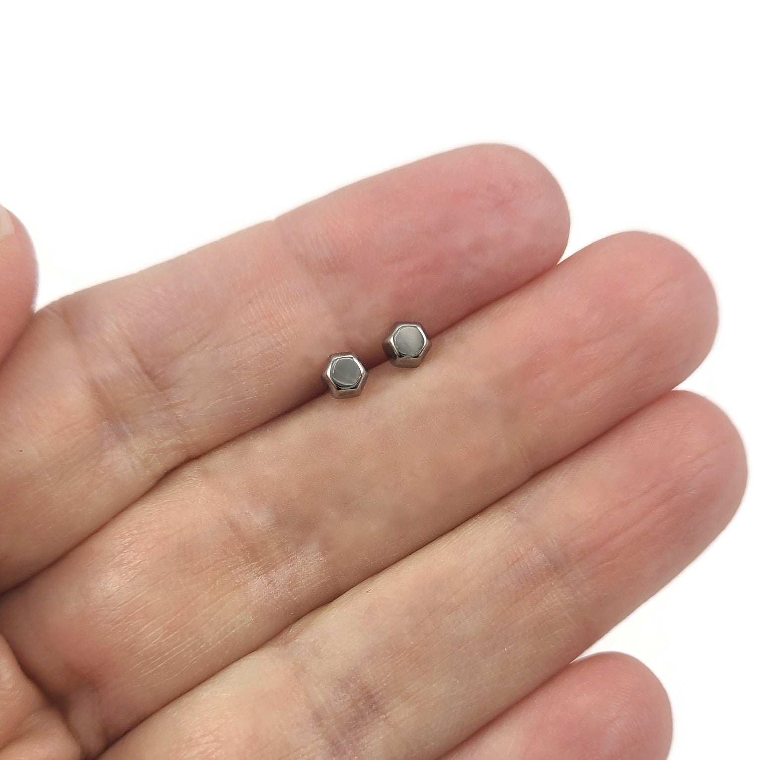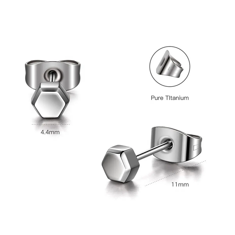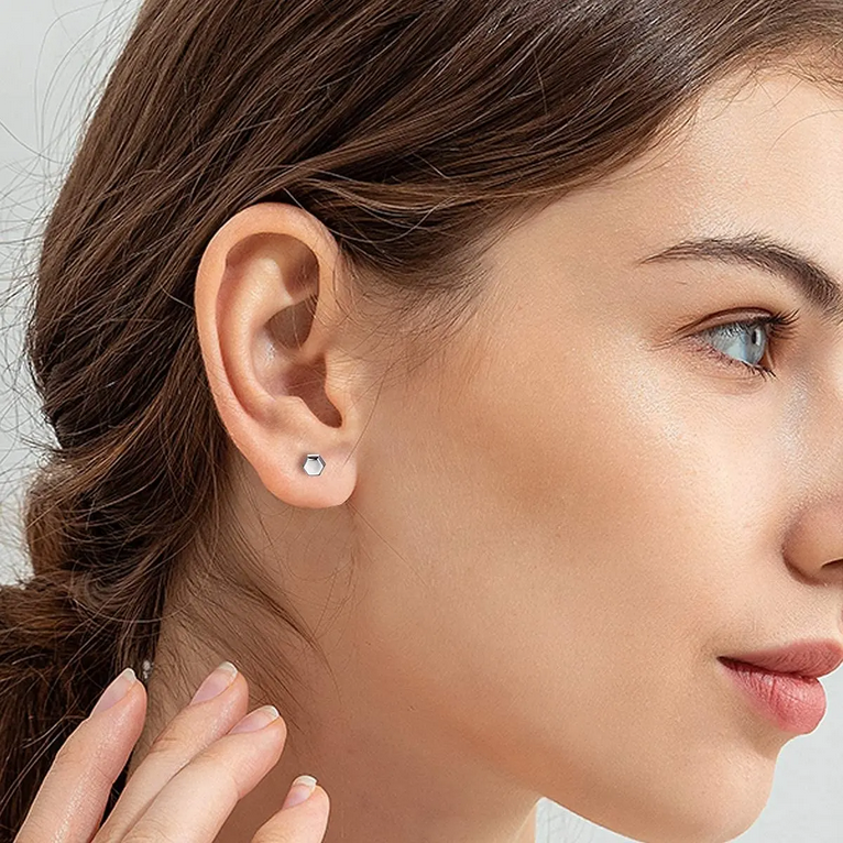 A modern minimalist hexagon stud earrings. Say goodbye to irritation and hello to your new go-to accessory. At just 4mm wide, these studs are the perfect size to make a subtle statement without overwhelming. The geometric precision of the hexagon shape adds a dash of contemporary flair to any outfit, making it effortlessly chic and uniquely you.