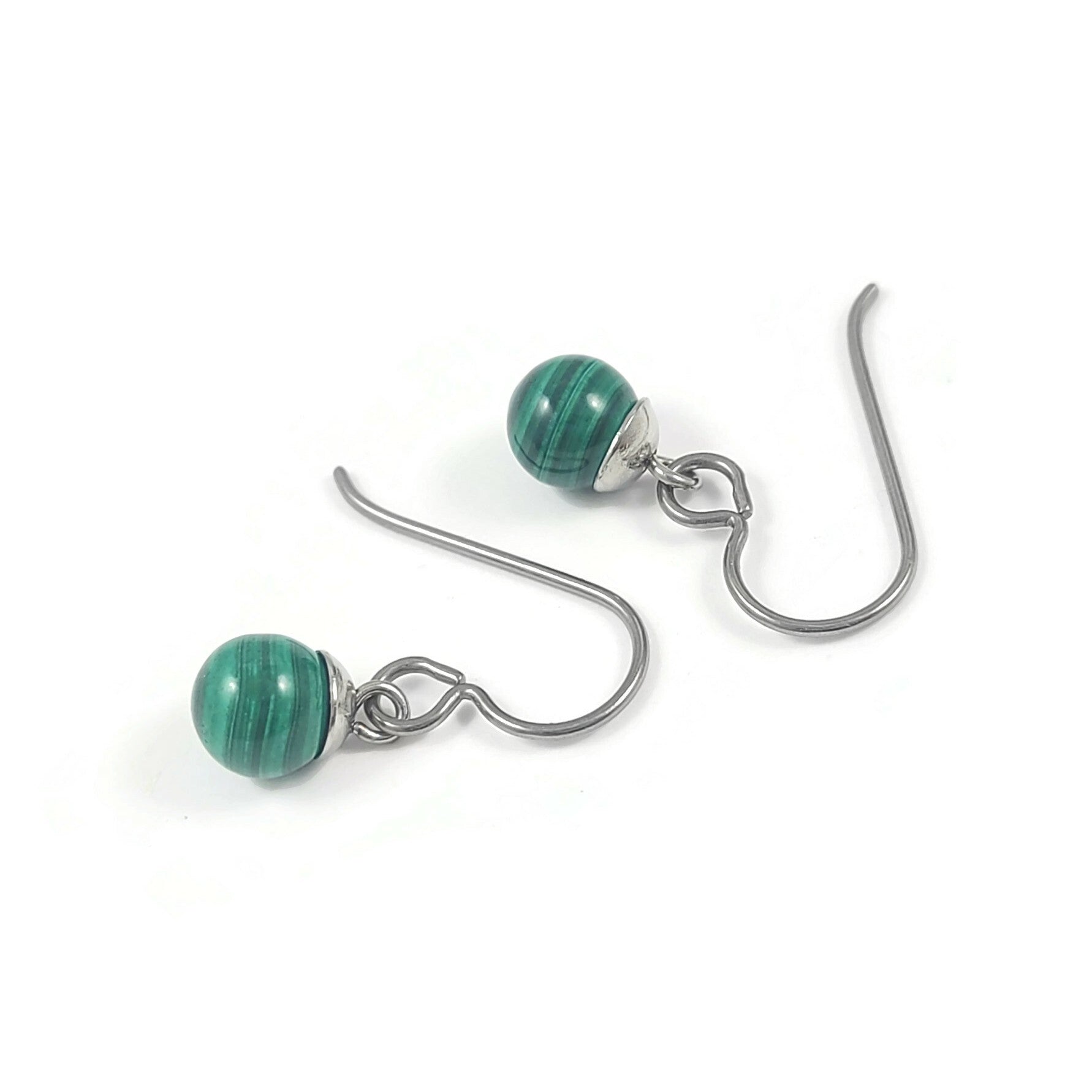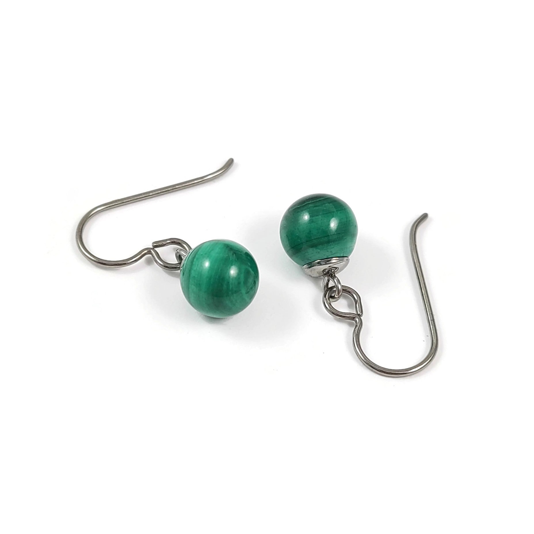 Laissez libre cours à votre style grâce à l'élégance naturelle de nos boucles d'oreilles pendantes en malachite naturelle, soigneusement conçues pour allier confort, élégance et charme intemporel. Ces pendants minimalistes sont ornés de perles de malachite rondes et lisses aux tons vert profond envoûtants et aux stries superposées évoquant la beauté brute de la nature.