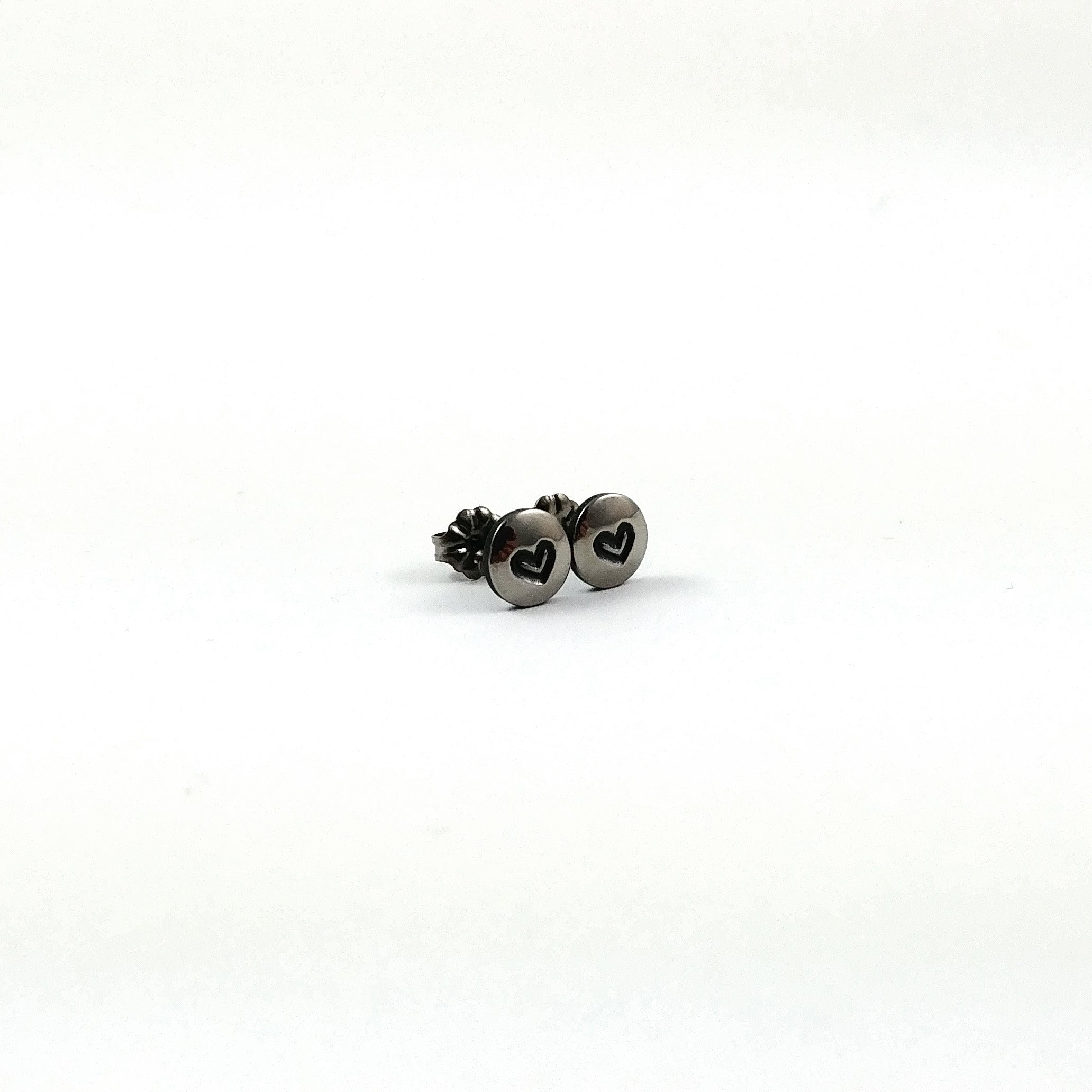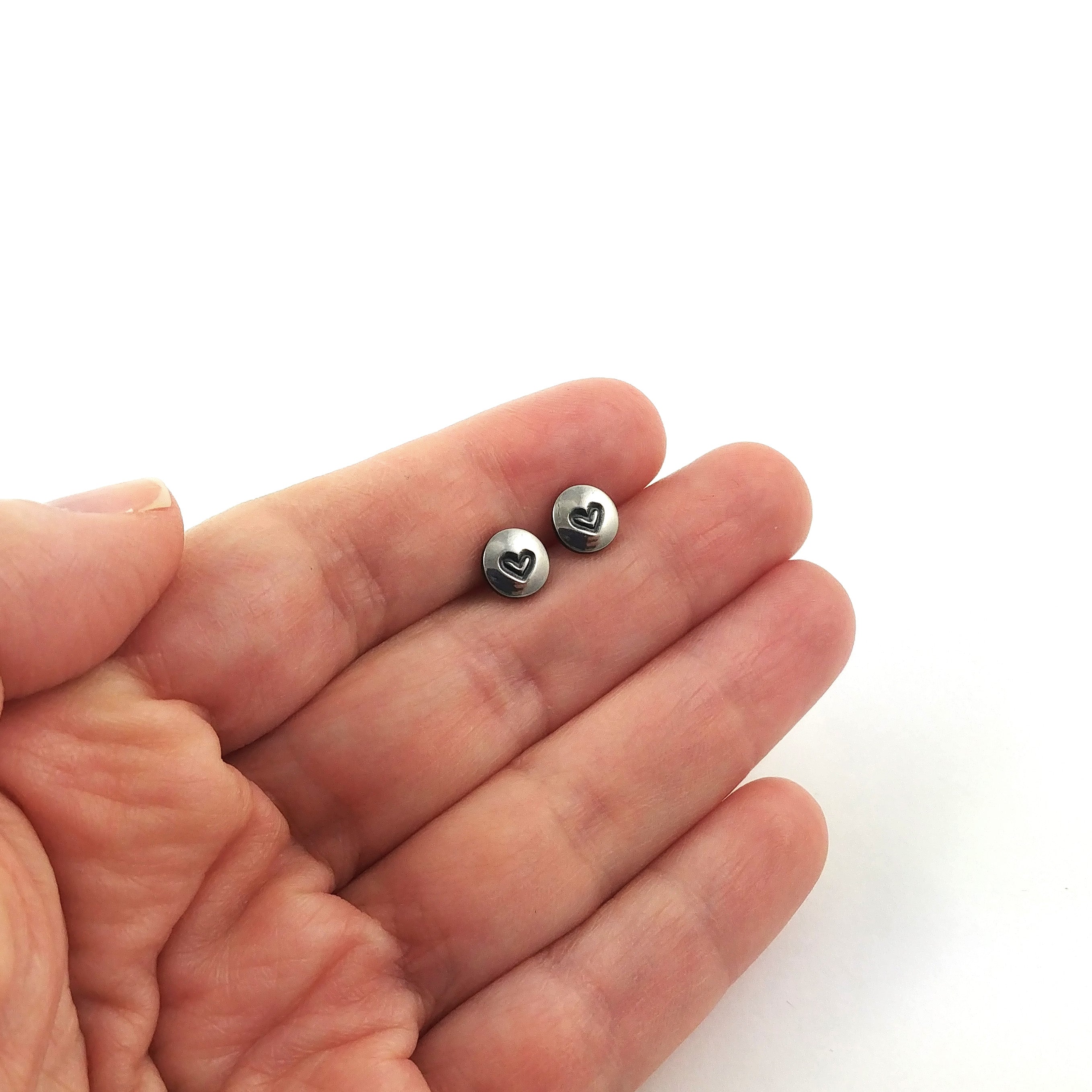Petites boucles d'oreilles clous, fabriquées à la main et chaque paire est totalement unique. Environ : 7 mm. Papillon en titane pur également inclus avec chaque paire. Léger, confortable et hypoallergénique.