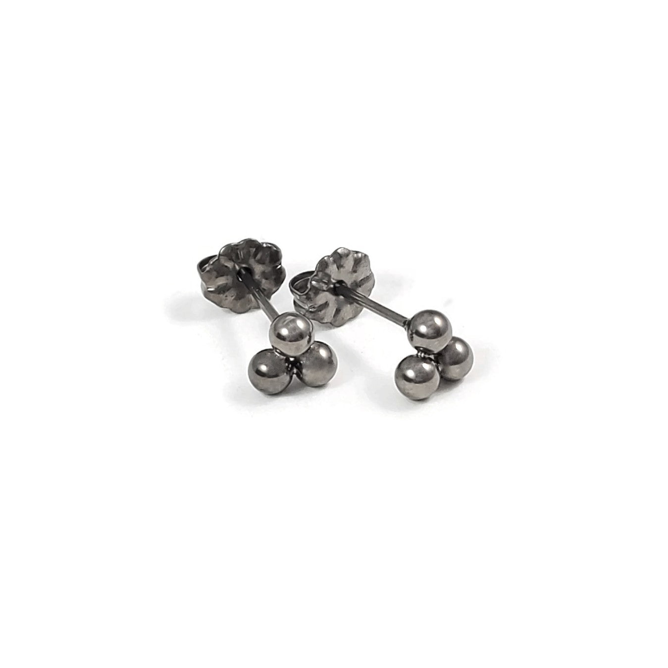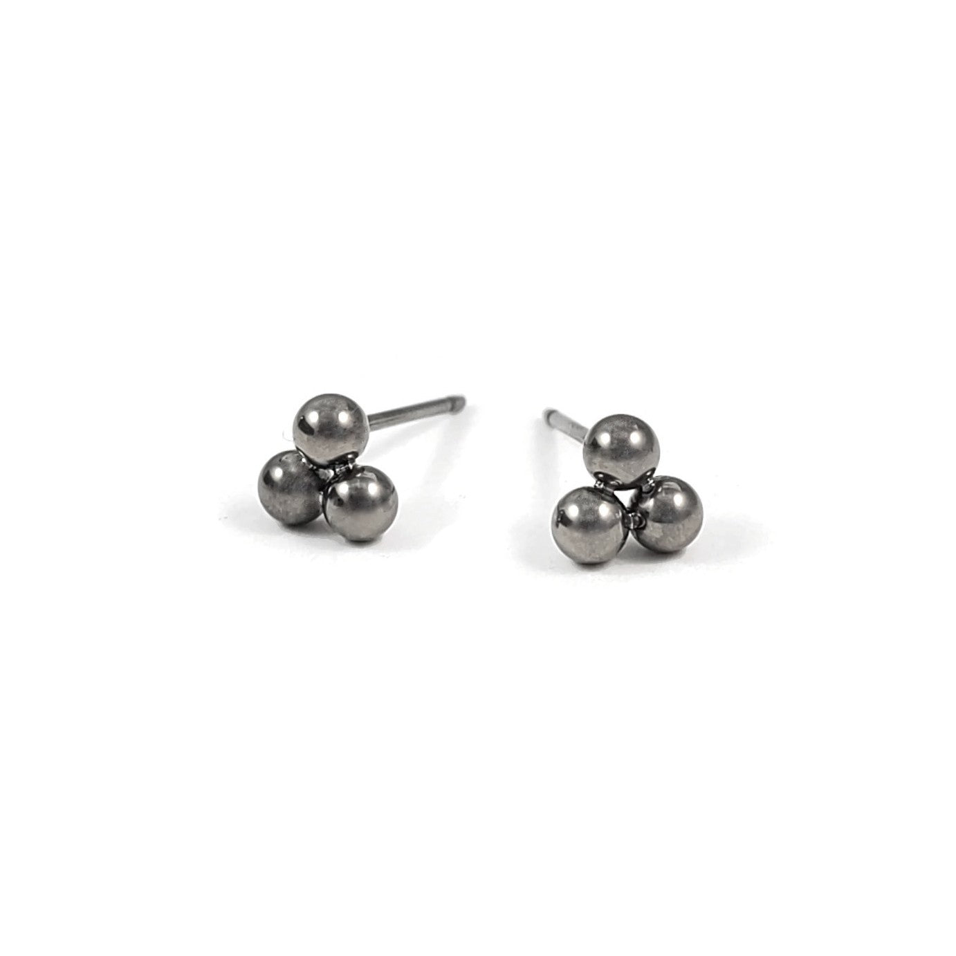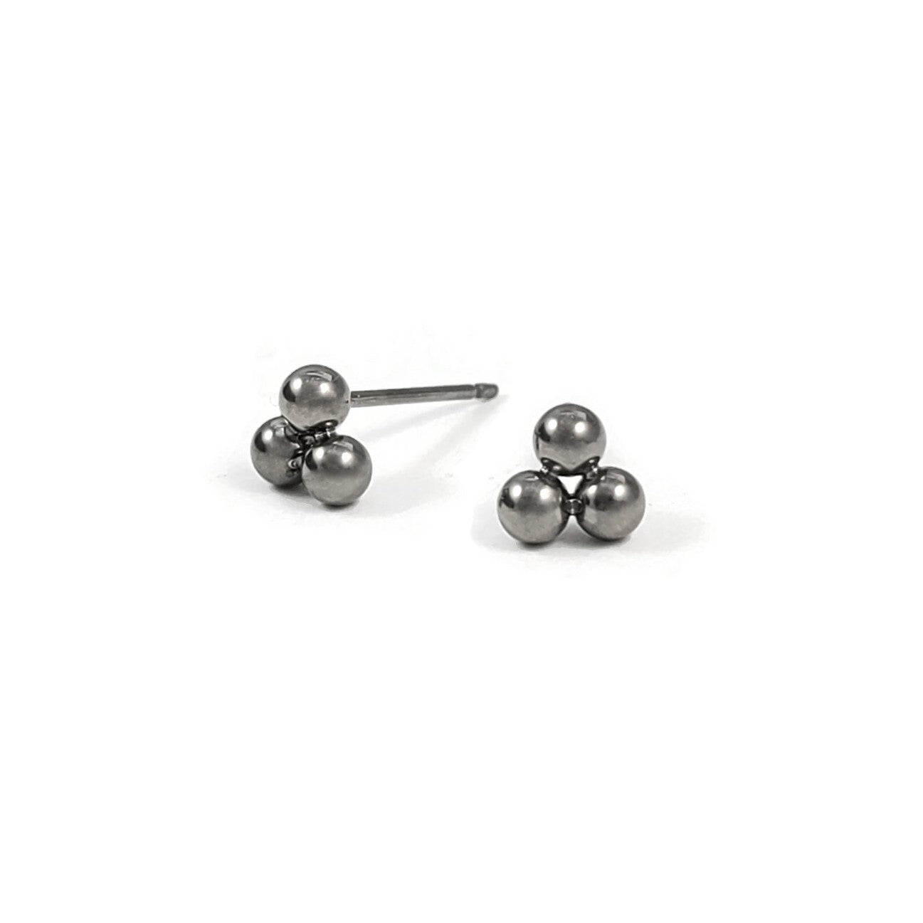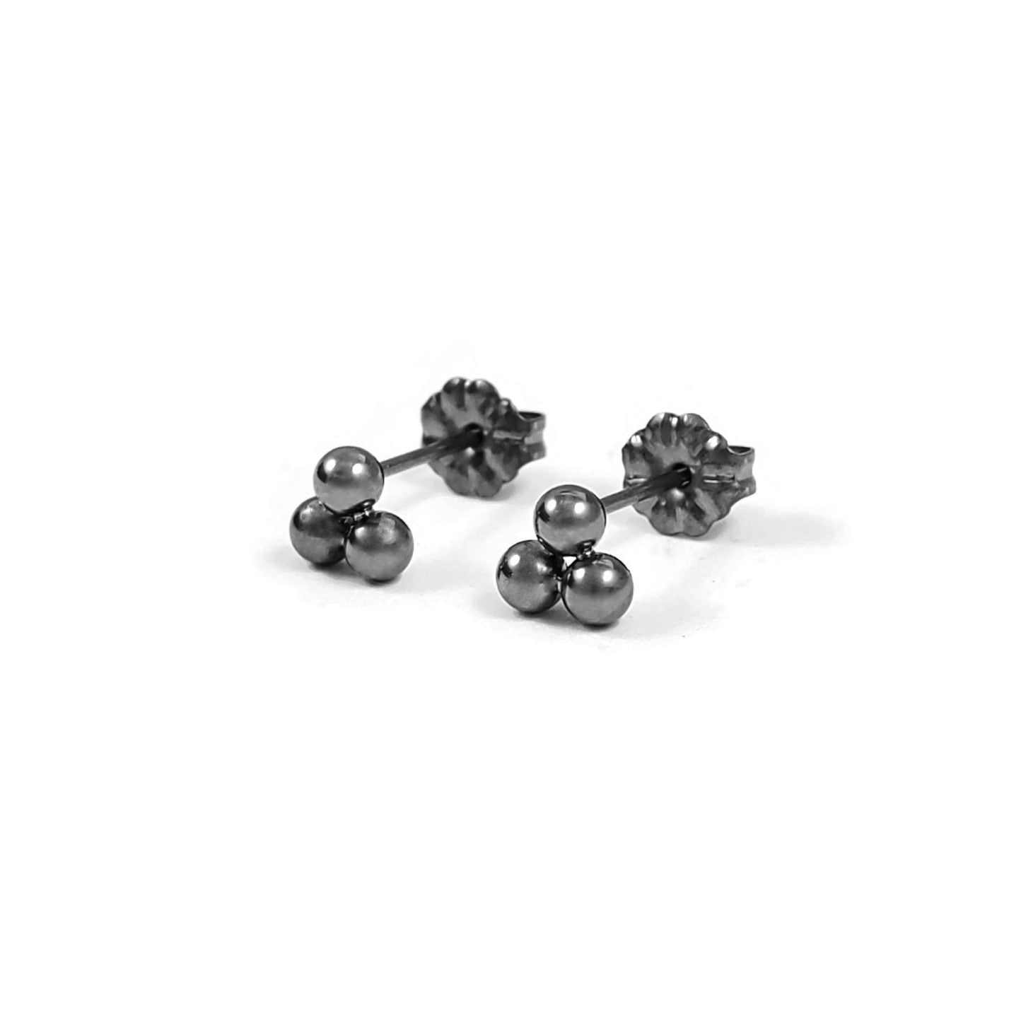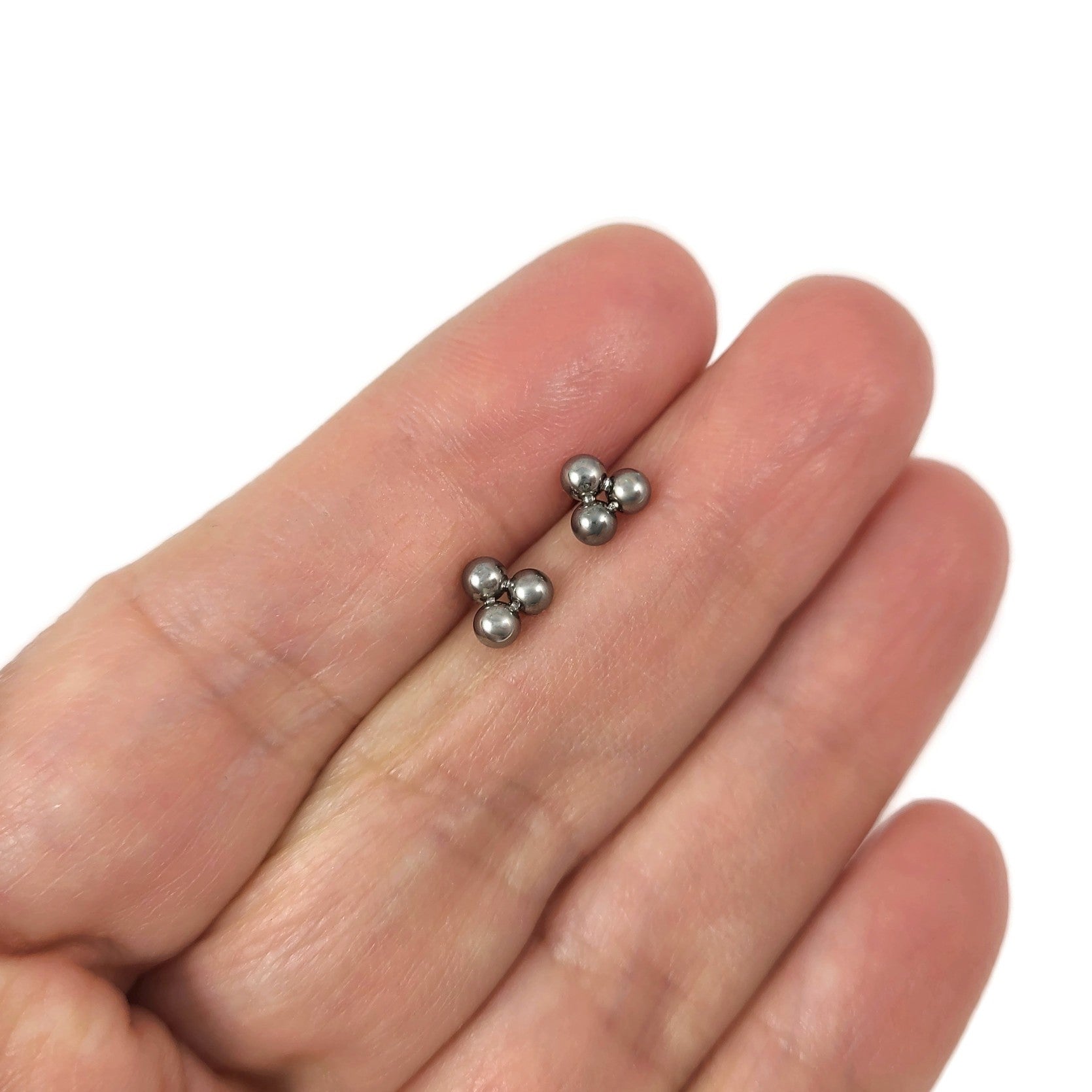 De petites boucles d'oreilles modernes et minimalistes. 6mm de large. Unique design avec un trio de sphères de 3mm.