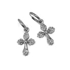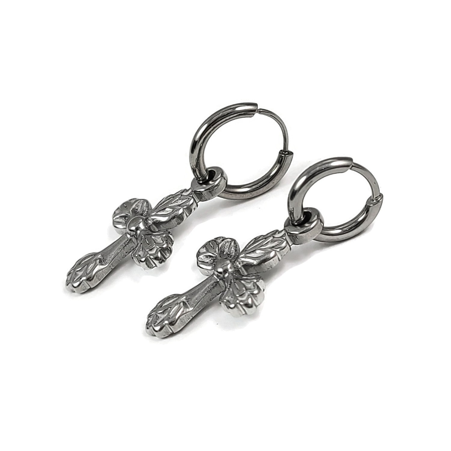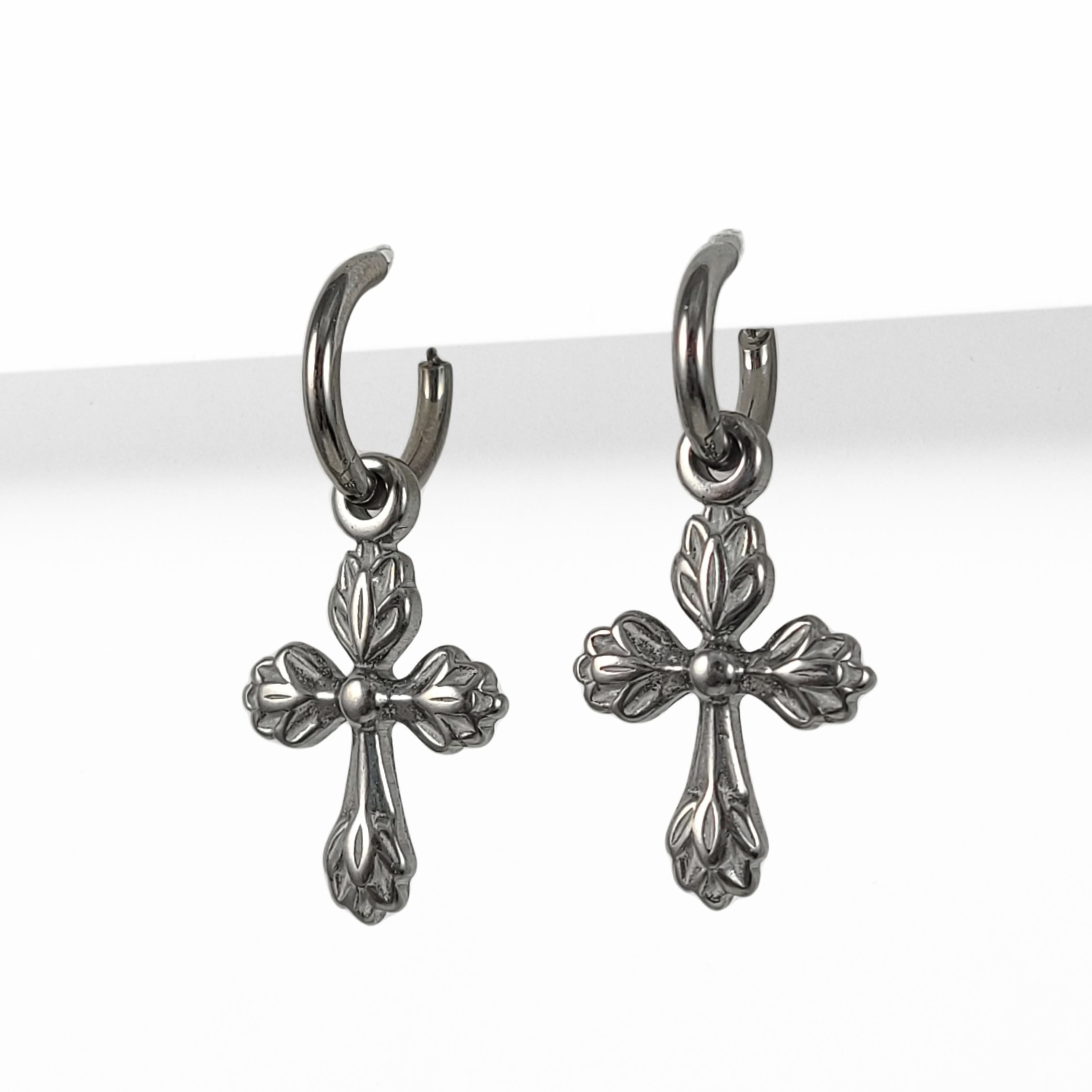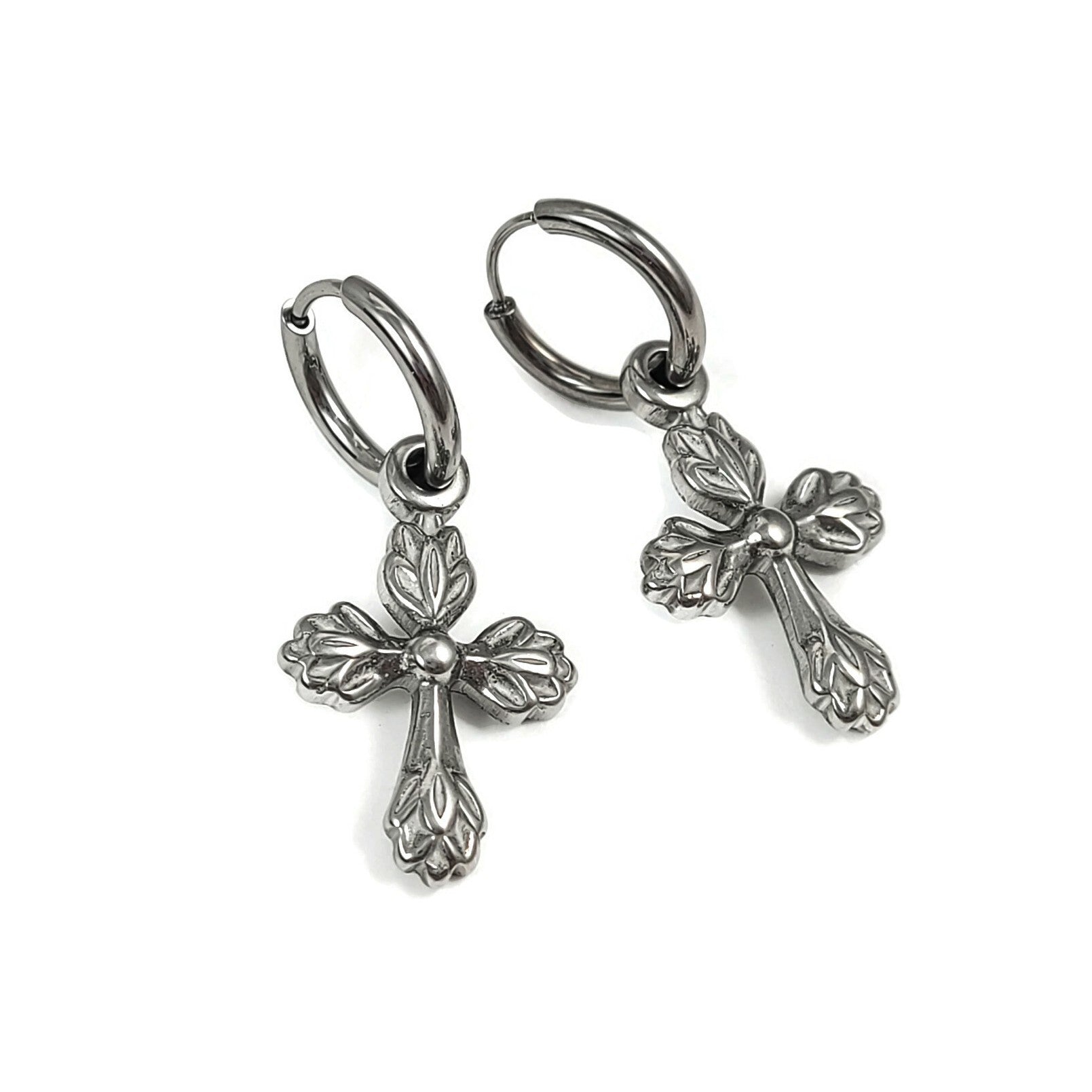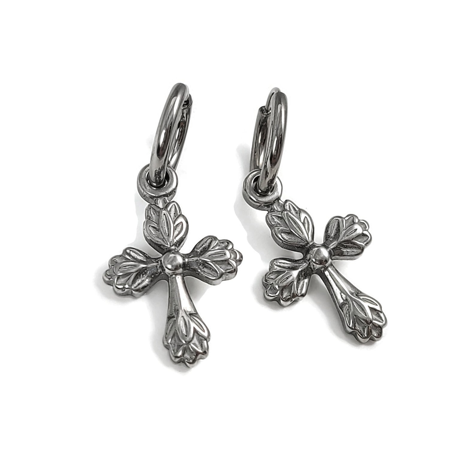 Boucles d'oreilles créoles en titane naturel pur, avec des breloques croix magnifiques en acier inoxydable. Vendu par paire.