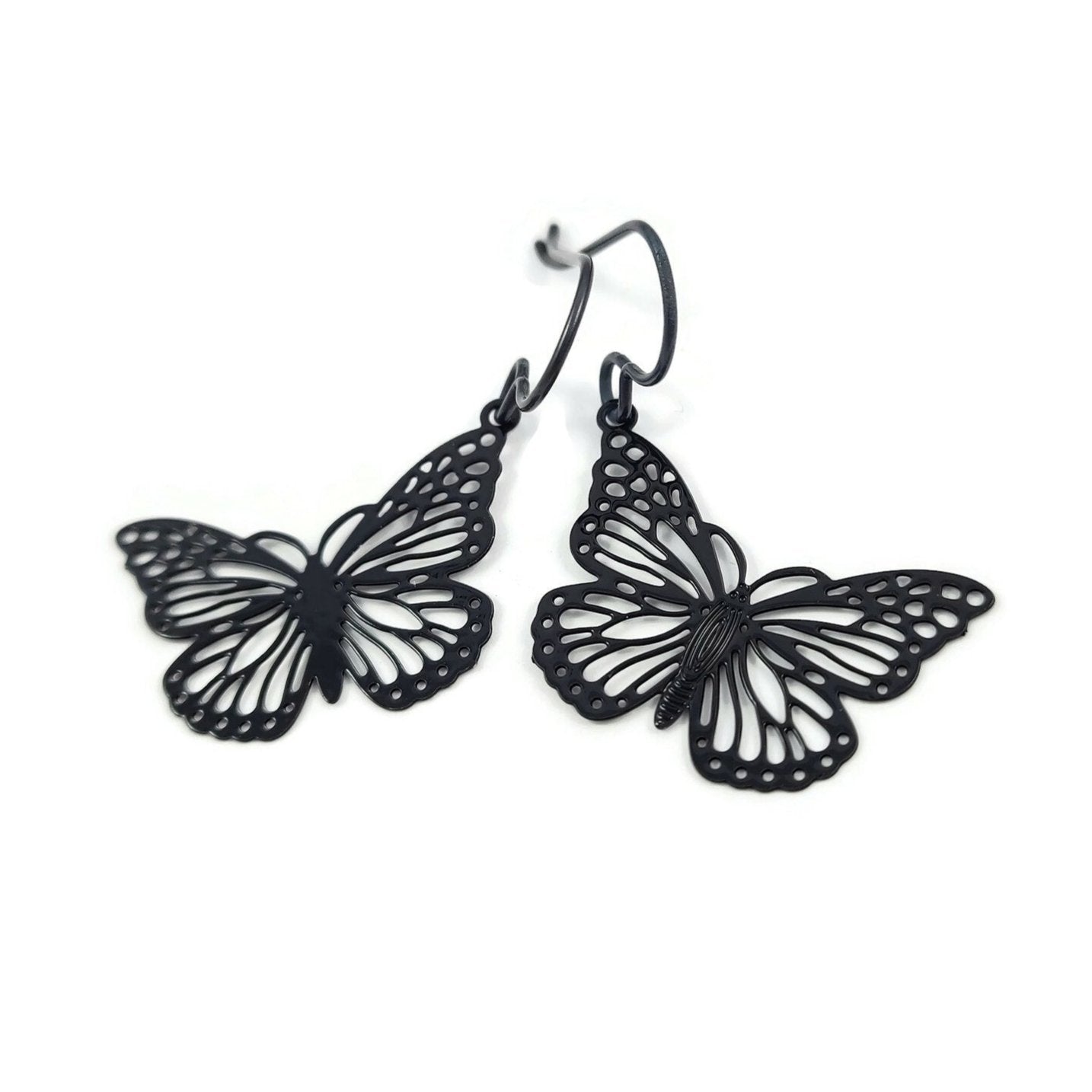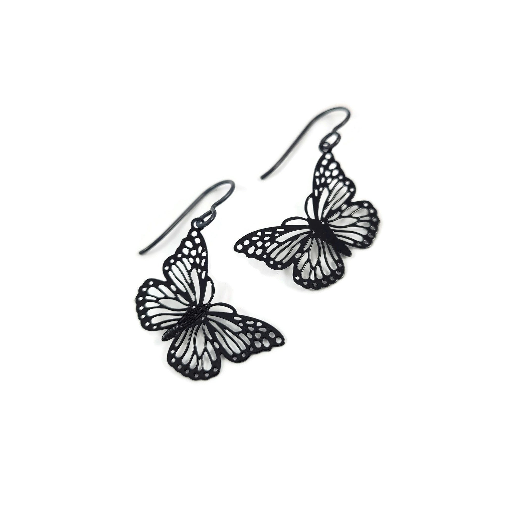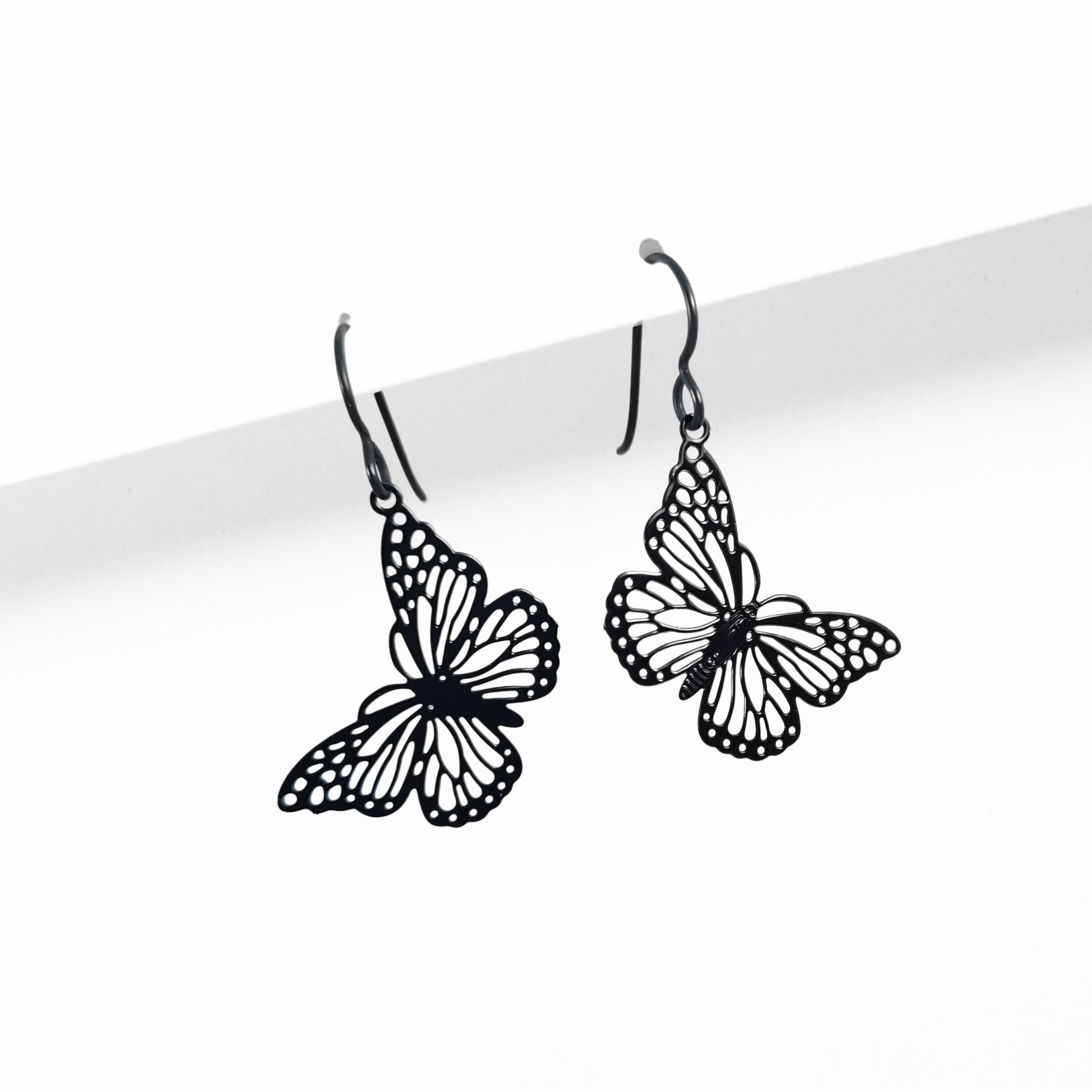 Fabriquées avec soin à partir de crochets en niobium noir pur, ces boucles d'oreilles sont non seulement hypoallergéniques mais aussi incroyablement légères. La star de chaque pièce est la superbe breloque papillon en acier inoxydable noir, mesurant 27 mm x 24 mm.