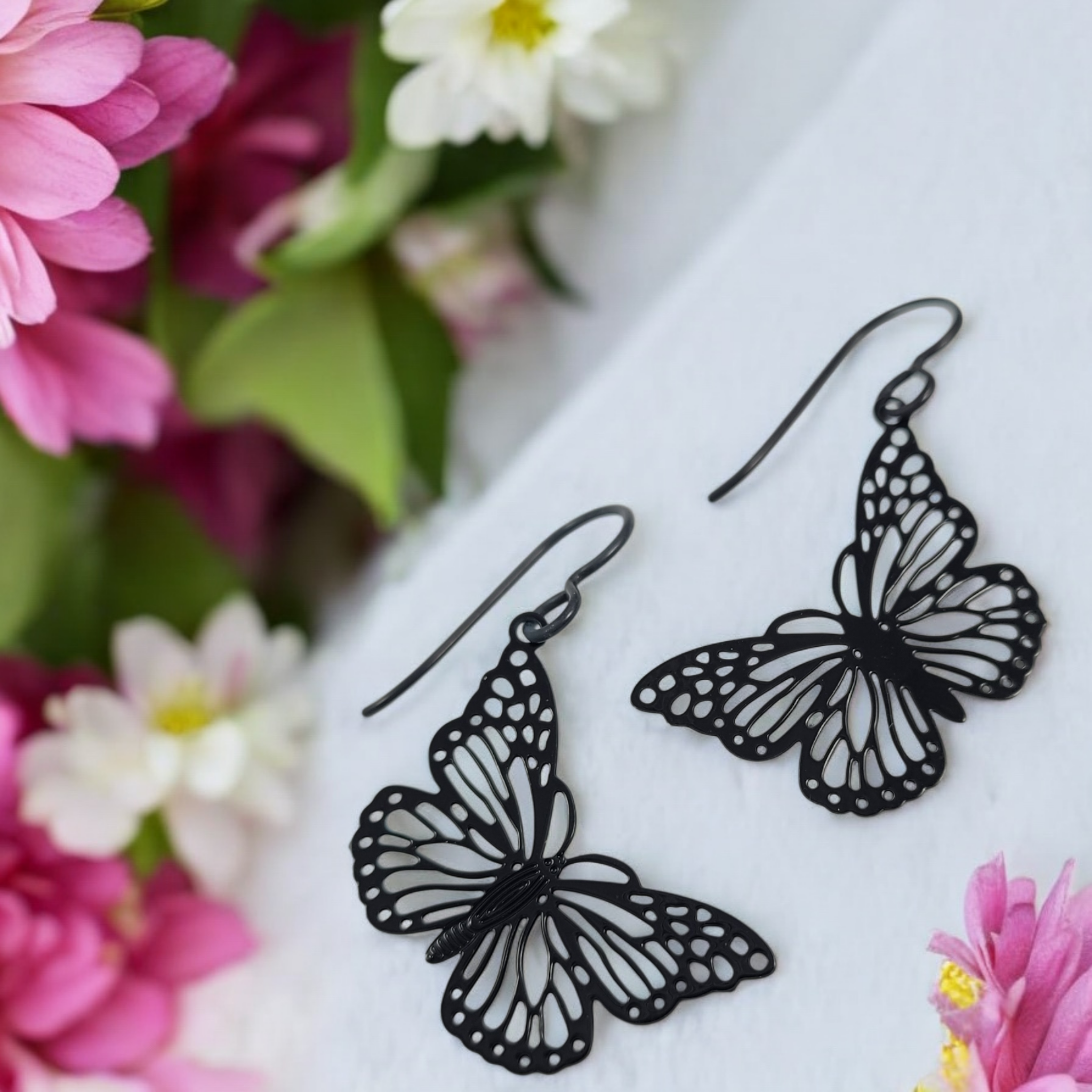 Découvre nos ravissantes boucles d'oreilles papillon noir – le mélange parfait de fantaisie et d'élégance pour celles qui chérissent un style unique mais privilégient le confort en raison de leurs oreilles sensibles.