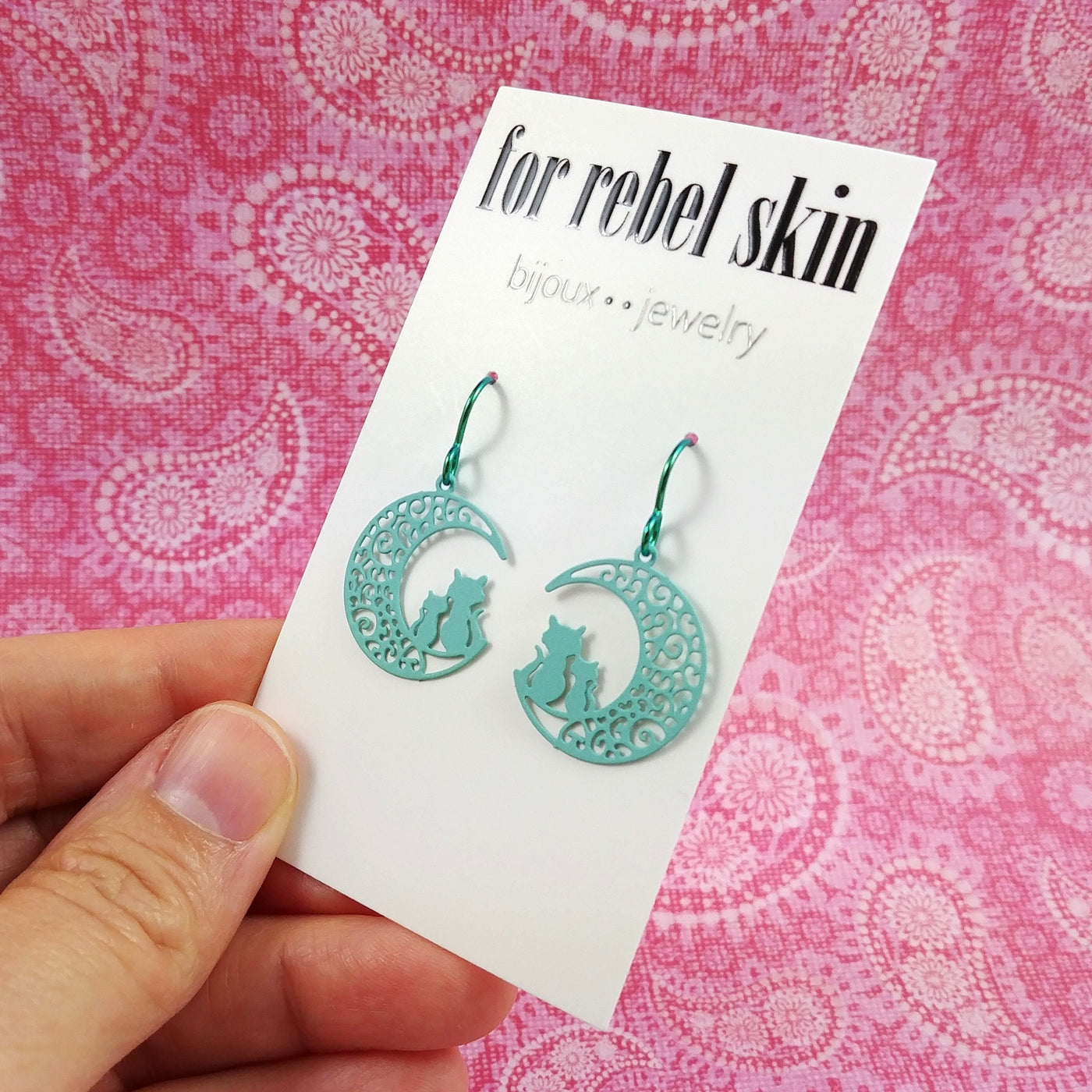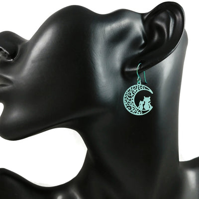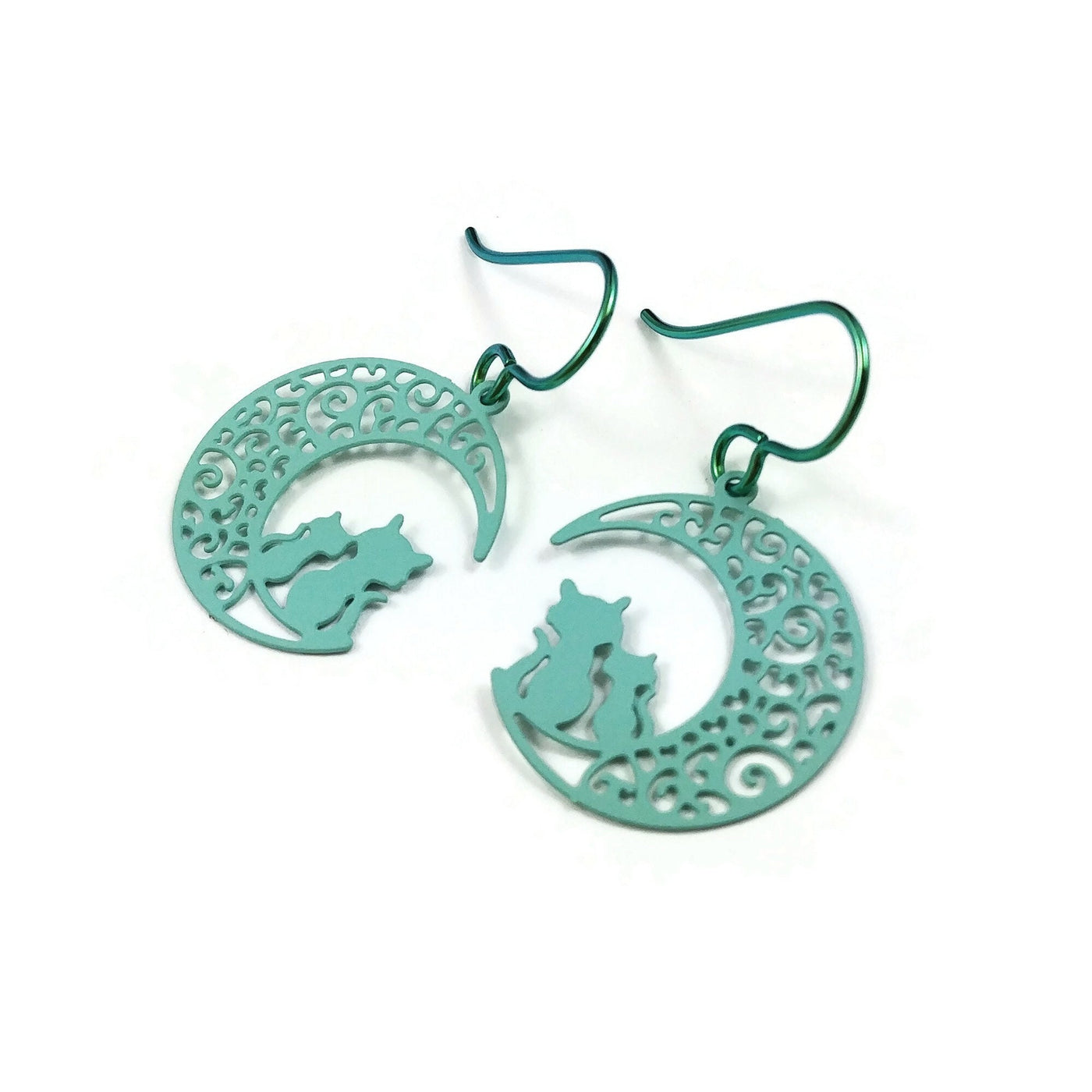 Boucles d'oreille silhouette de chats et lune - Niobium et inox aqua