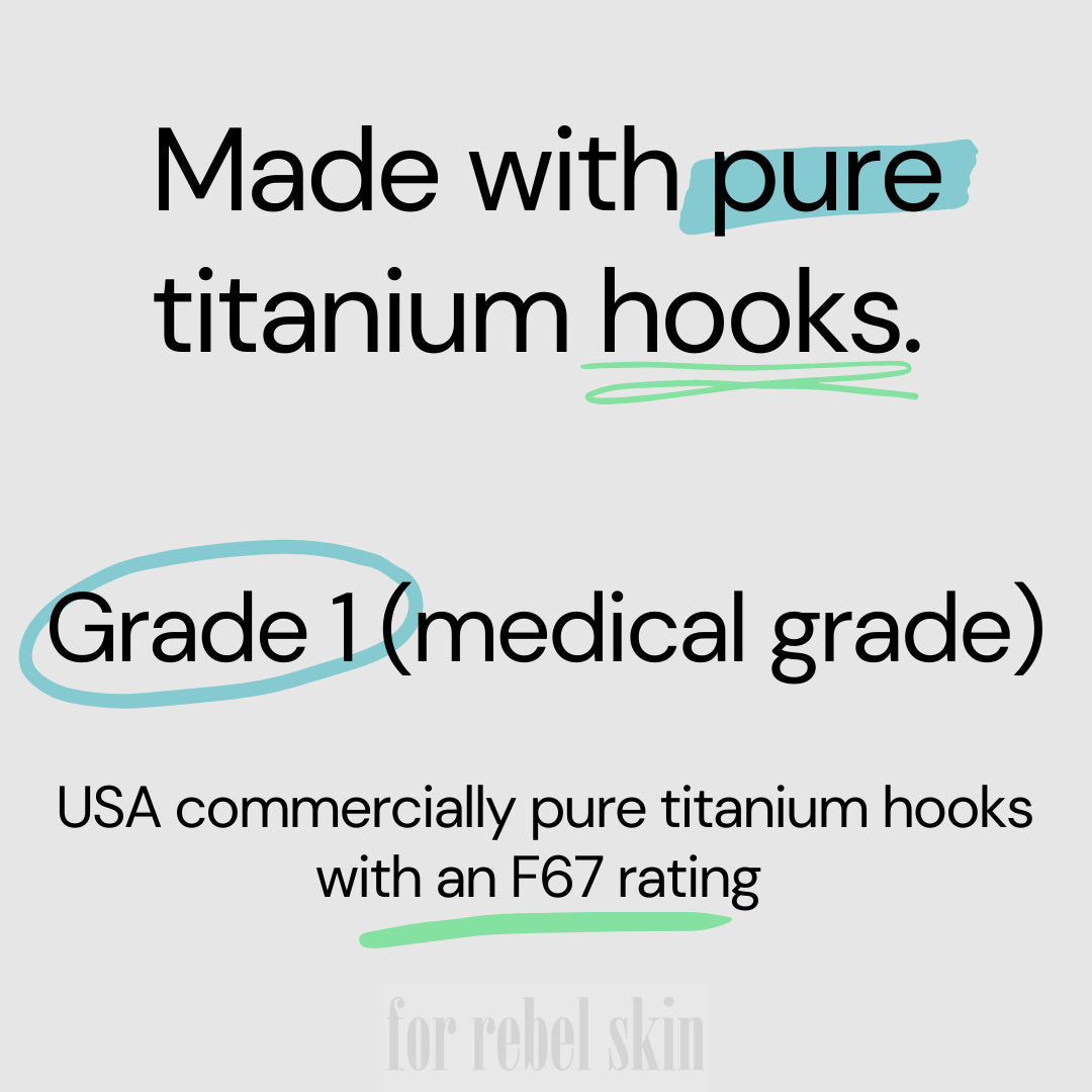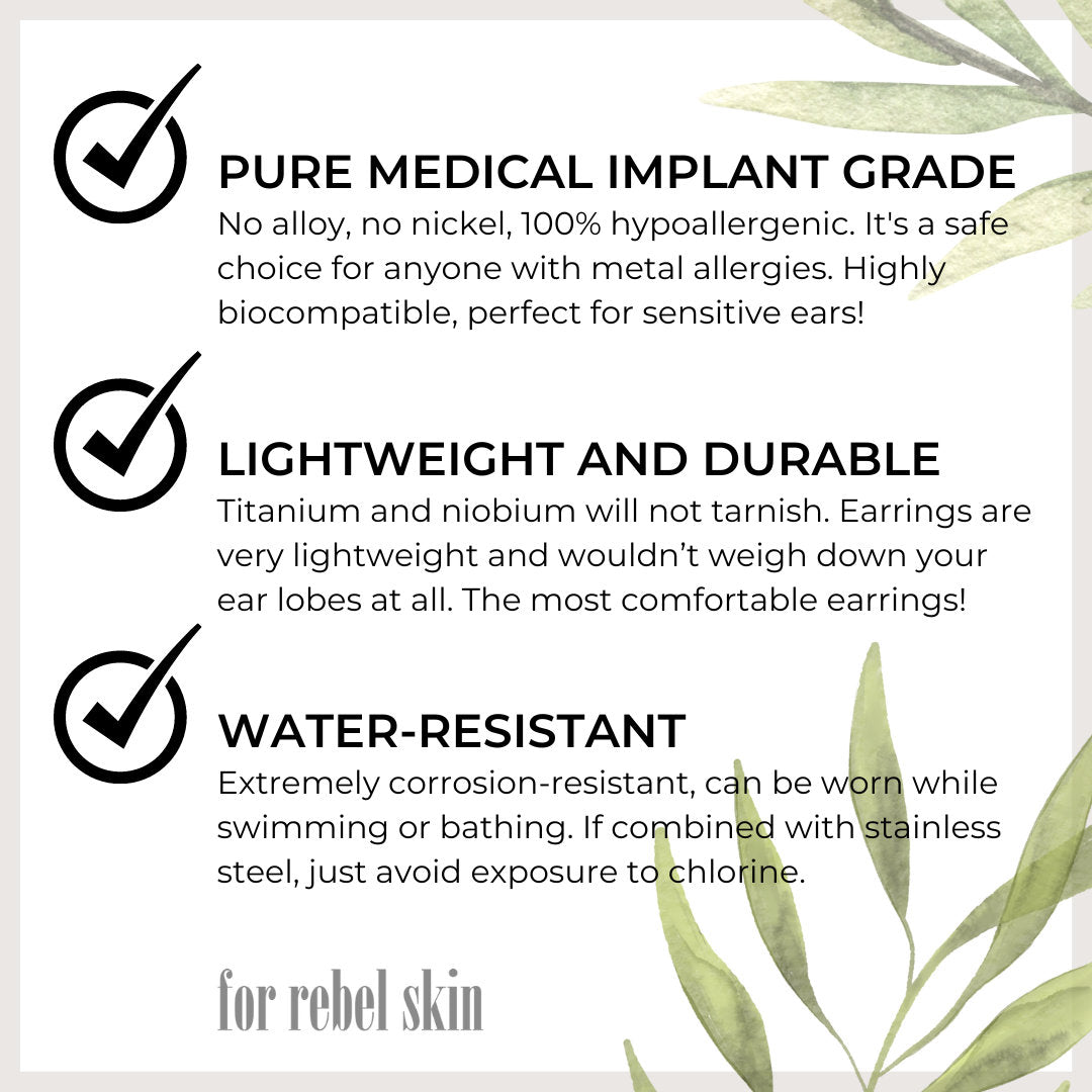 Montées sur des anneaux en titane 100% pure, hypoallergénique. Les pendentifs en acier inoxydable ne terniront pas au contact de la peau.