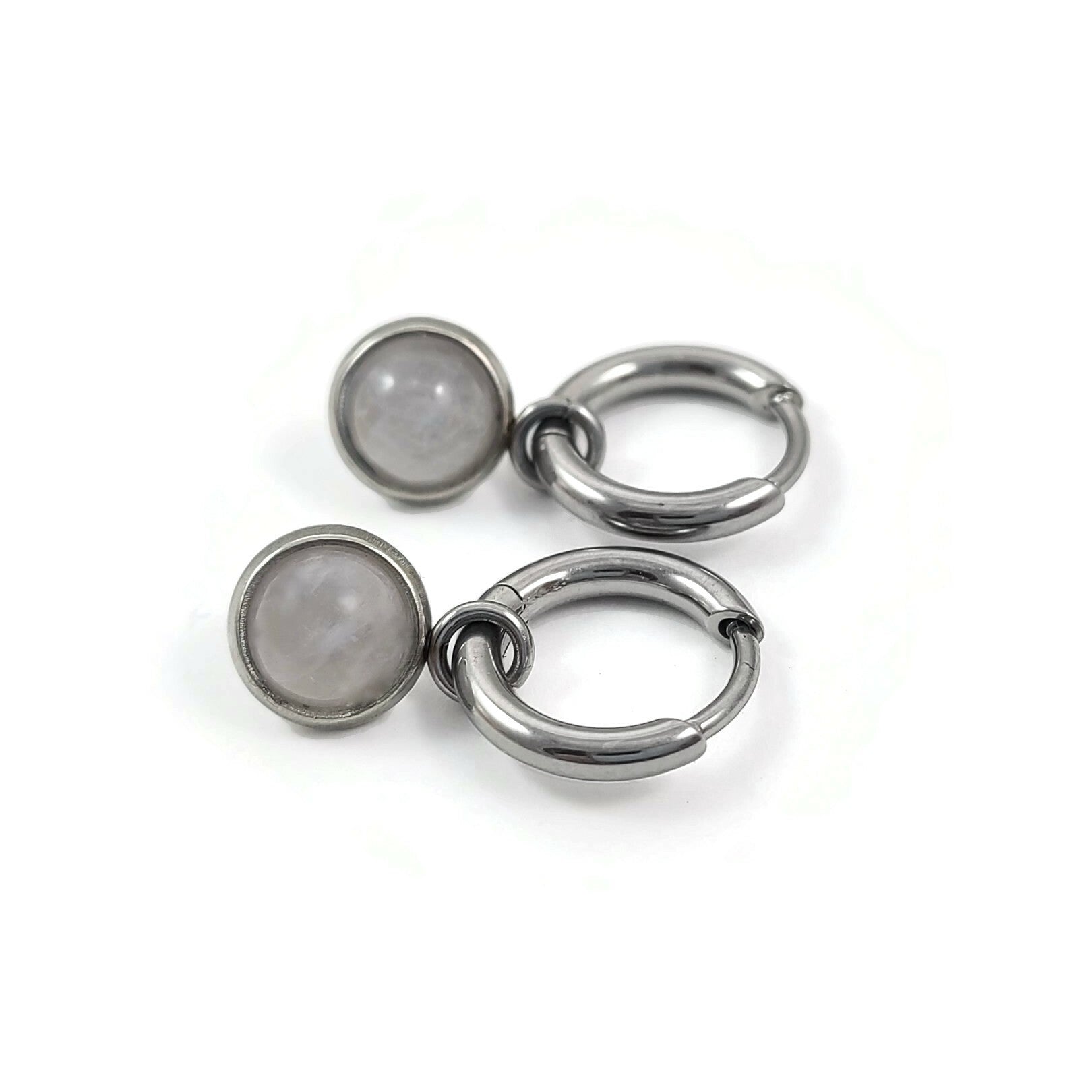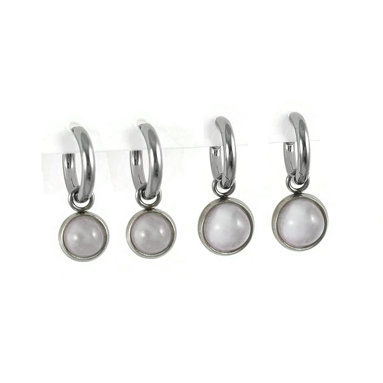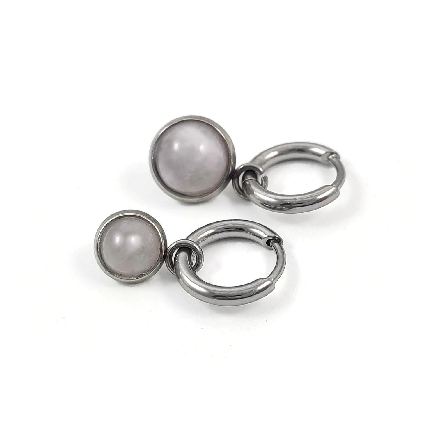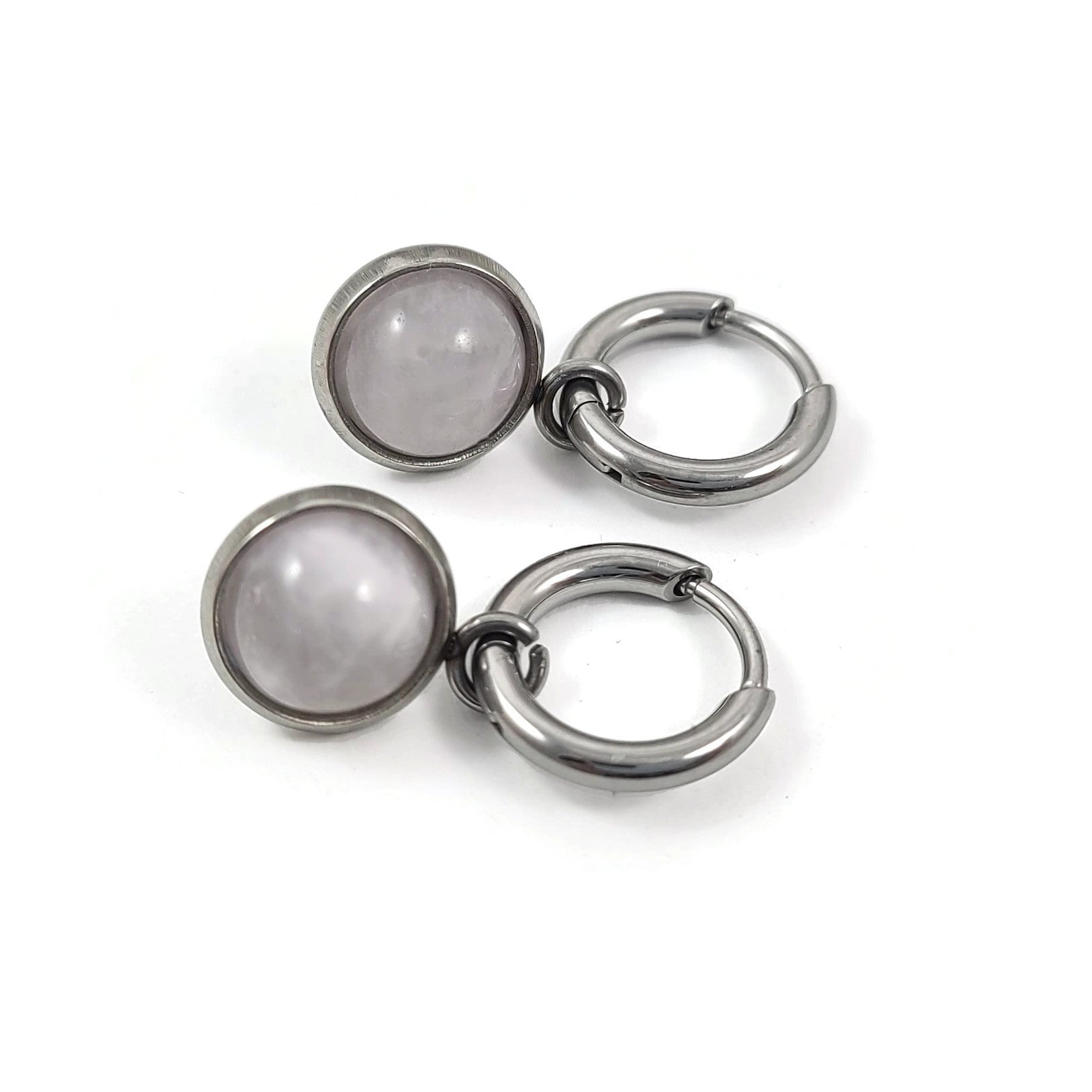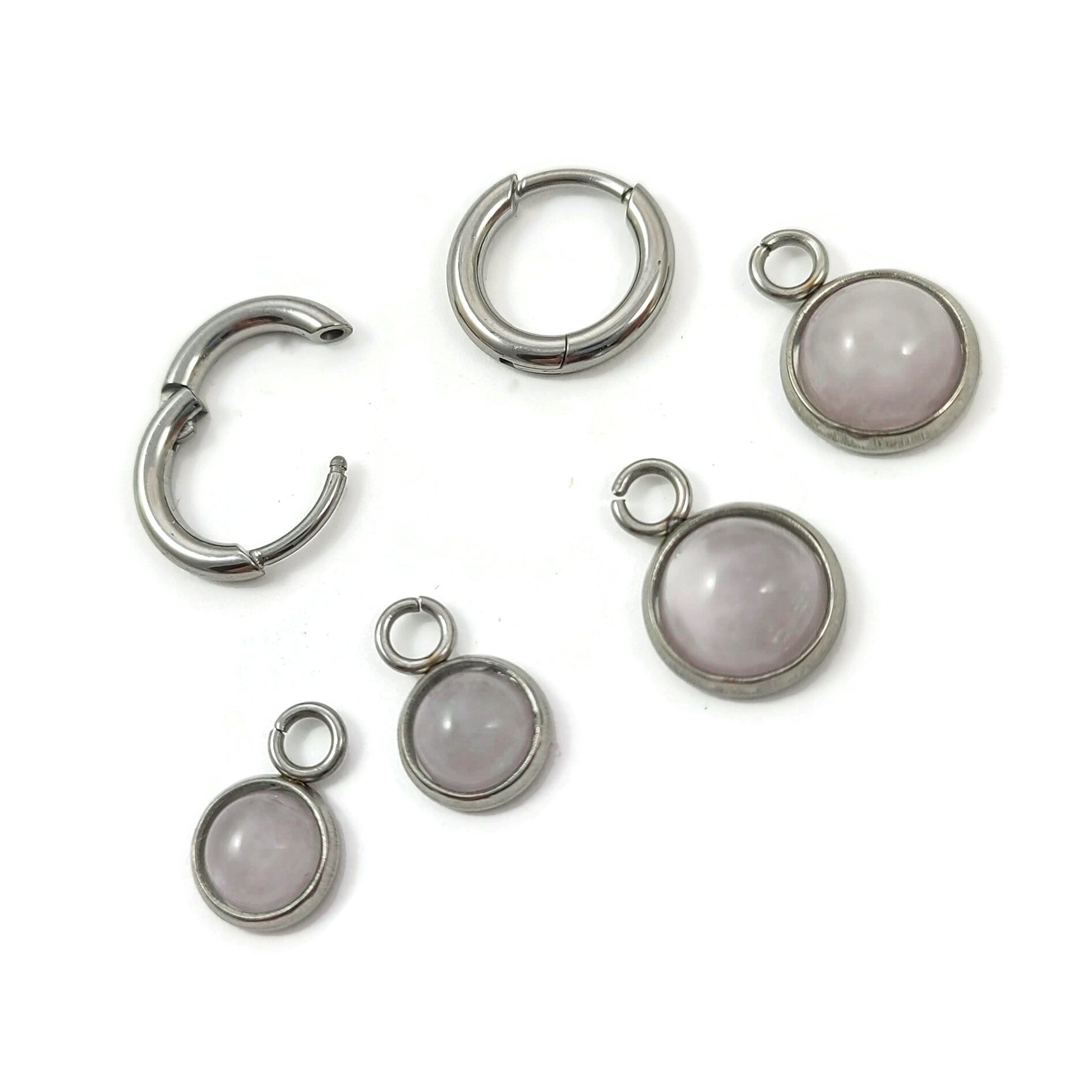 Boucles d'oreilles créoles en titane naturel pur, avec de jolies breloques quartz rose en acier inoxydable. Vendu par paire.