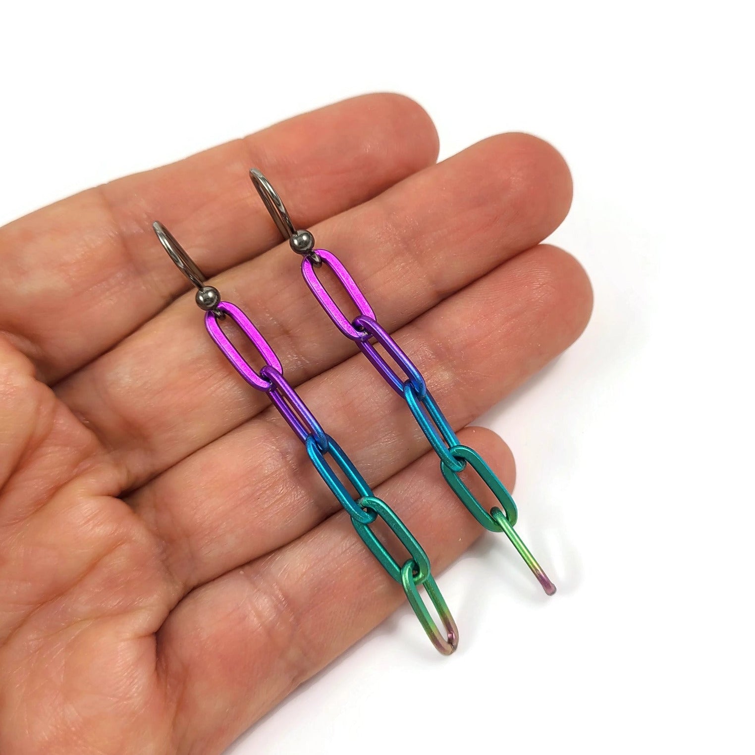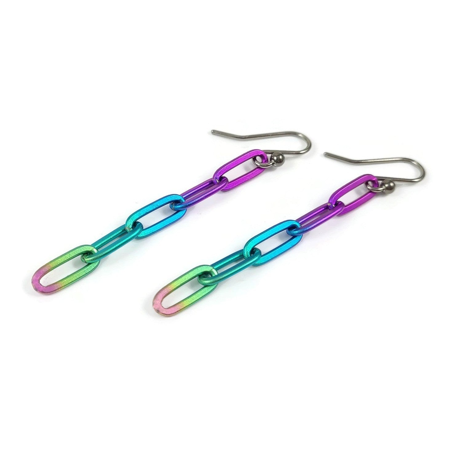 Introducing our Rainbow Paperclip Titanium Earrings - the perfect accessory for women allergic to traditional jewelry who want to make a style statement! Crafted from high-quality pure titanium grade 2, these drop earrings are hypoallergenic and stylish.