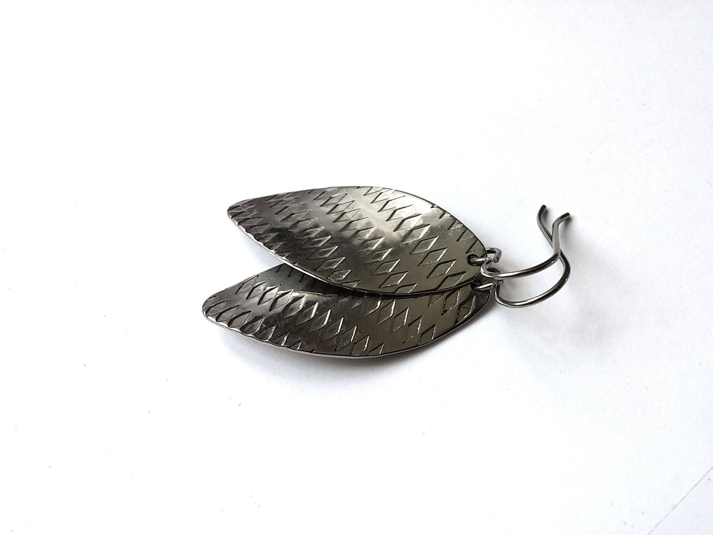 Stainless steel pendants measuring 37mm x 17mm (approx. 1 1/2 x 5/8"). Silicone earnuts included.