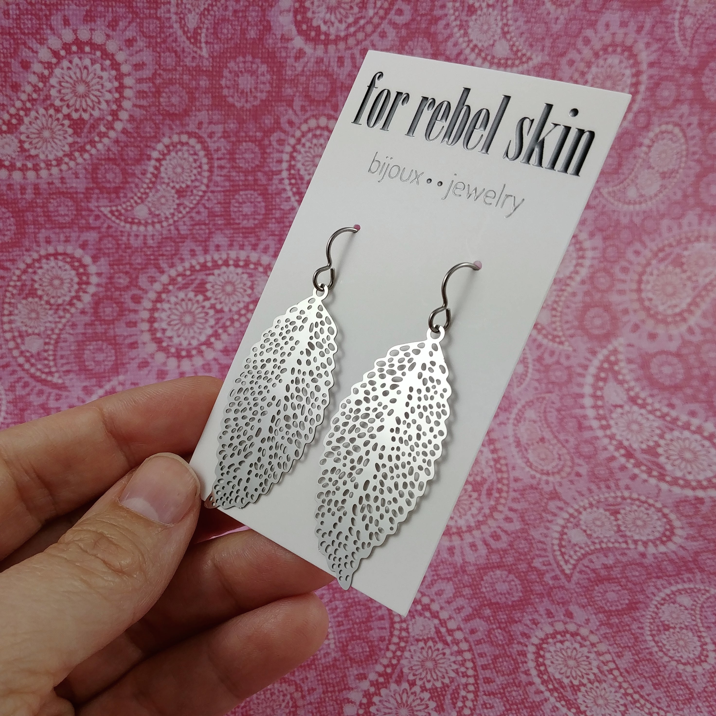 Stainless steel pendants measuring 46mm x 21mm (1 13/16 x 7/8"). Silicone earnuts included.